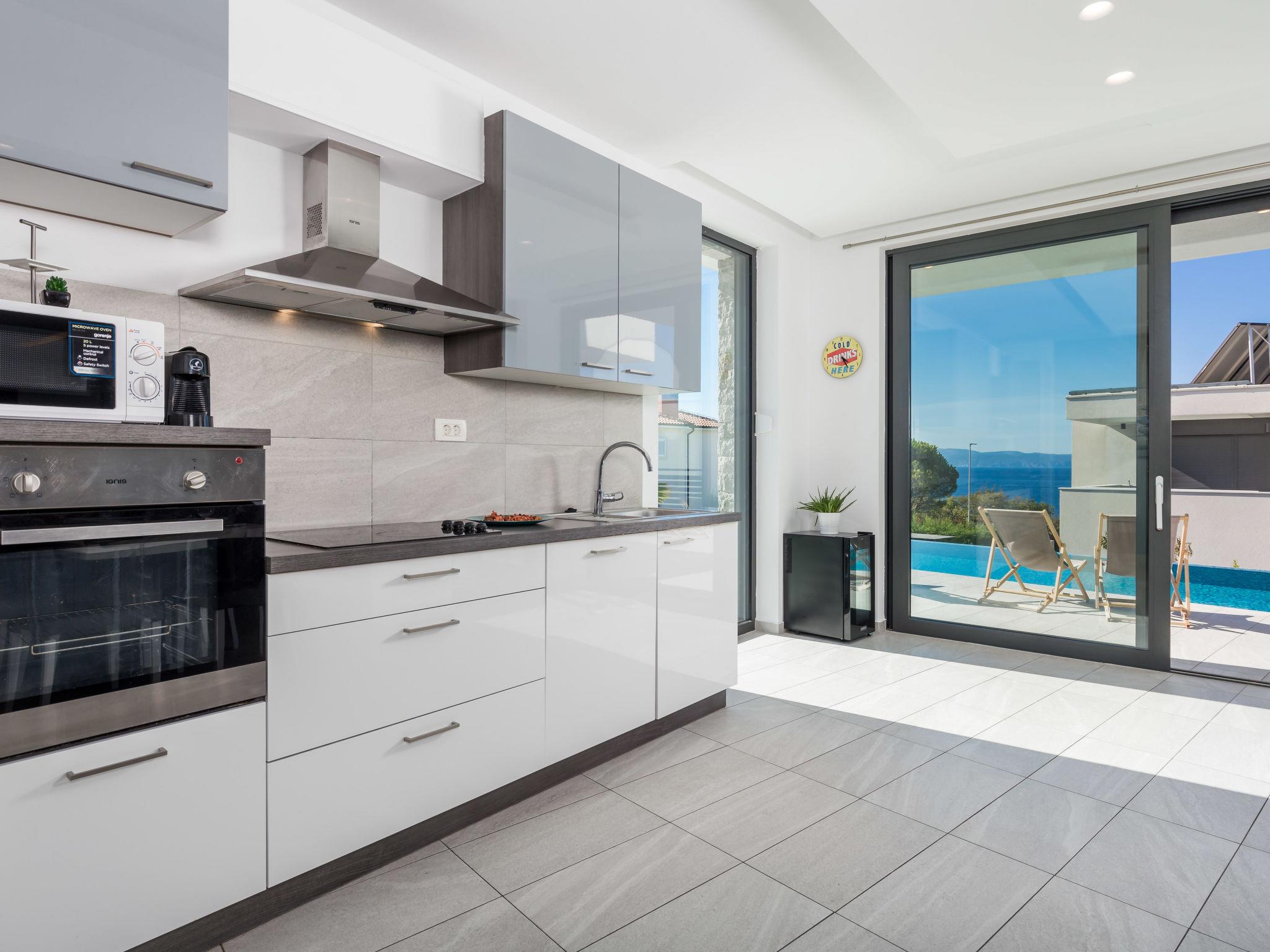 3-family house "Albi". In the district of Kostrena 5 km from the centre of Rijeka, in a quiet, sunny, elevated position, 250 m from the sea, 300 m from the beach, in the countryside. Private: swimming pool (25 m2, depth 150 cm, seasonal availability: 01.Jan. - 31.Dec.) with salt-electrolysis pool-cleaning system. Unconventional pool shape. Outdoor shower, barbecue. In the house: internet access, table tennis, table football. Parking at the house on the premises. Shop 1 km, supermarket 1.5 km, restaurant 250 m, bus stop 15 m, pebble beach, rocky beach 300 m. Groups of teenagers on request only. Please note: airfield 24 km from the property. By groups of young people double deposit is requested on arrival. Organizing a party is not allowed. Dog beach 800 m.