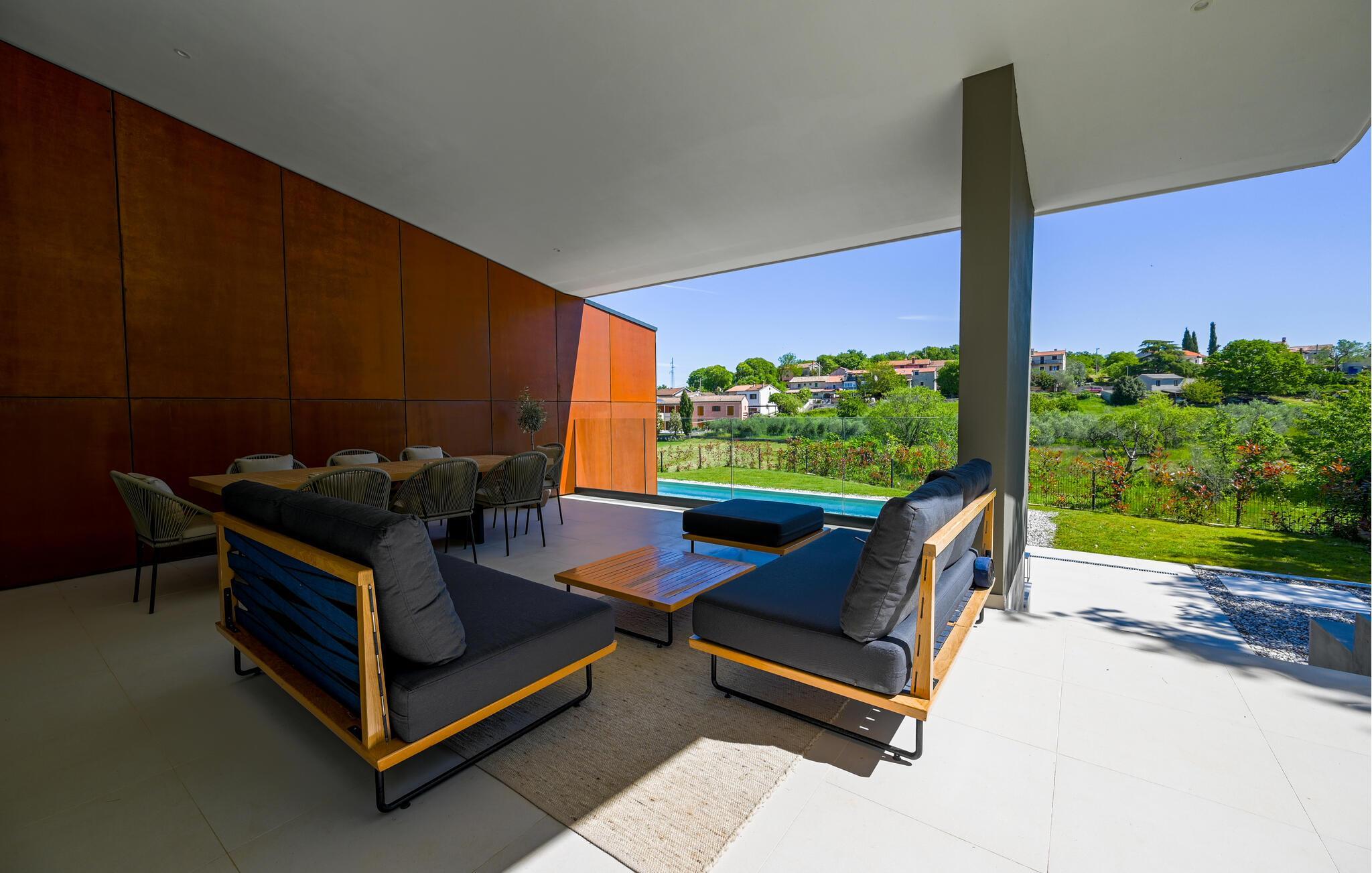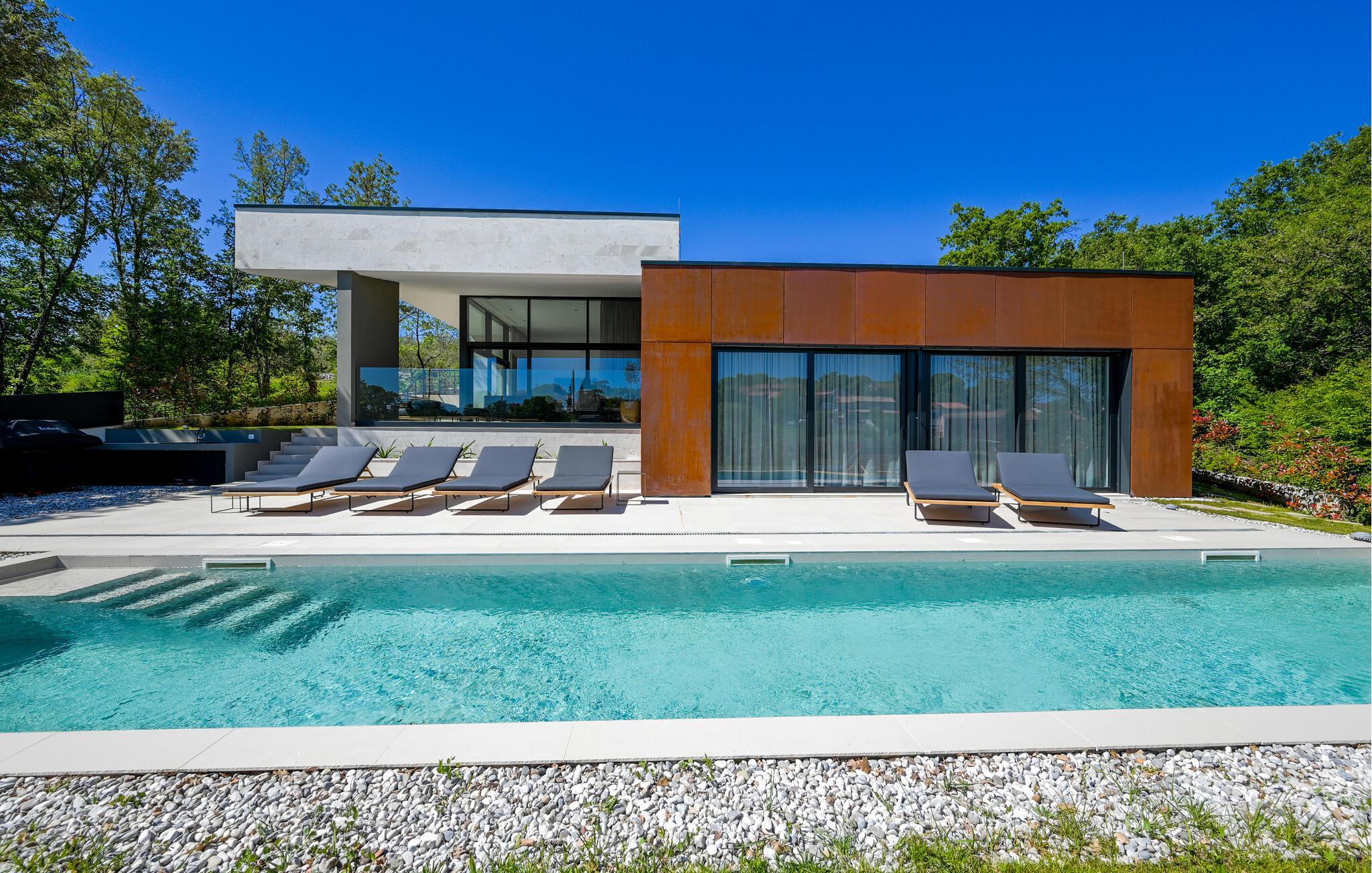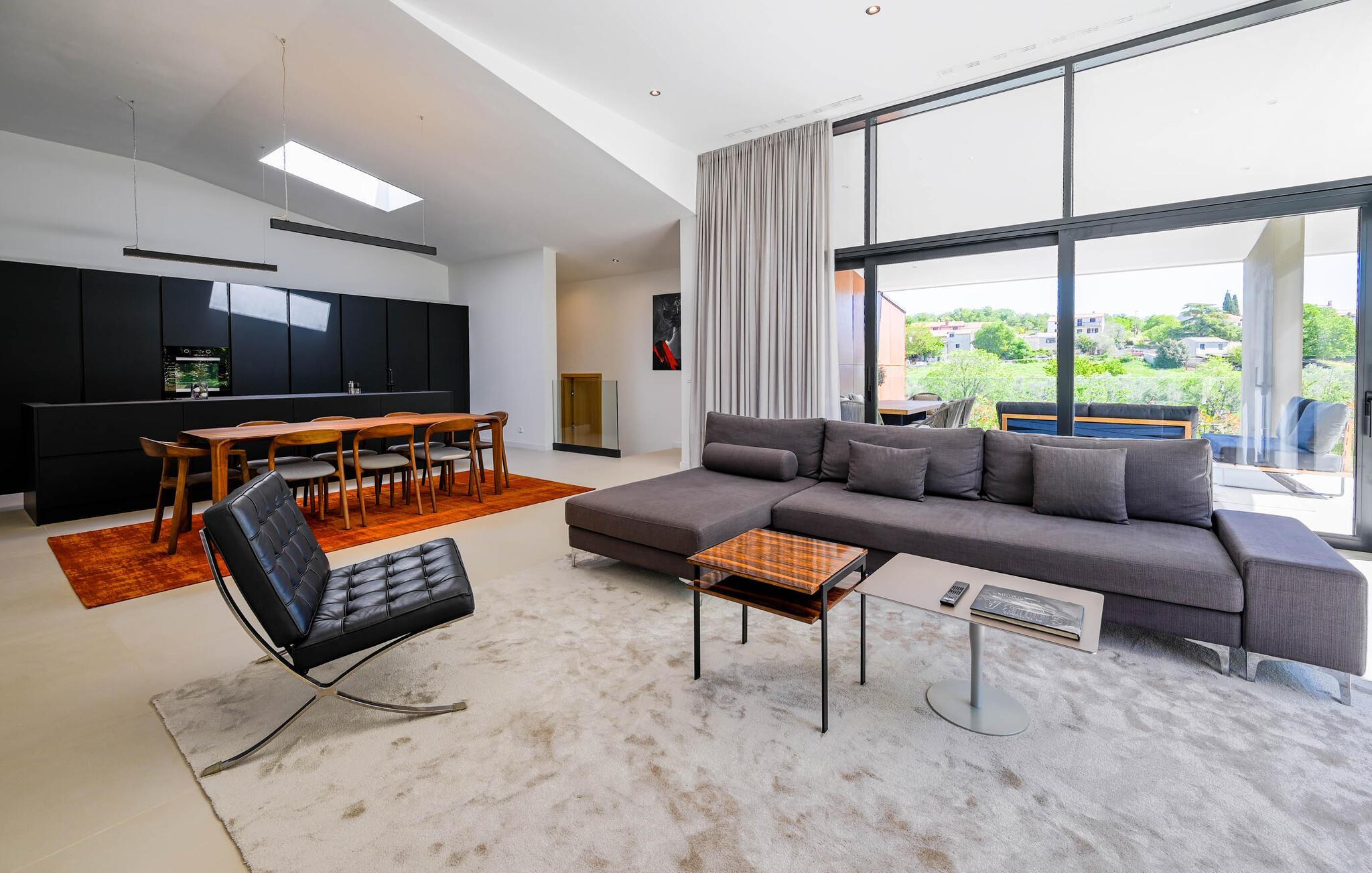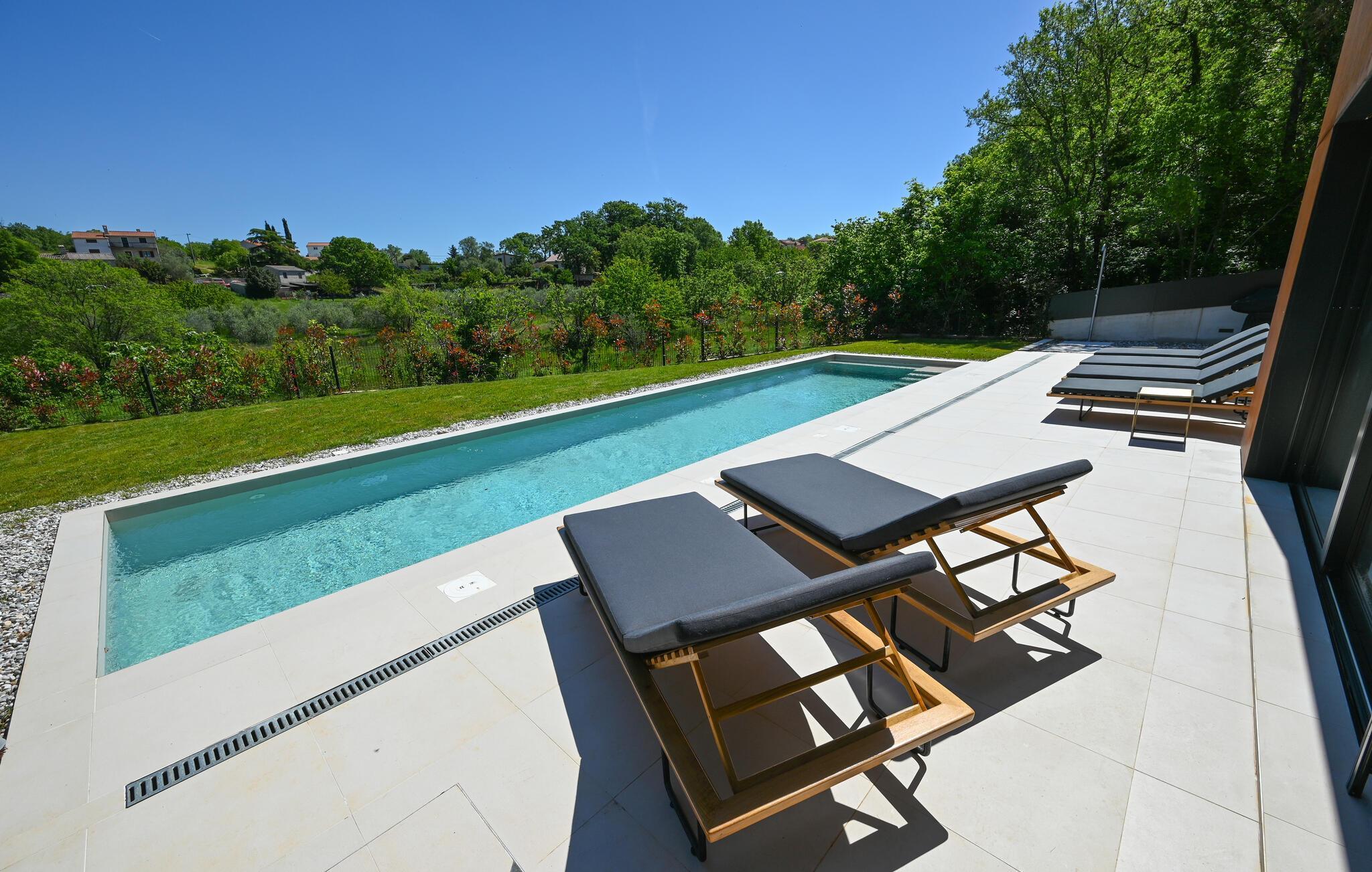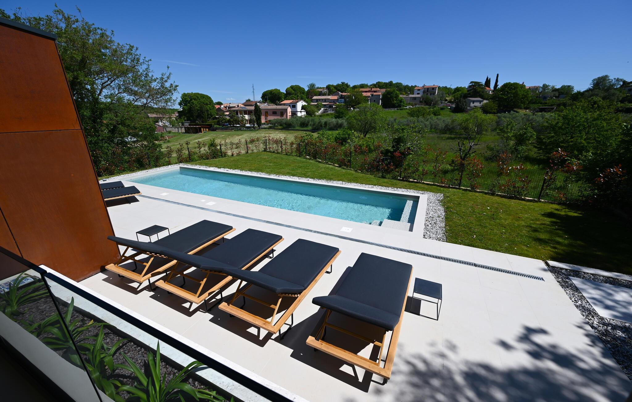 Udenfor venter der en vidunderlig oase af ro. Tag en forfriskende dukkert i den skønne pool, solbad på de stilfulde solsenge, eller nyd en middag i den overdækkede spiseplads med udsigt til det grønne. Haven med grill er ideel til hyggelige barbecues, mens den milde adriaterhavsbrise skaber den perfekte ramme for afslappede aftener.