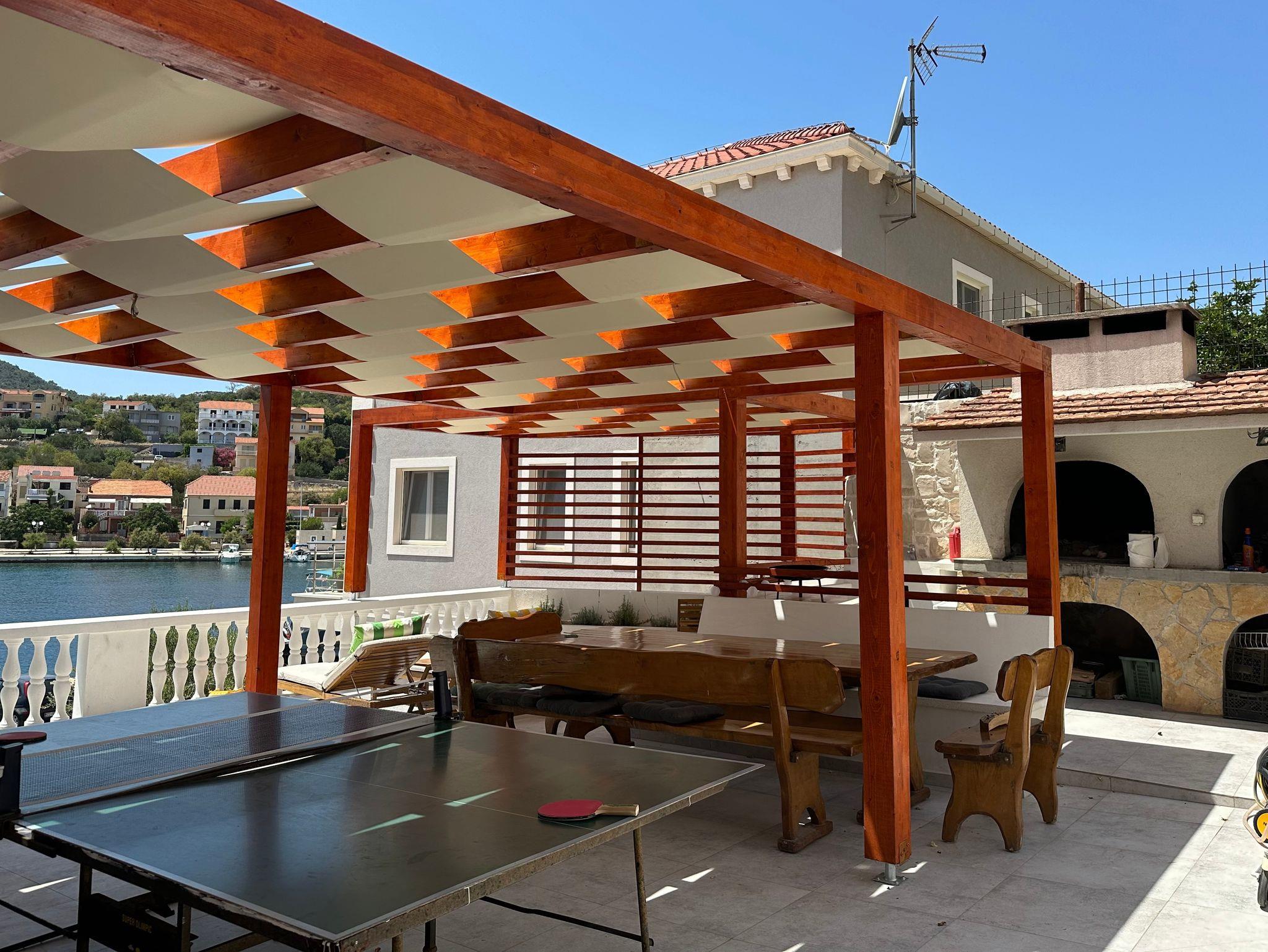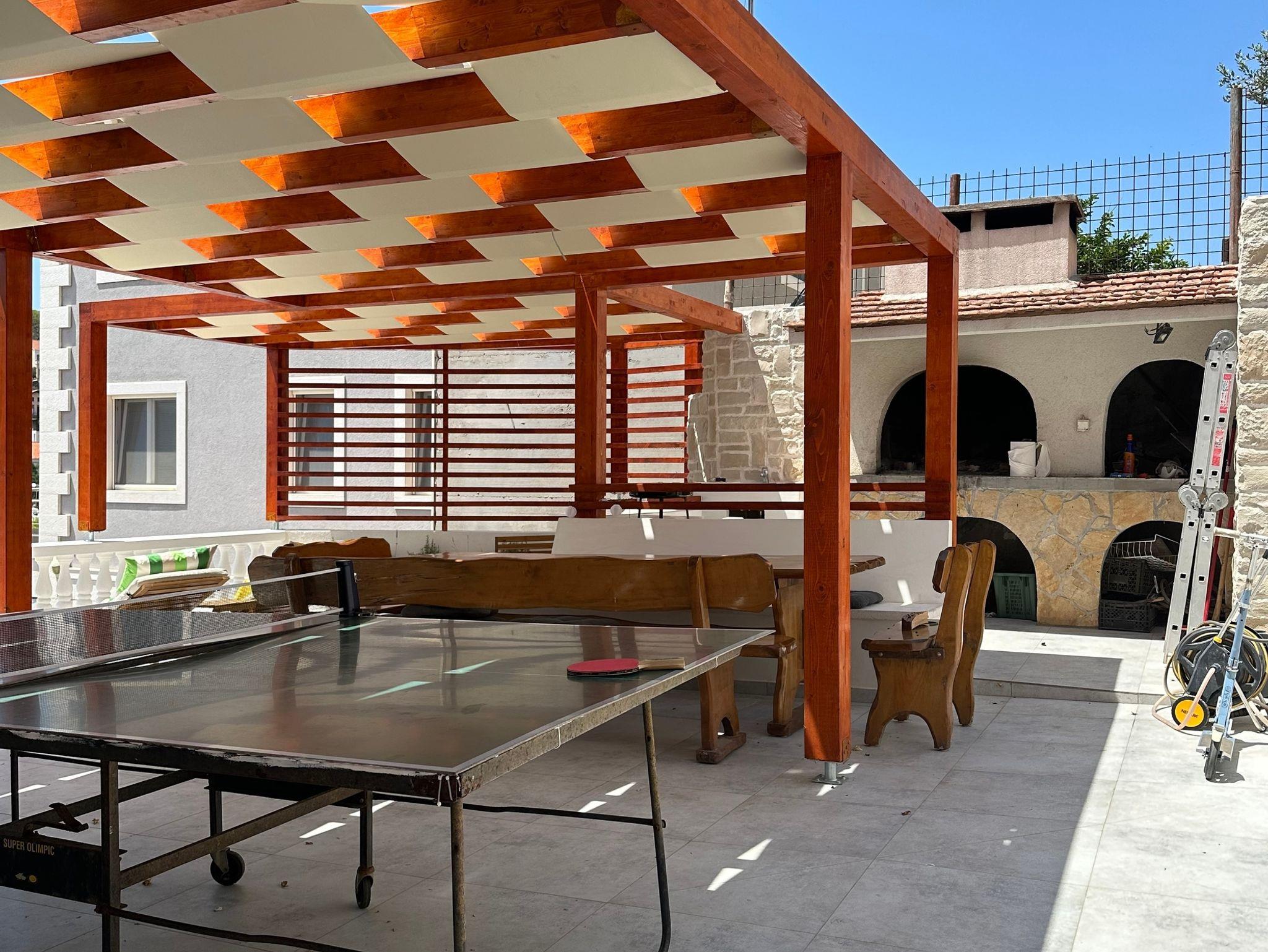 Umgebung des Objekts (Eingerichtet), Hof (400m2, Kinderbereich, Sitzbereich), Parkplatz (Anzahl der Parkplätze: 8, Entfernung vom Objekt: im Hof), Grill: gemeinsam, WiFi Internet, Wäschewaschen, Föhn, Bügeleisen, Bügelbrett, Kinderbett