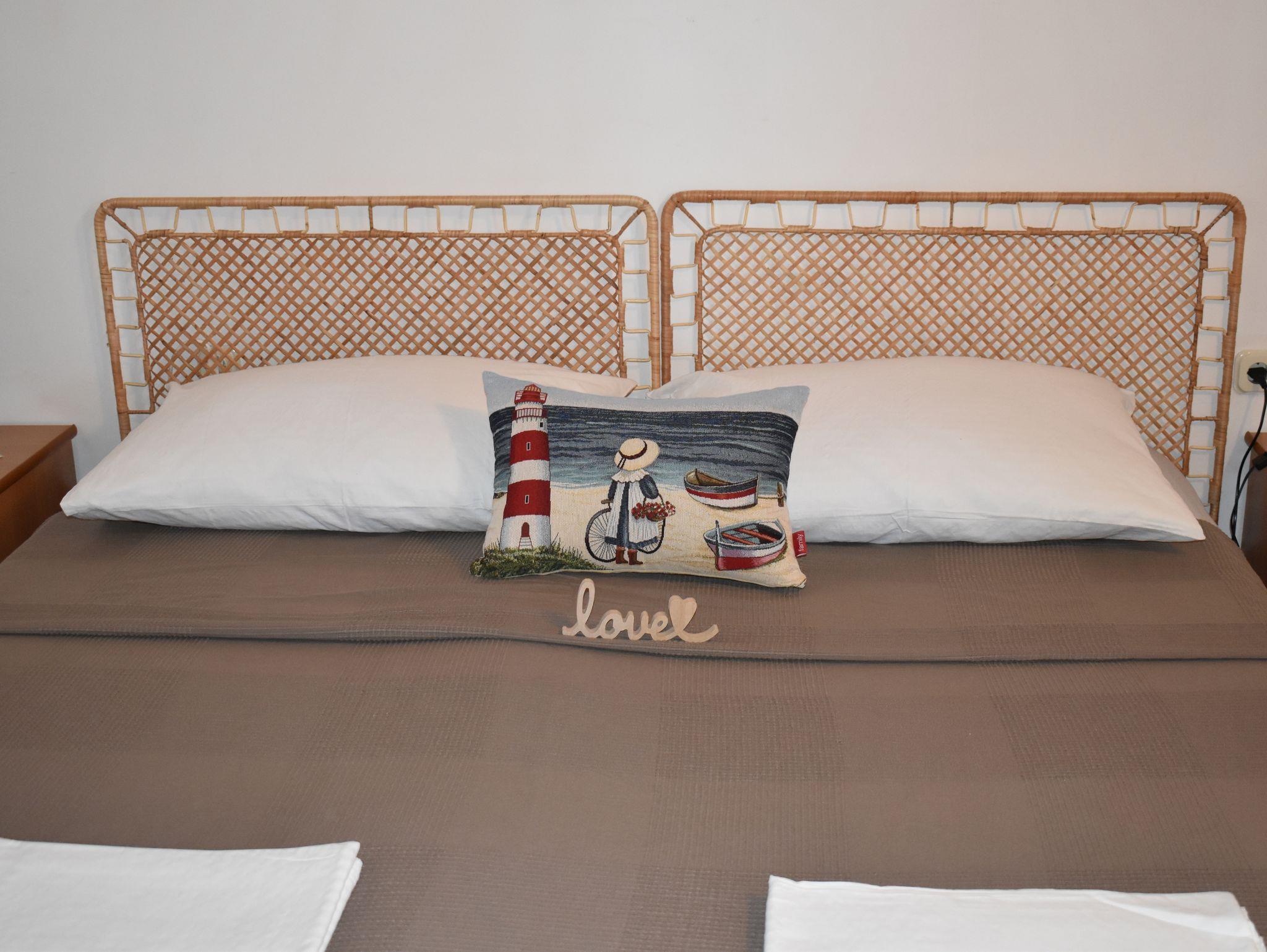 Ferienwohnung bietet Platz für 5 Gäste. Die Betten sind in Schlafzimmern, die es 2 gibt, innerhalb einer Gesamtfläche von 47m2, angeordnet. Die Gäste haben eine eigene Terrasse zur Verfügung, auf der sie in warmen Sommernächten genießen können. Das Apartment bietet Meerblick. Es ist erlaubt, Speisen auf dem Gemeinschafts-Grill vorzubereiten. IM PREIS INBEGRIFFEN: Kurtaxe, Endreinigung, Klimatisierung, Parkplatz, Internet, Kinderbett, Bügeleisen, Bügelbrett, Föhn, Sonnenschirm. Die Verfügbarkeit zusätzlicher Dienstleistungen in Ihrem reservierten Termin und die Preise derselben (falls nicht aufgeführt) müssen im Voraus überprüft werden. Zusätzliche Dienstleistungen die in der Zahlungsaufforderung nicht aufgeführt sind werden direkt beim Vermieter bezahlt, angenommen der Gast nutzt auch diese.