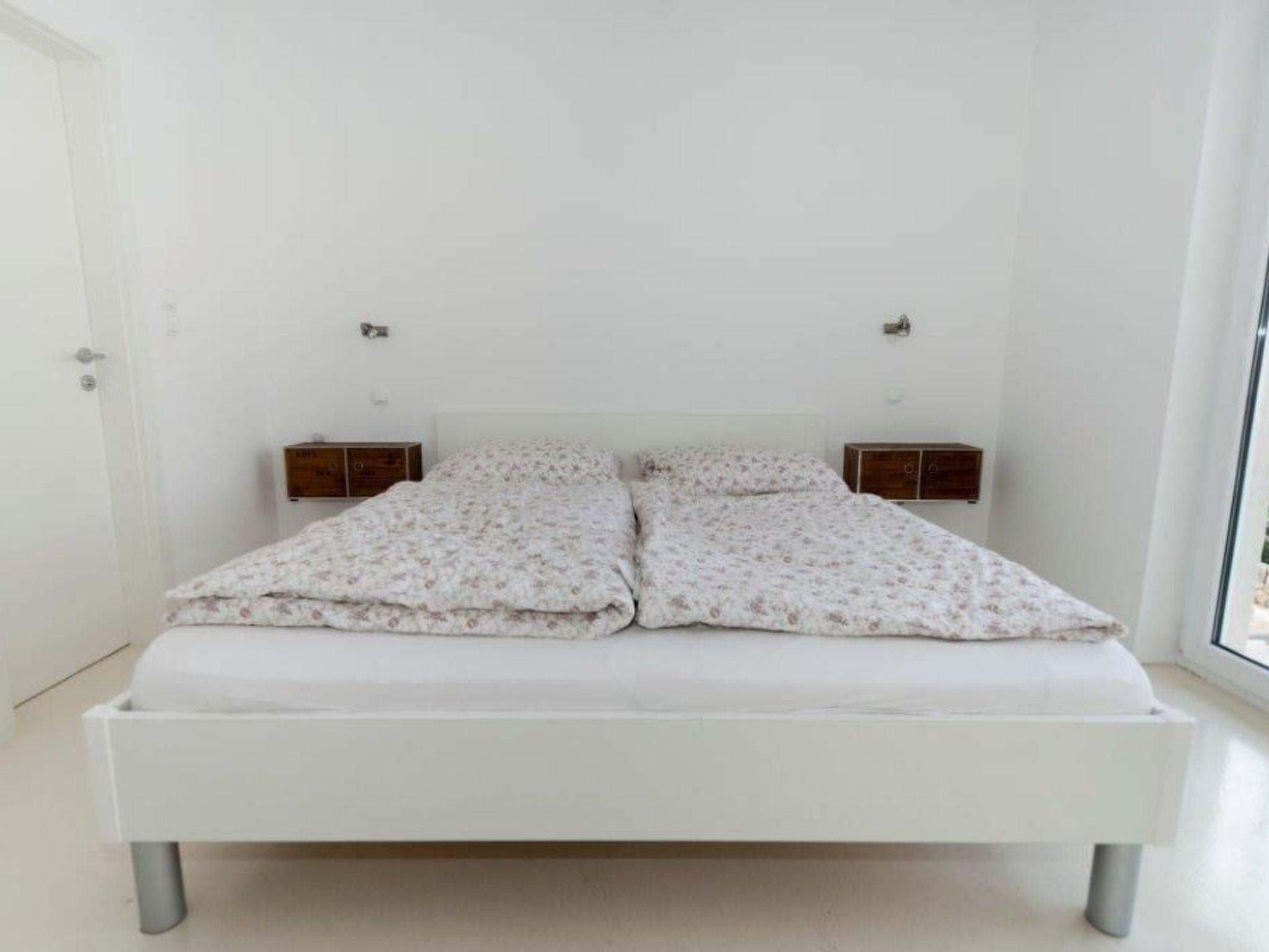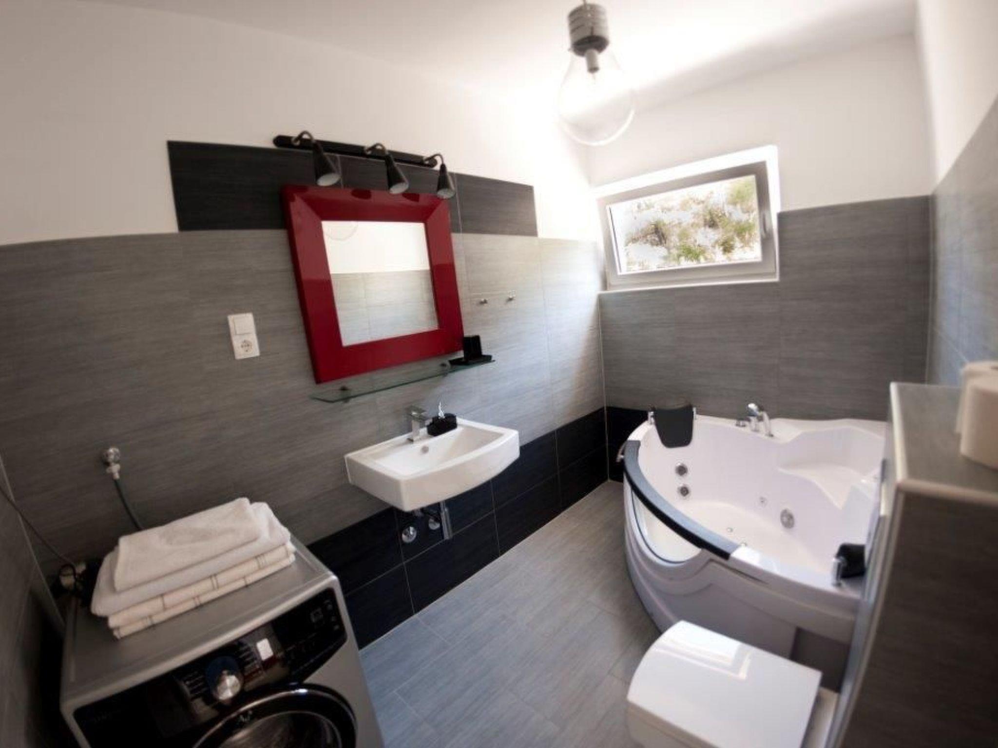 This generous 98m² holiday apartment with air-conditioning (cool/warm) throughout occupies the whole top floor of the villa. It consists of a living and dining room flooded with daylight, with an integrated, open, built-in kitchen, two bedrooms and two very modern bathrooms. The living room has a comfortable sofa and two stylish designer armchairs, a glass coffee table, a flatscreen TV mounted to the wall (cable and satellite channels, USB port, DVD player), a stereo system and an open fireplace. Plenty of firewood is provided. There is an adjoining dining space with a dining table and four chairs. Right next door there is a fully-equipped, white and glossy kitchen, with only the latest appliances, including a dishwasher, ceramic hob with an elegant stainless steel extractor fan, electric oven, fridge with freezer compartment, kettle, toaster and coffee machine. One of the two bedrooms has a double bed measuring 180 x 200cm, while the other has a double bed measuring 180 x 200cm. Both bedrooms have bedside tables with reading lamps and cupboards with ample storage space for your clothing and luggage. From the beds you can admire the extensive view over the bay and the sea. The sofa in the living room can be converted into an additional bed for another person. Of the two bathrooms, one has a spacious shower cubicle and one has a corner bath and shower attachment, and they both have a washbasin with a wall mirror, and a toilet. A washing machine and free and reliable wireless Internet access are available. If you arrive by car then there is a secure parking space right in front of the villa.