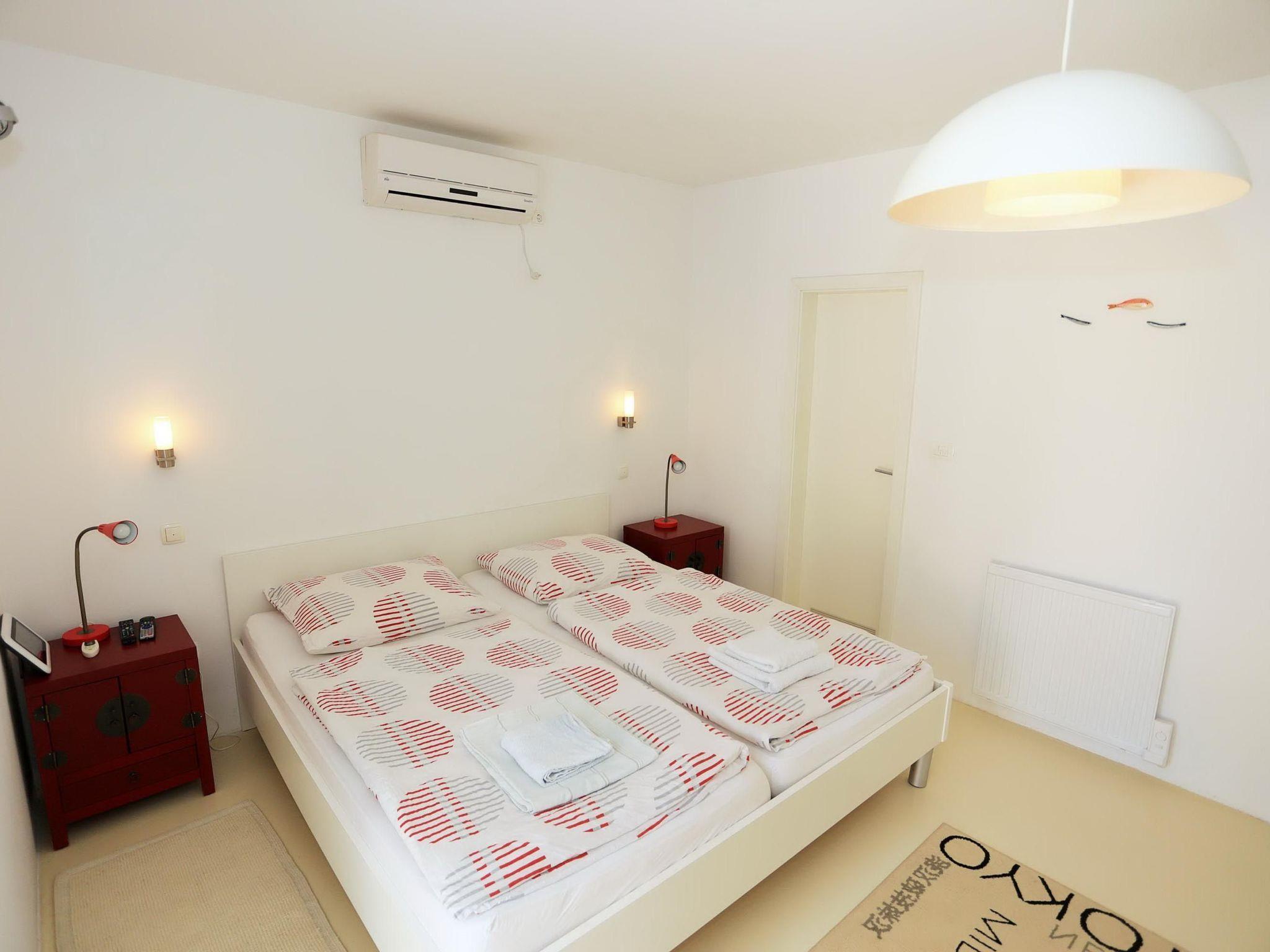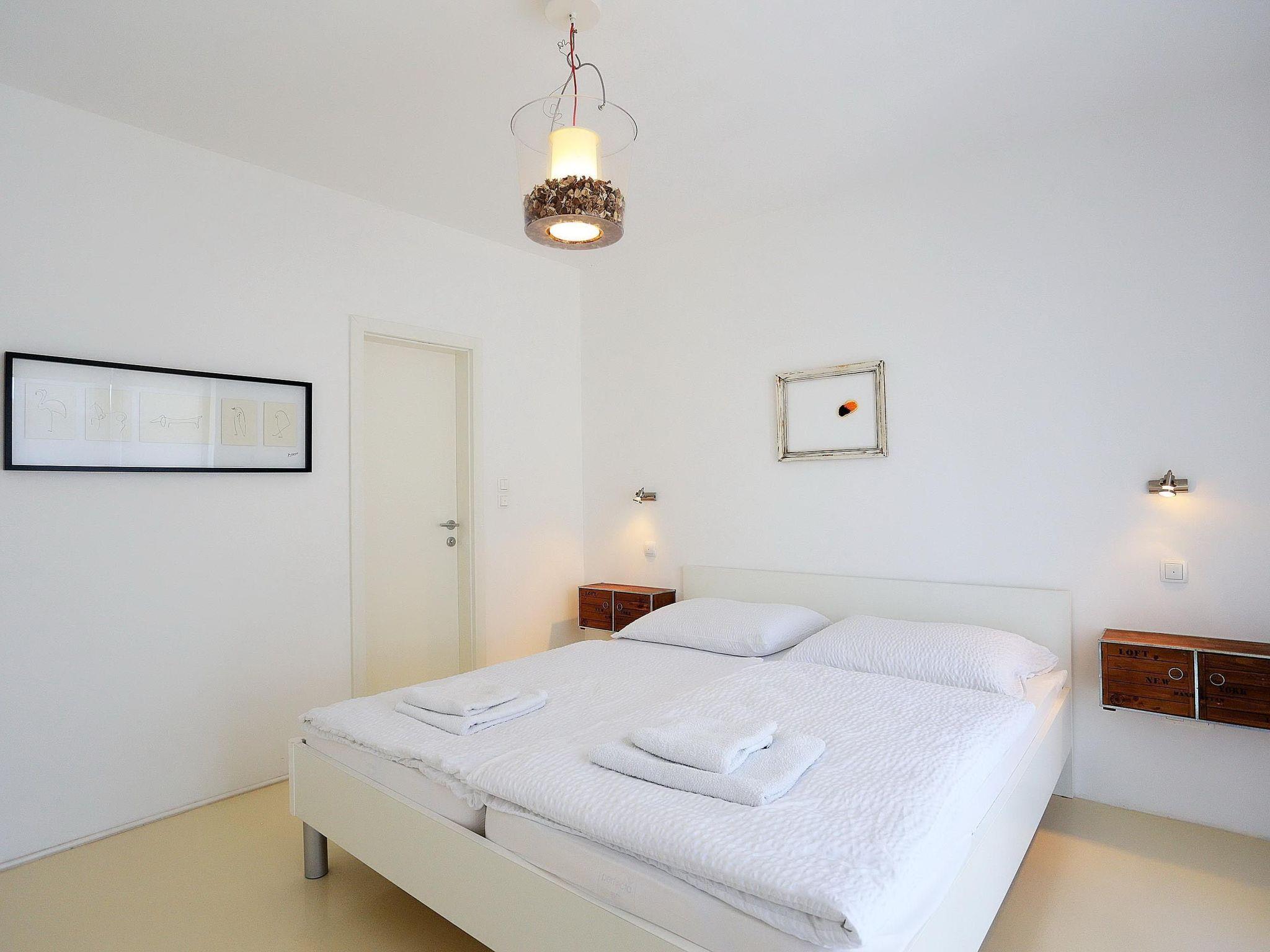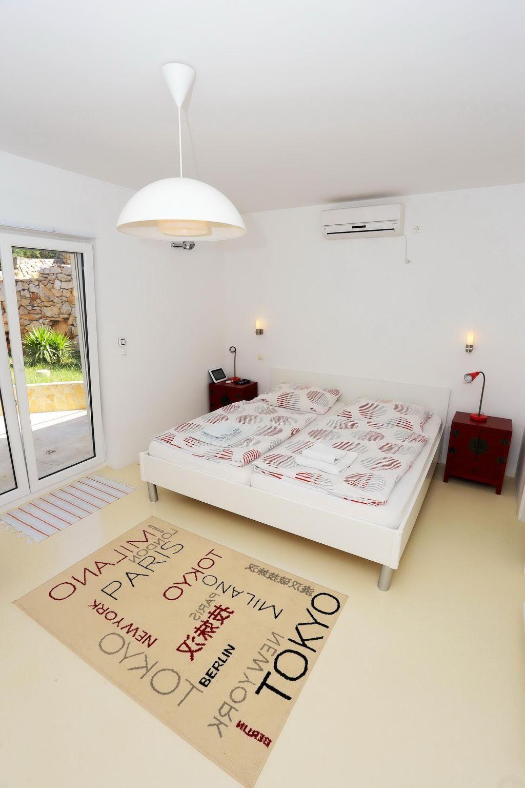 This spacious 140m² holiday apartment occupies the entire ground floor of the villa. It has a living and dining room flooded with daylight, with an integrated, open, built-in kitchen, as well as two bedrooms, two very modern bathrooms and a separate guest toilet. The living room has a comfortable white leather sofa and matching armchairs, an elegant solid wood coffee table, a wide flatscreen TV mounted to the wall with cable and satellite channels and a USB port, a radio and an open fireplace. Plenty of firewood is provided. From the living room you go through to the dining space with an elegant stainless steel dining table and four chairs, separated from the white and glossy kitchen by a stylish breakfast bar. The fully-equipped kitchen has only the latest appliances, including a ceramic hob with a tube-shaped, stainless steel extractor fan, an electric oven, fridge with freezer compartment, kettle and toaster. One of the two bedrooms has a double bed measuring 220 x 200cm, while the other has a double bed measuring 180 x 210cm. Both bedrooms have bedside tables with reading lamps and cupboards with ample storage space for your clothing and luggage. You can admire the extensive view over the bay and sea from the beds. The sofa in the living room can be converted into an additional single bed. Of the two bathrooms, one has a spacious shower cubicle and one has a bath with a shower attachment. Both also have a wide washbasin with a wall mirror, and a toilet. A washing machine is available. A supplementary bed can be provided on request and the reliable wireless Internet connection in the apartment can be used free of charge.