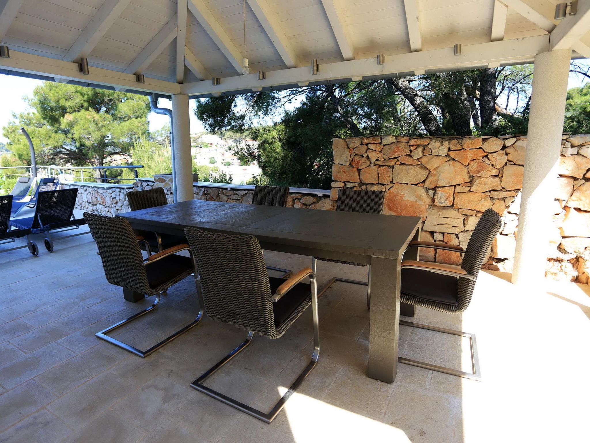 Big glass sliding doors in the living room open directly onto the private sun terrace and the private 28m² pool, which is surrounded by sun loungers and parasols. Right next to it, on the spacious sun deck with a panoramic sea view and lounge furniture. The outdoor shower and a separate outdoor toilet provide additional convenience. If you arrive by car then there are two secure parking spaces right in front of the house.