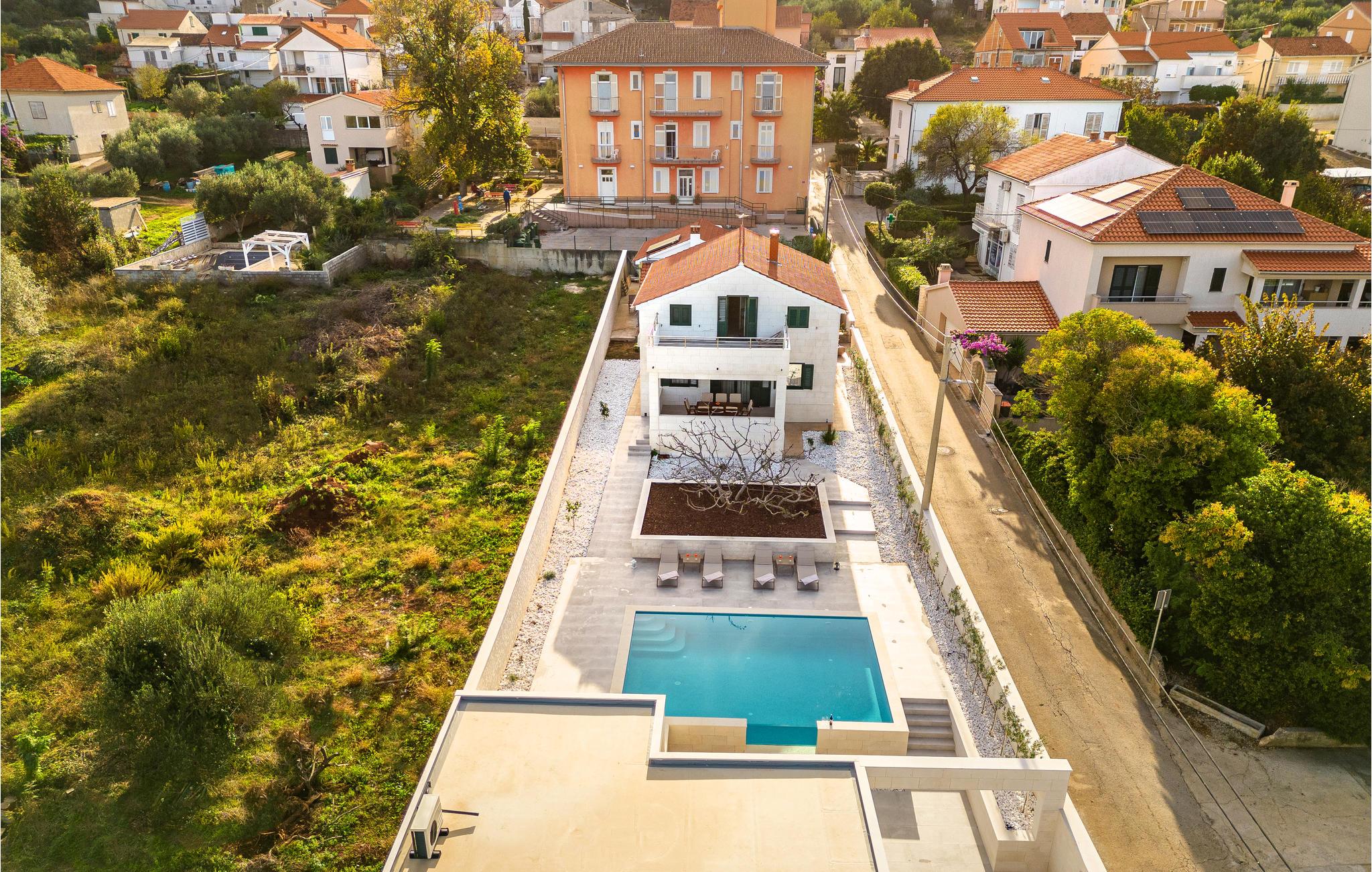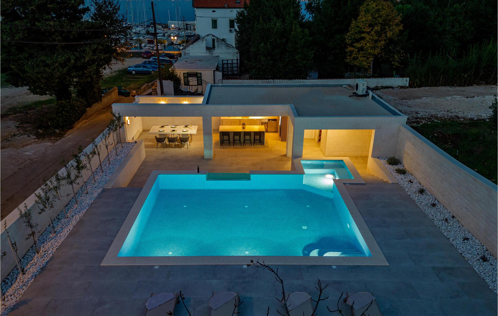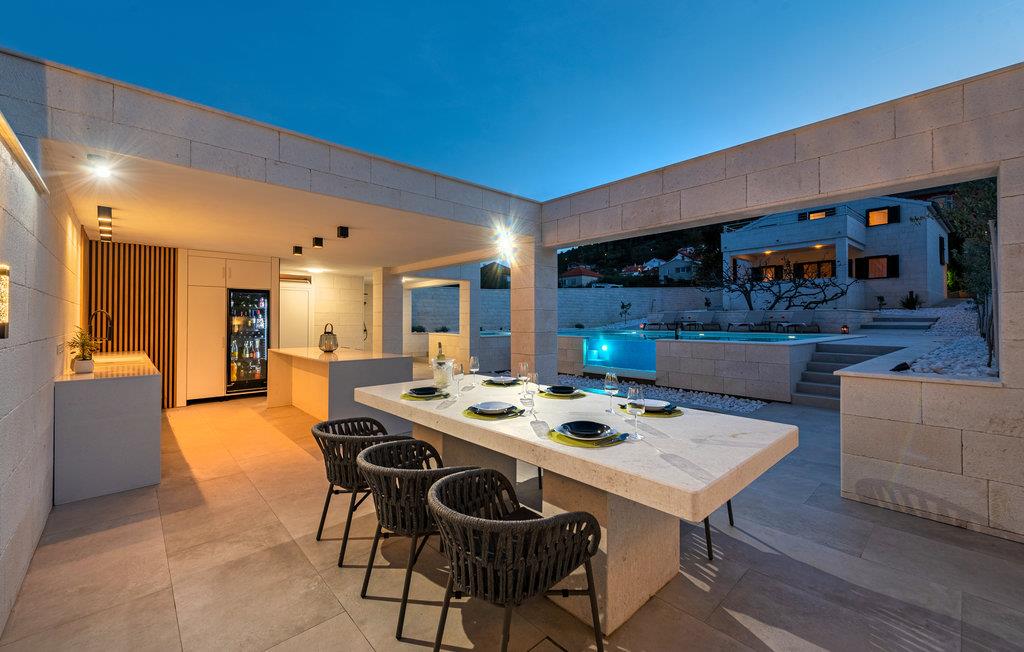 Tilbring en uforglemmelig ferie med jeres store familie eller gode venner i dette attraktive og komfortable feriehus. Her går drømme i opfyldelse, for indenfor byder huset på mange værelser, topfaciliteter og smagfuld indretning af høj kvalitet, hvor moderne æstetik og funktionalitet går op i en højere enhed. Den eksklusive feriebolig tilbyder dog mere end en indbydende atmosfære og et skønt opholdsrum. Når I træder udenfor, er der også en skøn swimmingpool. Om aftenen kan I tilberede jeres yndlingsretter i udekøkkenet og sammen smage på resultatet af jeres anstrengelser. På taget finder I endnu et højdepunkt, for her strækker en skøn tagterrasse sig over hele etagen, hvor I sammen kan slappe af i spabadet og havemøblerne og se ud over havet. Om natten kan I beundre den magiske stjernehimmel. Rejser I med jeres store familie eller en anden familie, kan nabohuset også lejes.