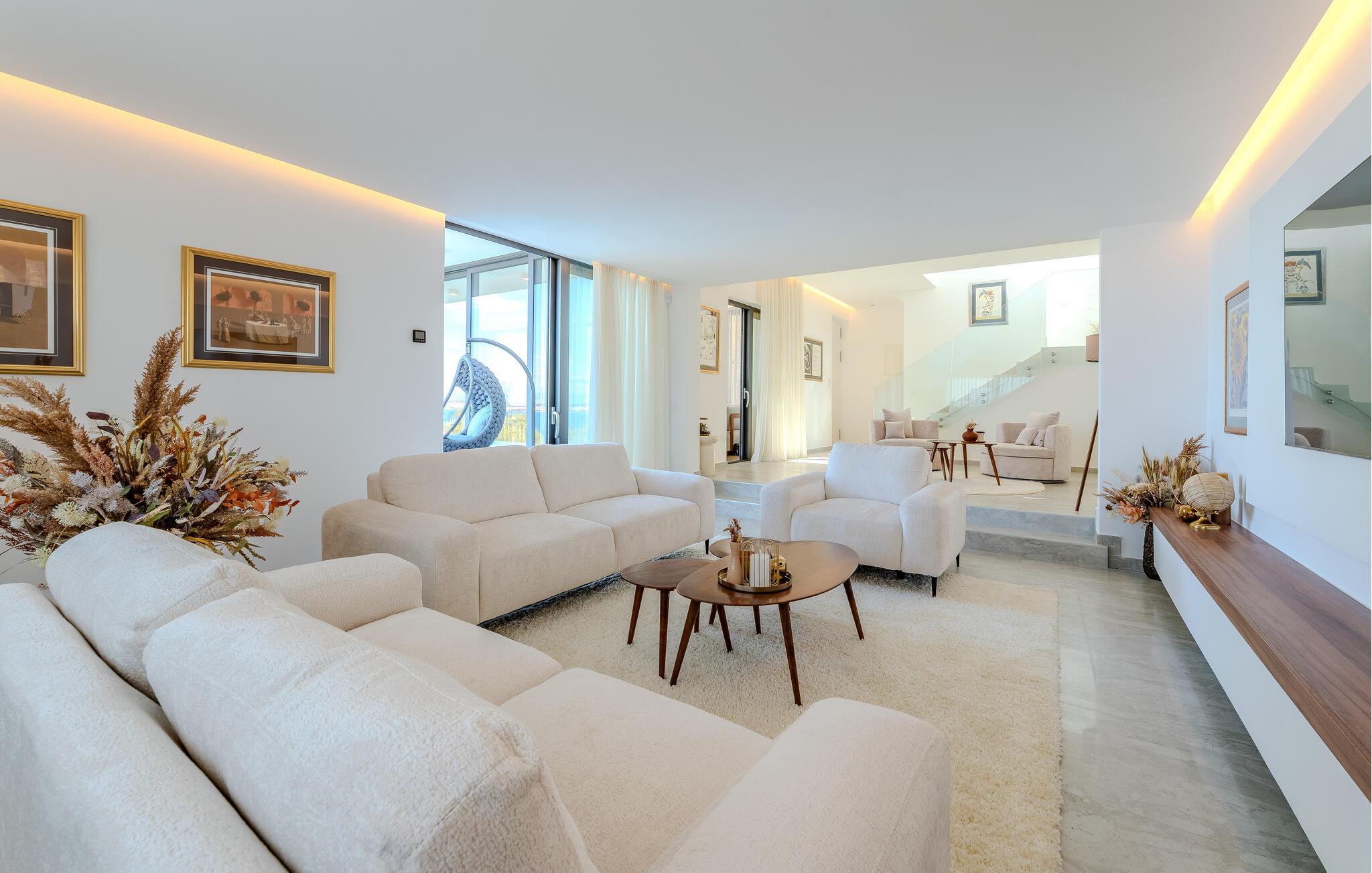 Denne rummelige og luksuriøst møblerede villa forkæler jer med alt det ekstra, I kan ønske jer til en uforglemmelig ferie med gode venner eller familie. Nyd lækre måltider med havudsigt, stream en spændende serie i den lyse, elegante opholdsstue, og lad den behagelige brise blæse gennem de stilfuldt møblerede værelser.