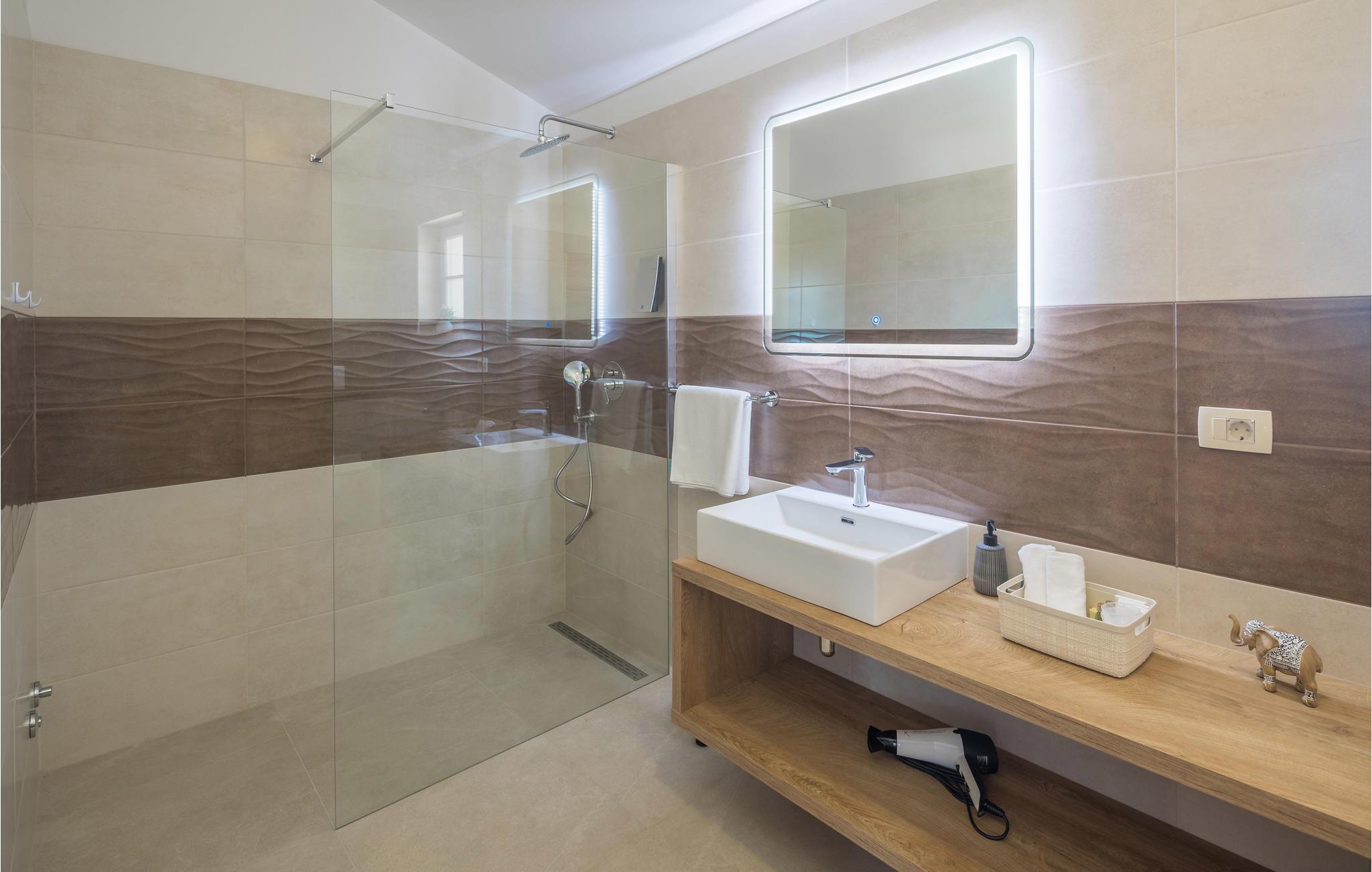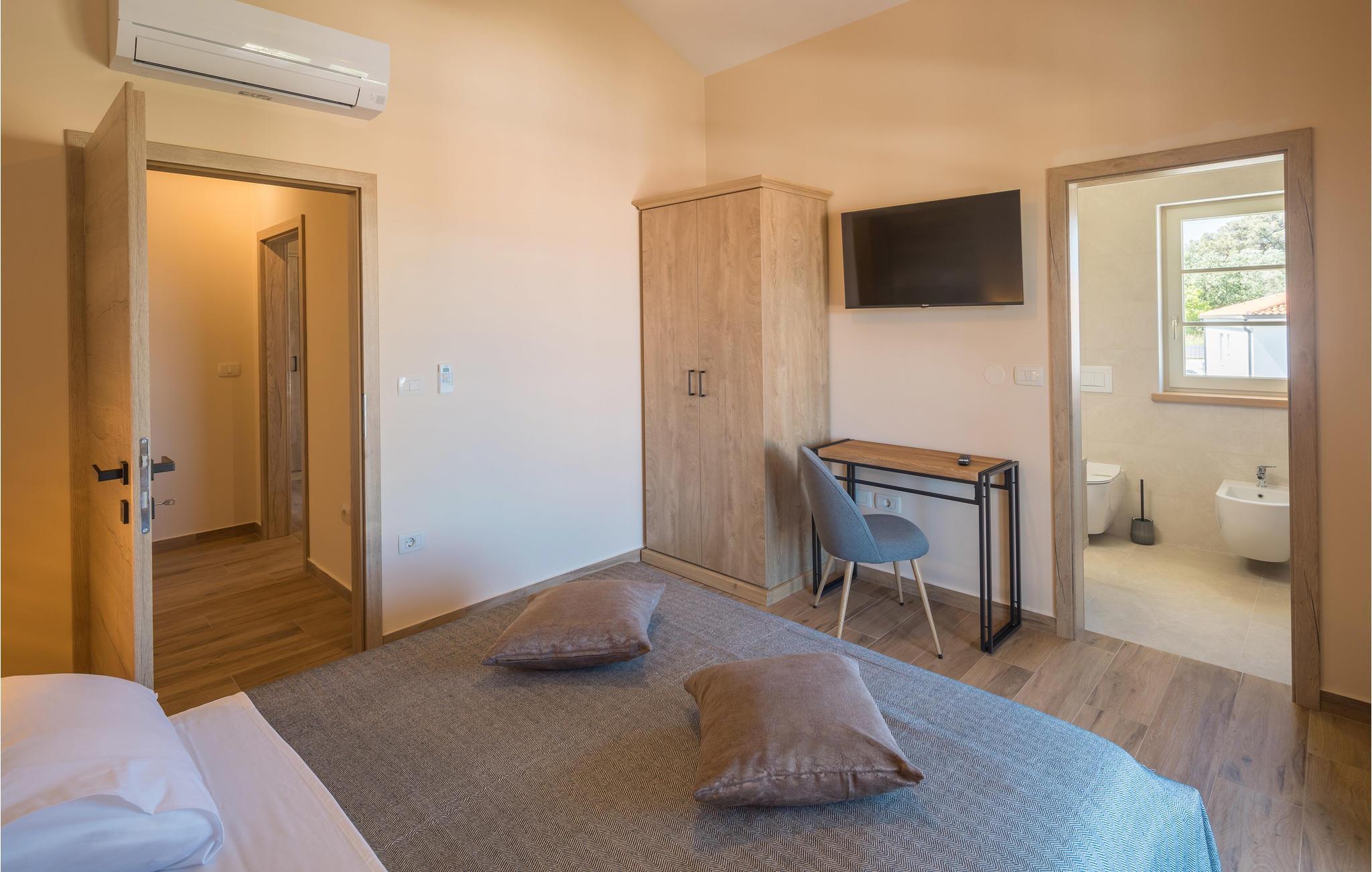 Denne skønne bolig er ikke kun visuelt tiltalende, men imponerer også med kvalitet og funktionalitet. Den ligger i det centrale Istrien, men kun 2,5 km fra havet, omgivet af en omhyggeligt anlagt have. Grunden er 1000 m2 og byder på fred og privatliv. Vælg mellem at slappe af foran fjernsynet eller saunaen i stueetagen. Der er også et aktivitetsrum med spil, poolbord og et vaskerum.