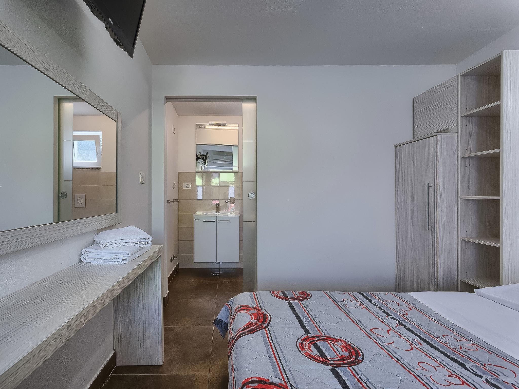 1-room apartment 18 m2, on the ground floor. Studio with 1 french bed (160 cm, length 200 cm), satellite TV (flat screen), air conditioning. Exit to the terrace, to the swimming pool. Open kitchen (2 ceramic glass hob hotplates, microwave) with dining table. Shower/WC. Terrace 6 m2, roofed. Terrace furniture. View of the swimming pool. Facilities: Internet (WiFi, free).