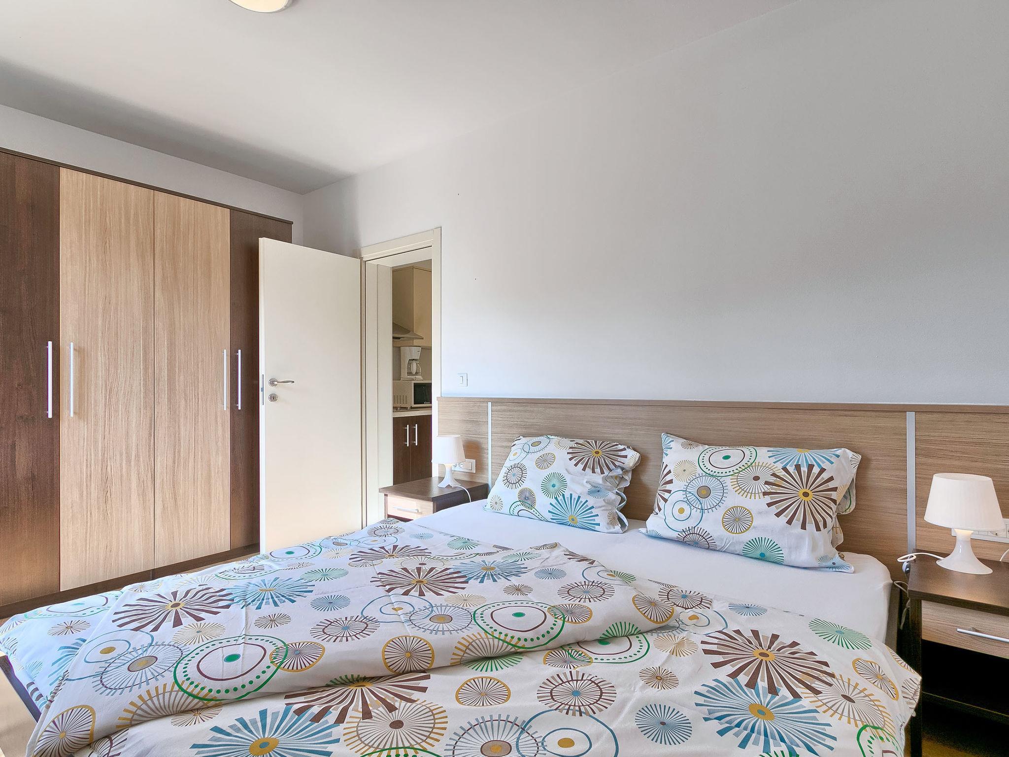2-room apartment 42 m2, on the ground floor. Living/dining room with 1 double sofabed and satellite TV (flat screen), air conditioning. Exit to the terrace. 1 room with 1 double bed (2 x 80 cm, length 200 cm). Open kitchen (2 ceramic glass hob hotplates, microwave, freezer). Shower/WC. Terrace 6 m2, roofed. Terrace furniture. View of the garden. Facilities: Internet (WiFi, free).