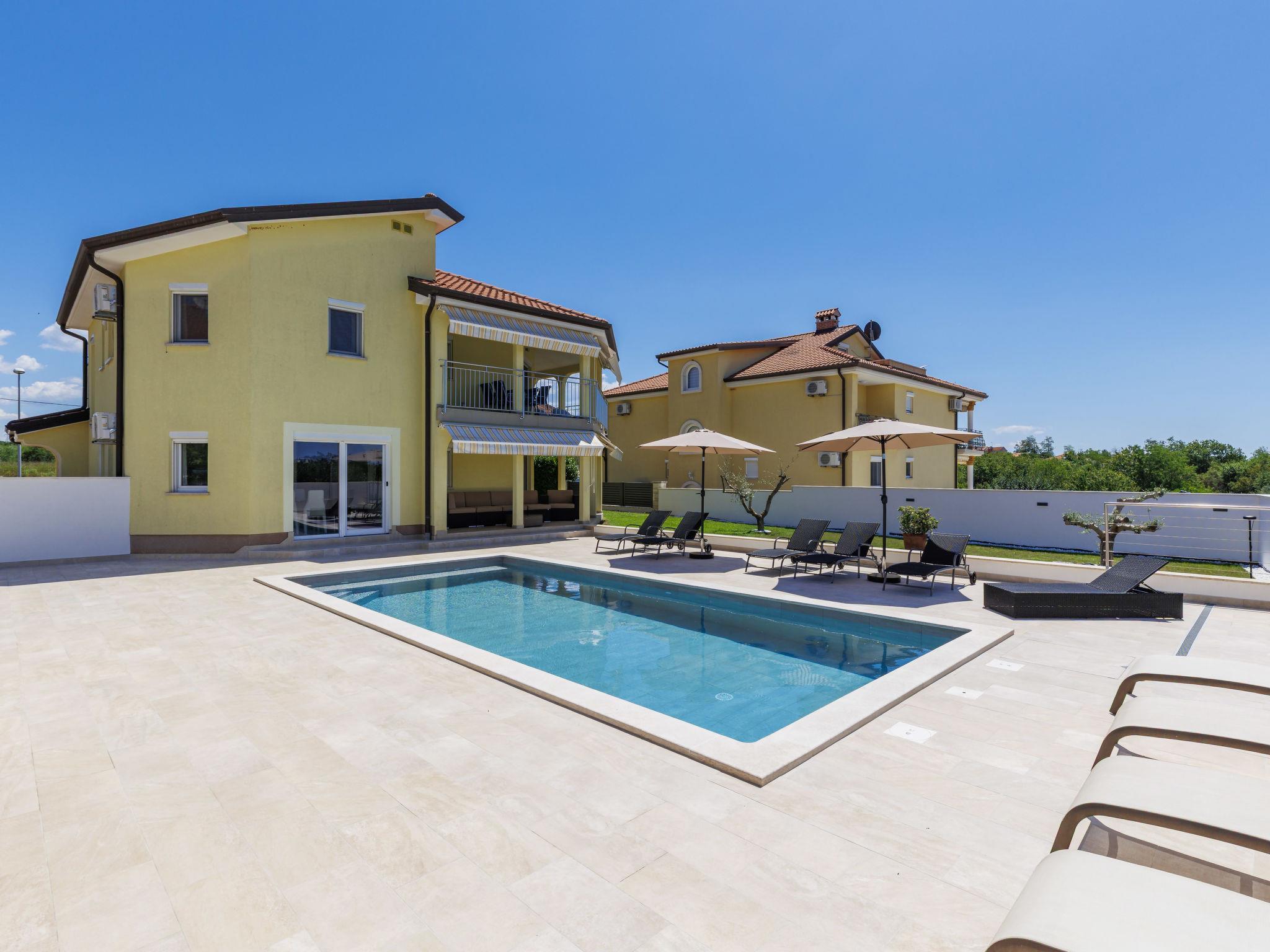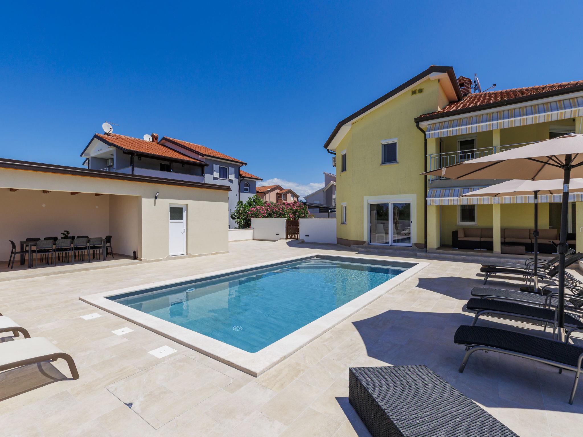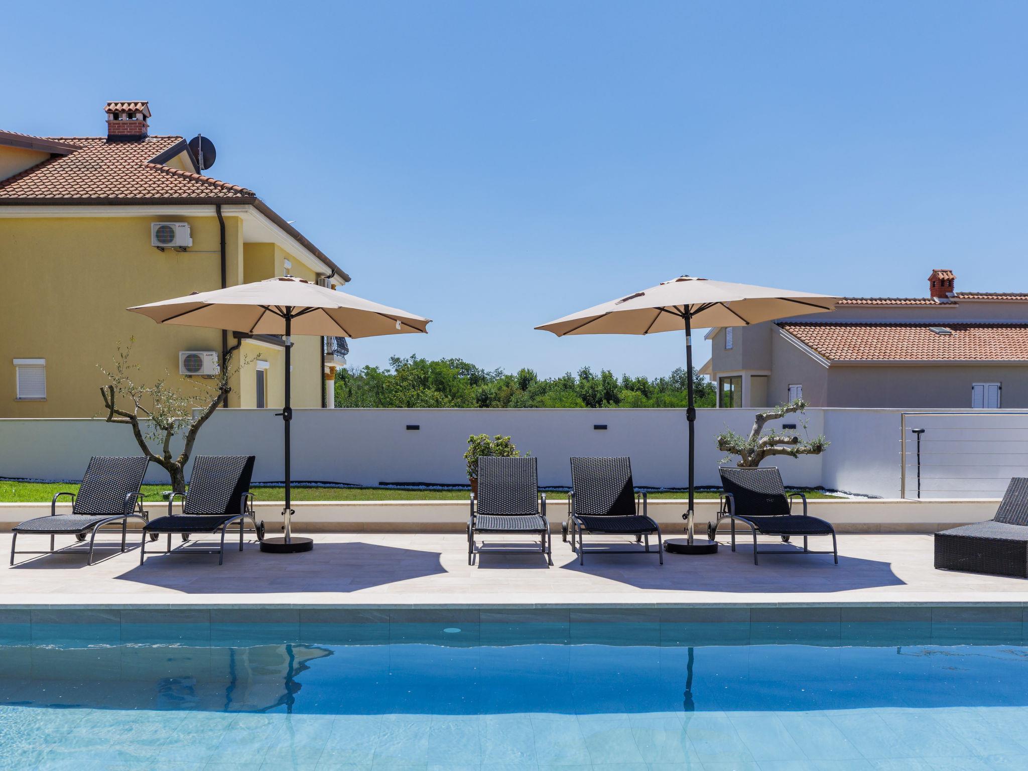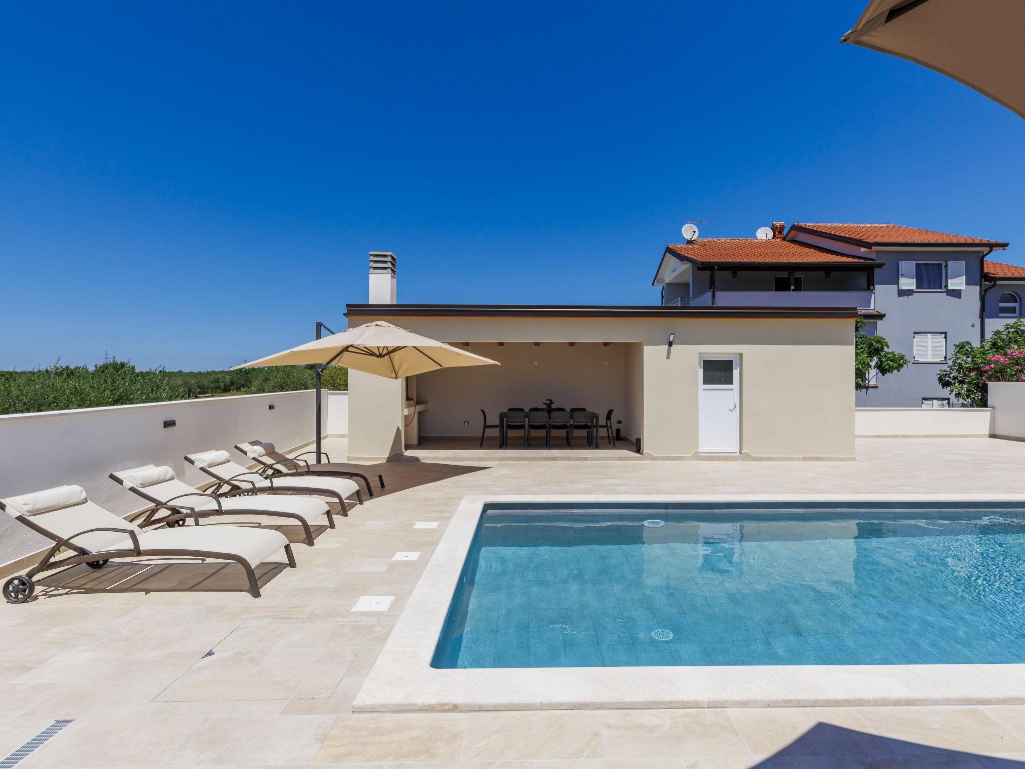 Beautiful single-family house "Villa Lucia", 2 storeys. In the hamlet Srbarica 3 km from the centre of Umag, in a sunny position, 2.5 km from the sea, 2.5 km from the beach, in a cul-de-sac. Private: property 850 m2 (fenced), garden with lawn, swimming pool angular (9 x 4 m, depth 145 cm, seasonal availability: 01.May. - 15.Oct.) with internal staircase. Outdoor shower, barbecue. In the house: internet access, washing machine. Parking (for 3 cars) at the house on the premises. Shop 1 km, supermarket 2 km, restaurant 500 m, bus stop 4.4 km, pebble beach 2.5 km, rocky beach 2.5 km, public bathing area 2.5 km. Golf course (18 hole) 10 km, tennis 3 km, walking paths from the house 500 m, cycle lane 550 m. Nearby attractions: aquapark 18 km, cave Mramornica 15 km. Please note: suitable for families. The owner does not accept any youth groups. Airfield 60 km from the property. The photograph shows a typical example. The house consists of 3 apartments rented as one unit: one apartment on the ground floor and two apartments on the first floor. The allowed number of people in and around the property / pool, grill and yard is 10 persons, outside visits prohibited.