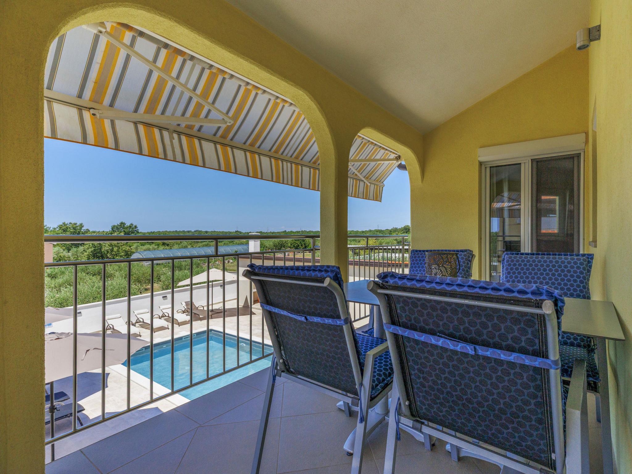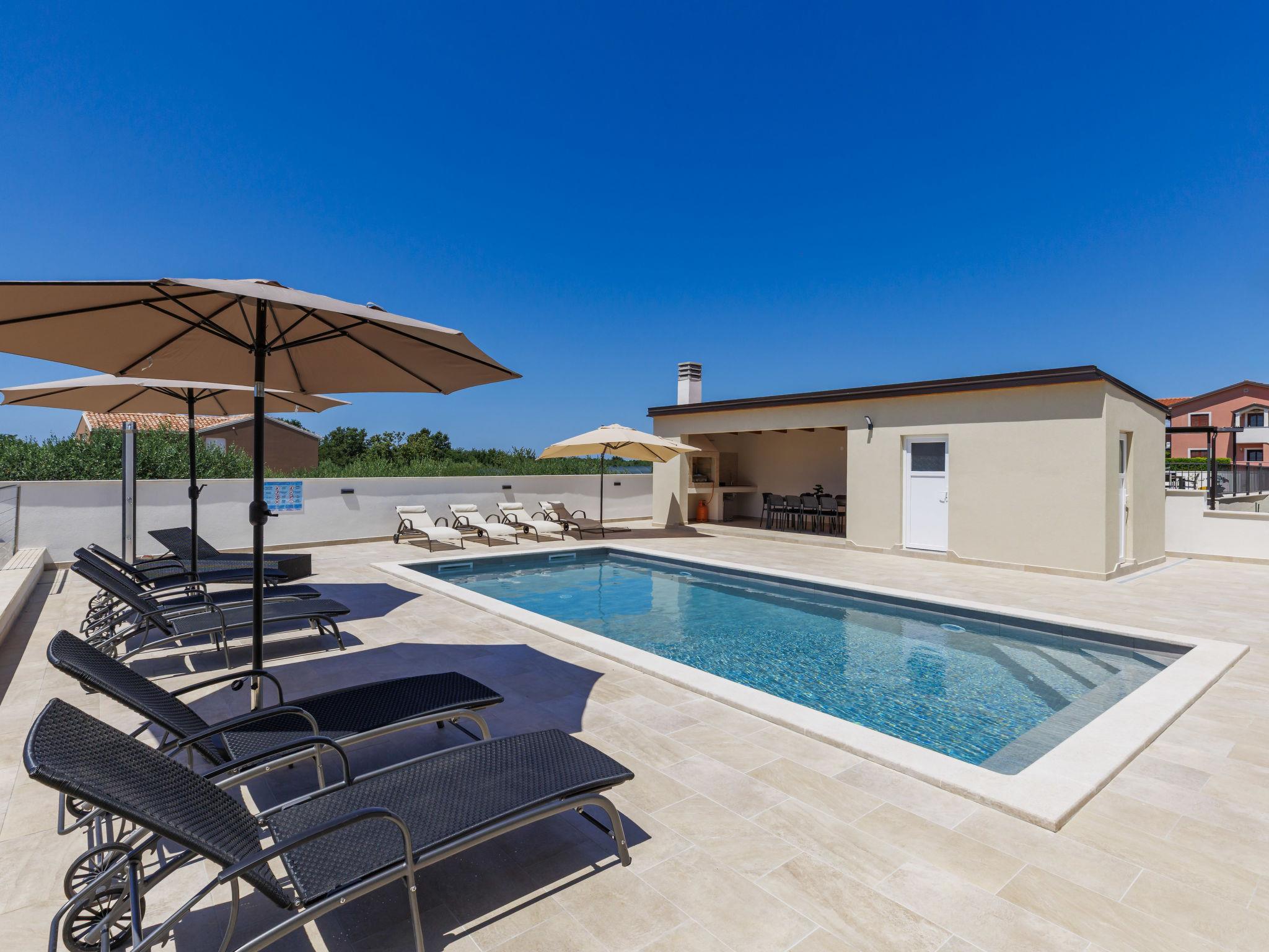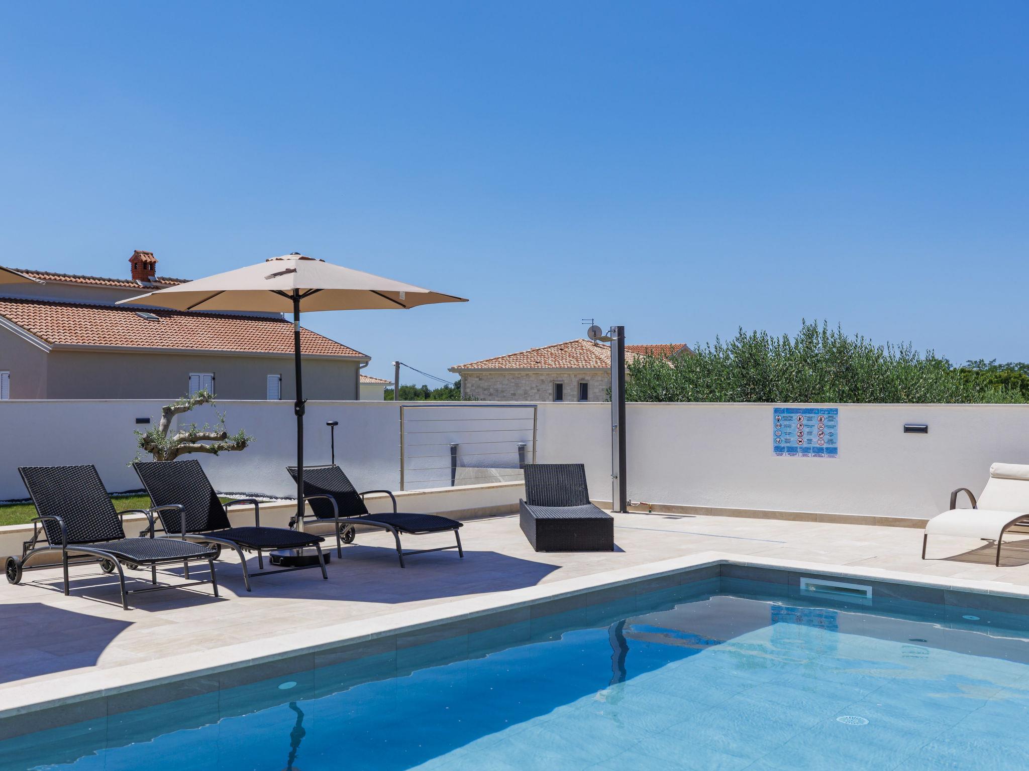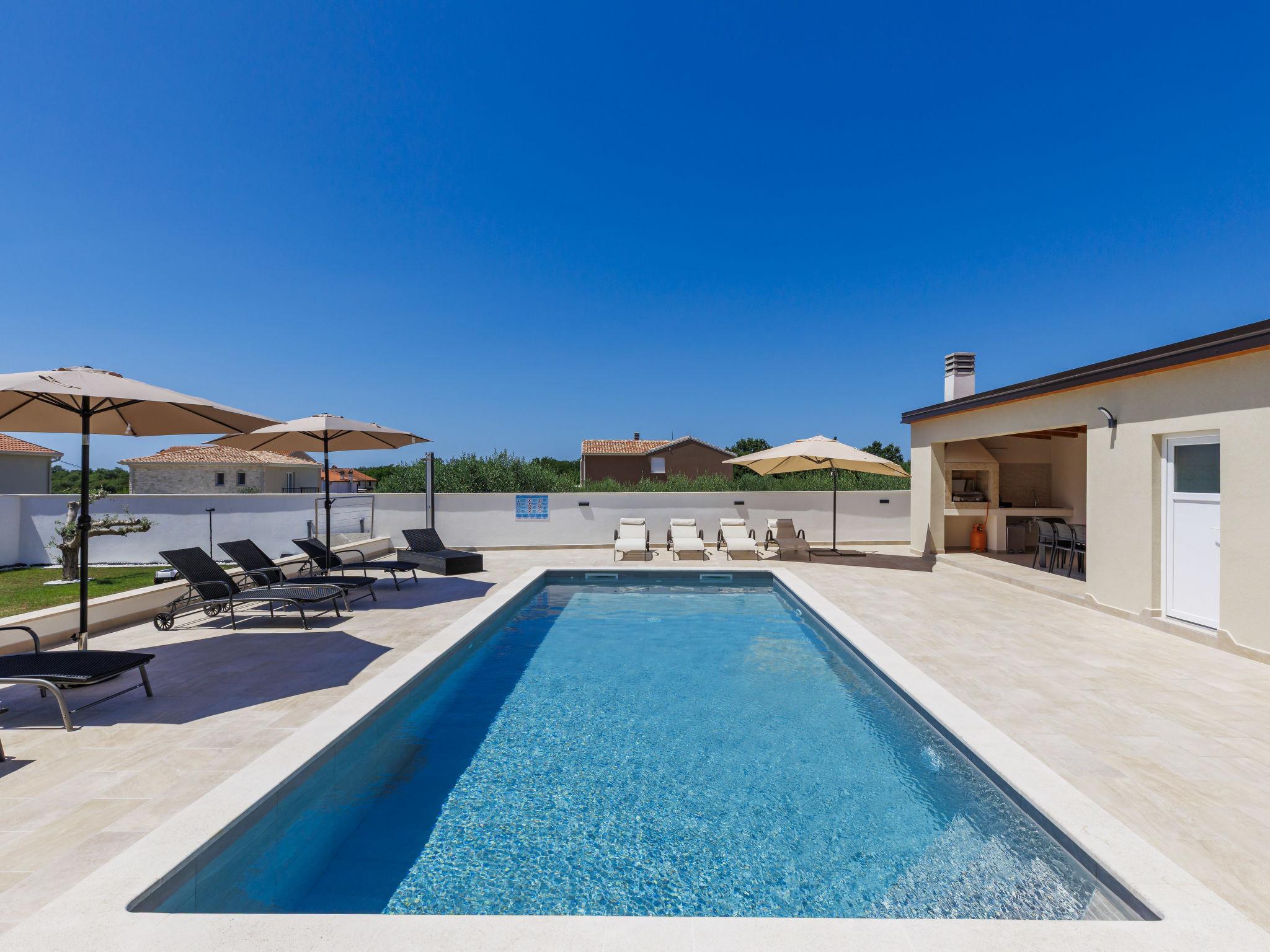 Beautiful single-family house "Villa Lucia", 2 storeys. In the hamlet Srbarica 3 km from the centre of Umag, in a sunny position, 2.5 km from the sea, 2.5 km from the beach, in a cul-de-sac. Private: property 850 m2 (fenced), garden with lawn, swimming pool angular (9 x 4 m, depth 145 cm, seasonal availability: 01.May. - 15.Oct.) with internal staircase. Outdoor shower, barbecue. In the house: internet access, washing machine. Parking (for 3 cars) at the house on the premises. Shop 1 km, supermarket 2 km, restaurant 500 m, bus stop 4.4 km, pebble beach 2.5 km, rocky beach 2.5 km, public bathing area 2.5 km. Golf course (18 hole) 10 km, tennis 3 km, walking paths from the house 500 m, cycle lane 550 m. Nearby attractions: aquapark 18 km, cave Mramornica 15 km. Please note: suitable for families. The owner does not accept any youth groups. Airfield 60 km from the property. The photograph shows a typical example. The house consists of 3 apartments rented as one unit: one apartment on the ground floor and two apartments on the first floor. The allowed number of people in and around the property / pool, grill and yard is 10 persons, outside visits prohibited.