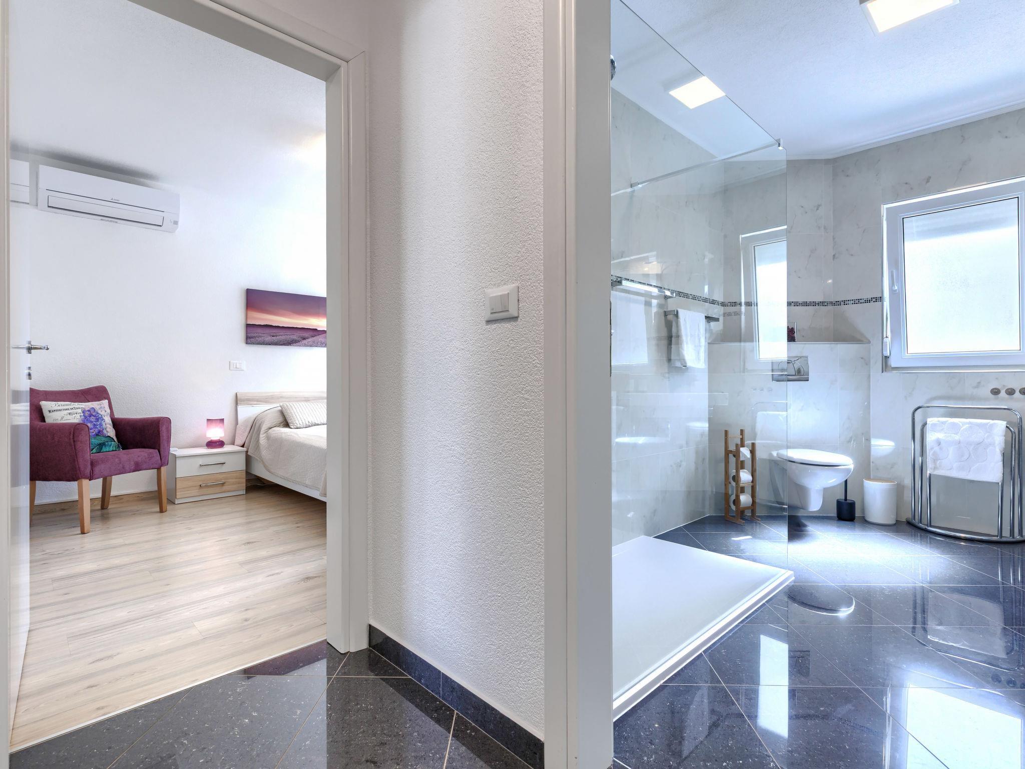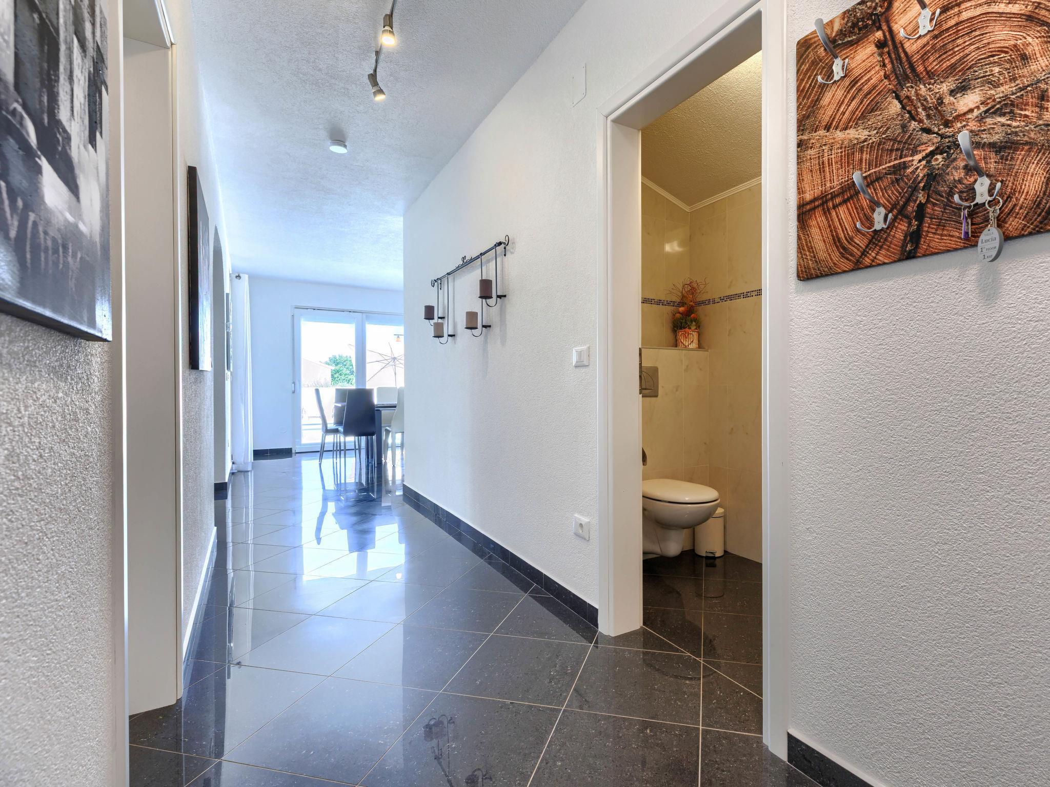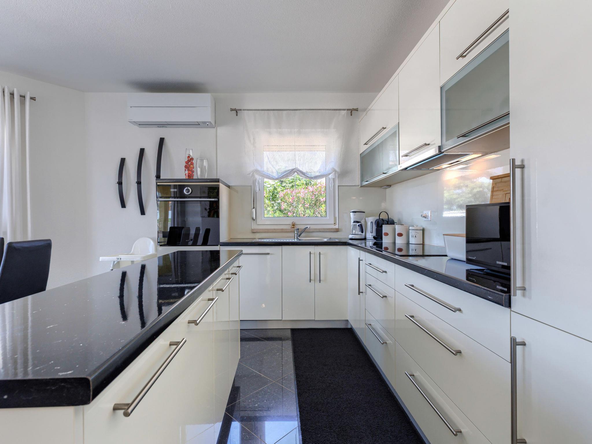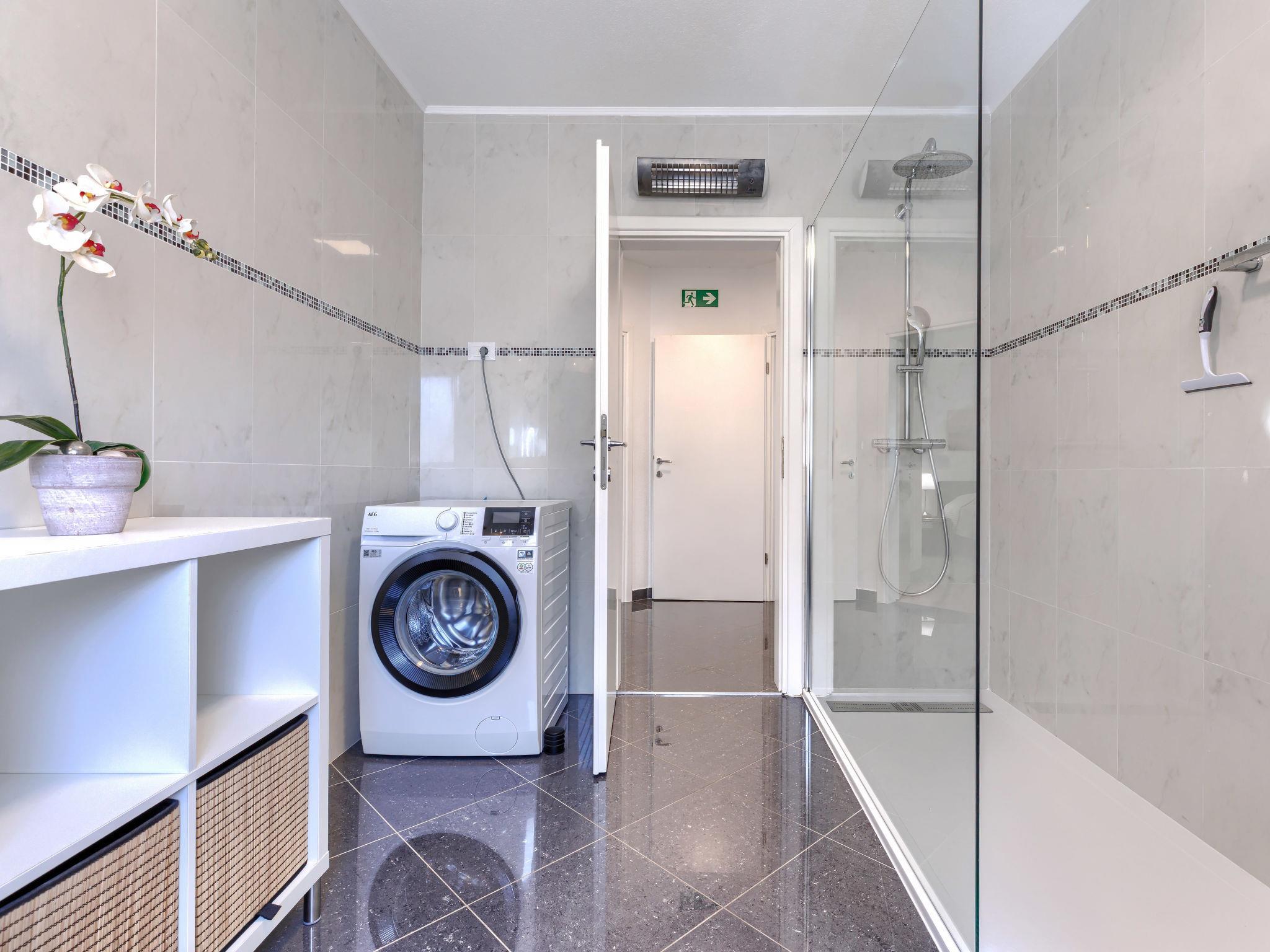 8-room house 210 m2. Beautiful and tasteful furnishings: living/dining room 60 m2 with satellite TV (flat screen), air conditioning. Exit to the terrace. 1 room with 1 french bed (160 cm, length 200 cm). 1 room with 1 french bed (180 cm, length 200 cm). 1 room with 1 french bed (160 cm, length 200 cm), air conditioning. Open kitchen (oven, dishwasher, 4 ceramic glass hob hotplates, toaster, microwave, freezer, electric coffee machine). Shower/WC, sep. WC. Upper floor: living/dining room with kitchen corner and satellite TV (flat screen), air conditioning. Exit to the terrace. 1 room with 1 bed (90 cm, length 200 cm), 1 french bed (180 cm, length 200 cm). Exit to the terrace. Living/dining room with satellite TV (flat screen), air conditioning. 1 room with 1 french bed (160 cm, length 200 cm). Open kitchen (oven, dishwasher, 4 ceramic glass hob hotplates, kettle, microwave, electric coffee machine). 2 showers/WC. No heating option. Terrace 11 m2, roofed, terrace 30 m2. Terrace furniture, deck chairs. View of the swimming pool and the garden. Facilities: hair dryer. Internet (WiFi, free).