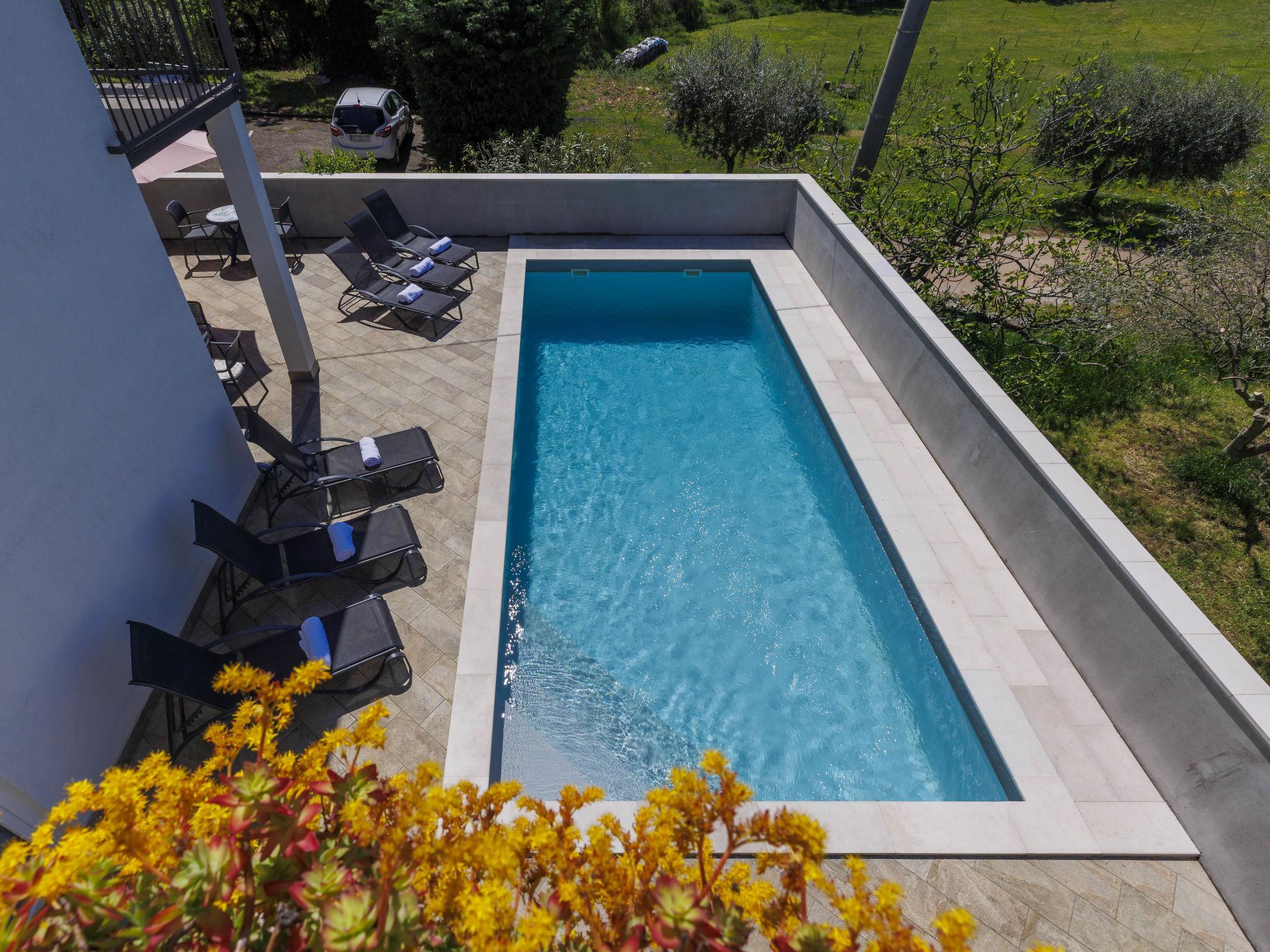 Beautiful house "Villa Soši", 2 storeys. In the hamlet Soši 3.5 km from the centre of Umag, in a quiet position, 3 km from the sea, 3 km from the beach. Private: property 500 m2 (fenced), garden, swimming pool angular (8 x 4 m, depth 150 cm, seasonal availability: 15.Apr. - 15.Oct.) with internal staircase. Outdoor shower, terrace (30 m2), garden furniture, barbecue, pool maintenance by the owner/gardener. In the house: internet access, washing machine. Breakfast on request. Parking (for 2 cars) at the house on the premises. Shop 3.5 km, supermarket 3.5 km, restaurant 800 m, bus stop "Umag" 4 km, railway station 33 km, pebble beach 3 km. Golf course (18 hole) 7 km. Nearby attractions: Aquapark 10 km. The owner does not accept any youth groups.