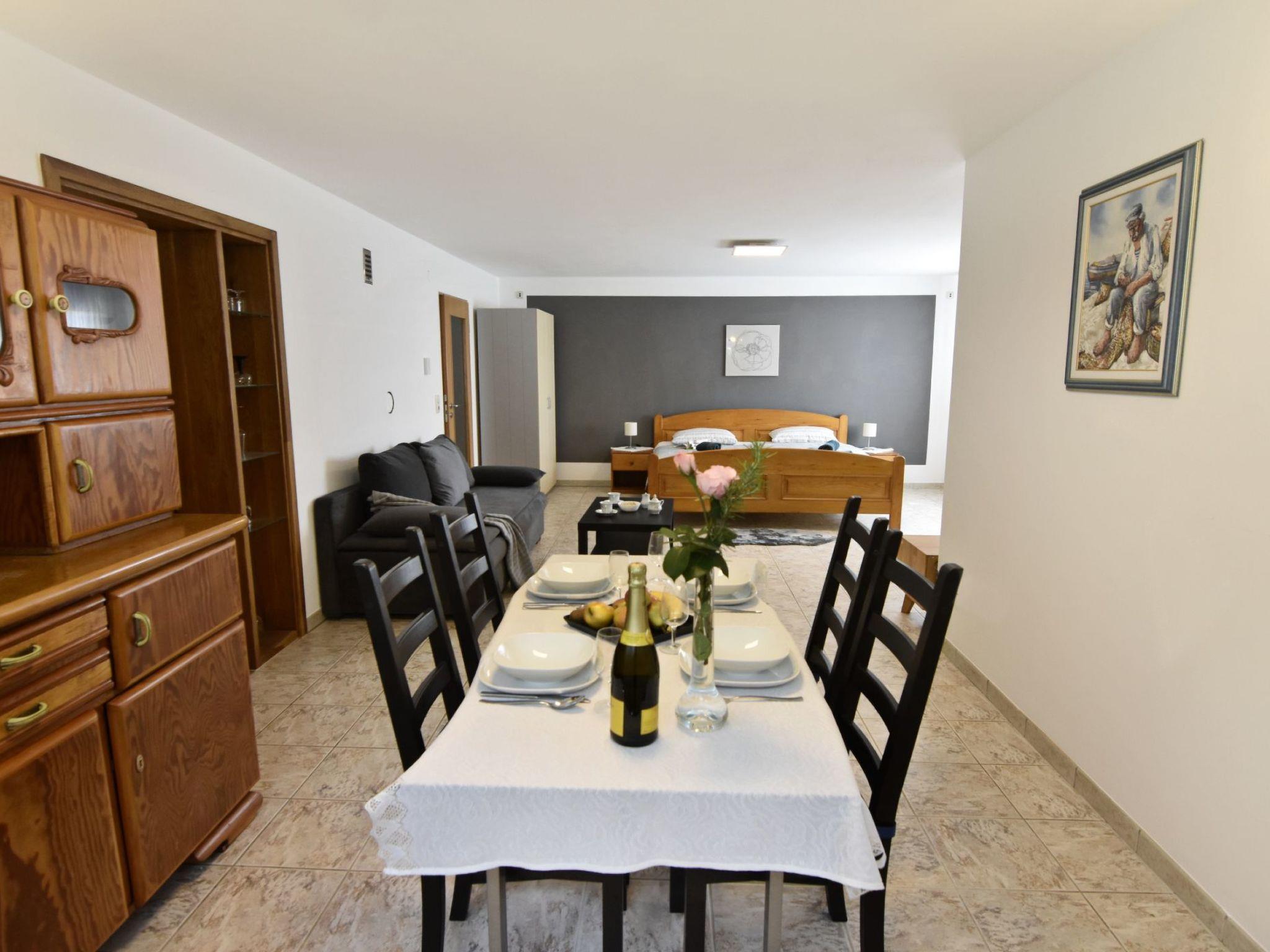 Welcome to our spacious apartment on the lower ground floor of a family house. The entrance is shared with the owner, but the apartment is completely separate. At the entrance, you will find a table with chairs and doors to access the rooms. In the spacious living area/bedroom, you will have at your disposal a double bed, a wardrobe, a chest of drawers with a Smart TV, a sofa bed for one person, a coffee table and a dining table with chairs. The dining area leads to the fully equipped kitchen with a fridge and freezer area, oven, dishwasher, kettle, filter coffee maker, toaster and kitchen utensils. The small bathroom is equipped with a shower cubicle, toilet, sink with mirror and cabinet, as well as a hair dryer. We provide two towels per person and bed linen, as well as free Wi-Fi and a parking space in front of the house. The apartment is simply furnished, it doesn't have air conditioning, but the temperature is pleasant thanks to its location in the basement. It is equipped with everything needed for a comfortable stay away from the hustle and bustle, yet close to the beaches and necessary services.