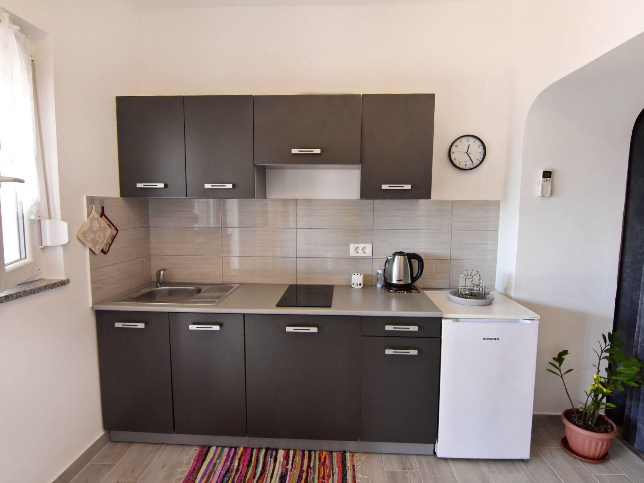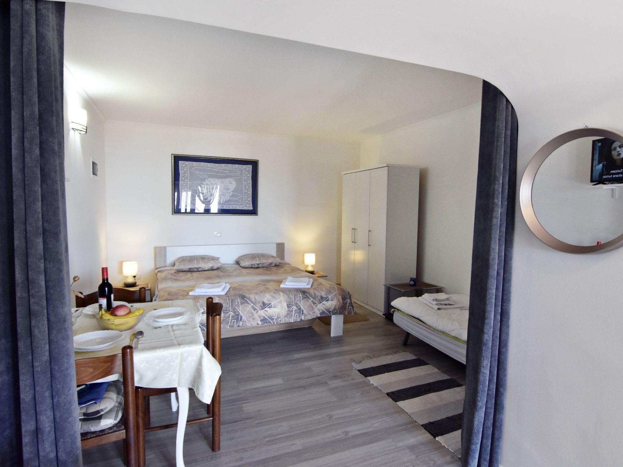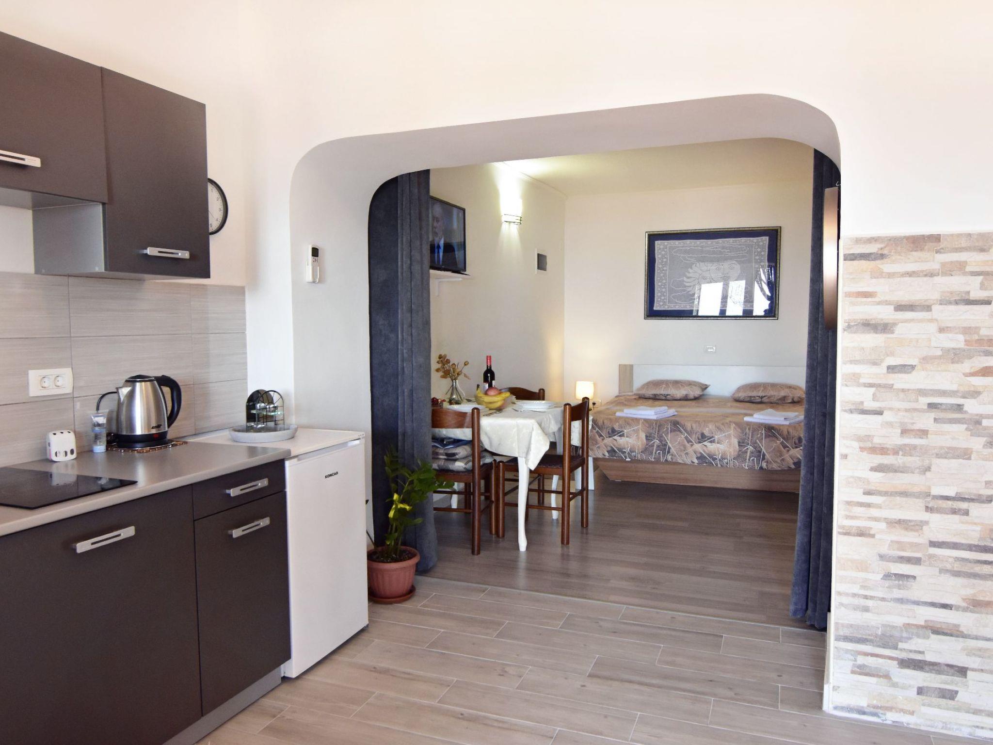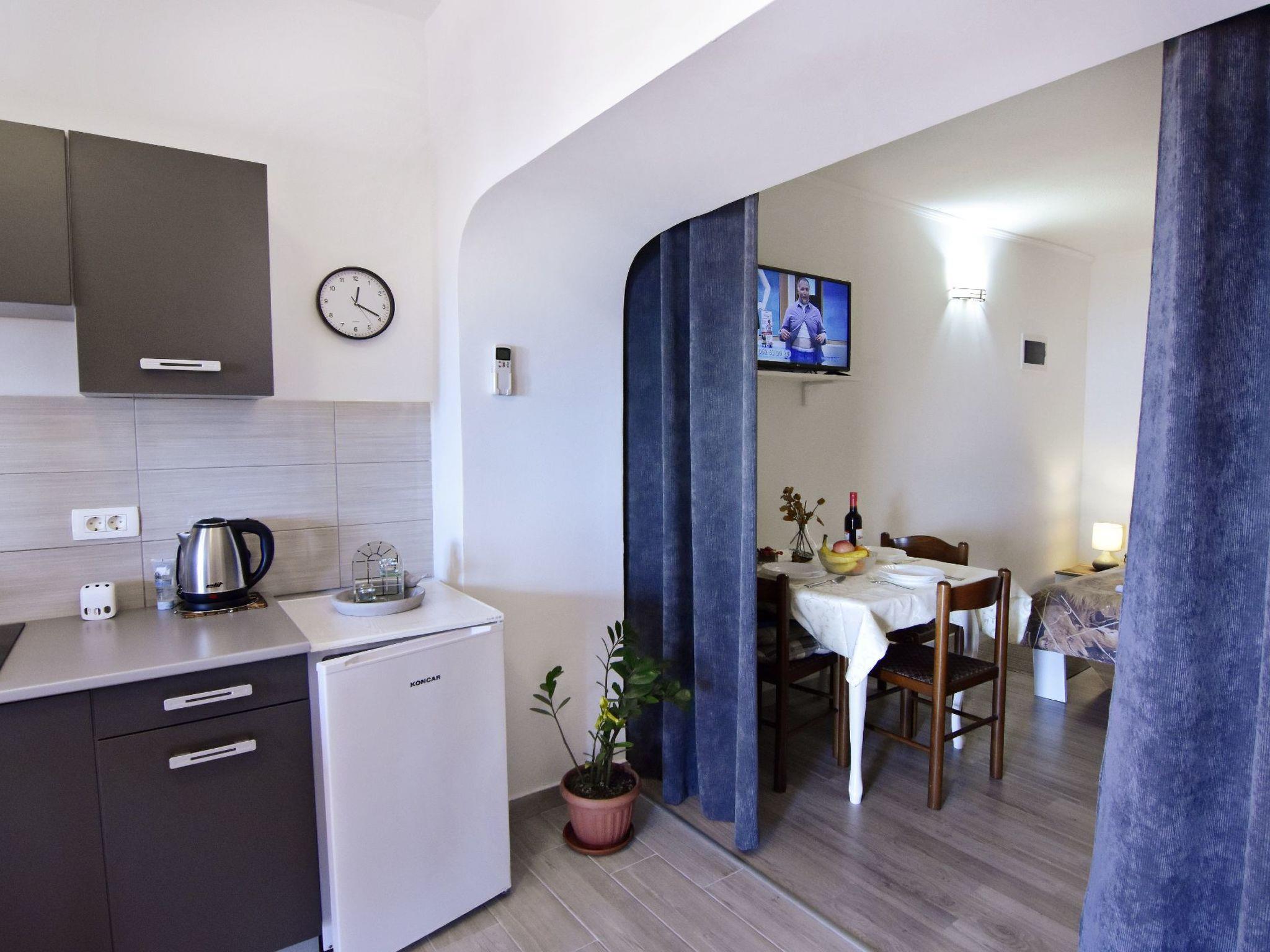 The studio apartment has a private terrace with table and benches at the entrance, a kitchen equipped with two electric cooking points, a kettle, a fridge, a dining table and chairs. The sleeping area has a double bed and a sofa bed for one person, bed linen is provided, wardrobe, air conditioner, flat screen satellite TV. The bathroom with shower, sink with mirror, toilet, towels for the bathroom are provided.