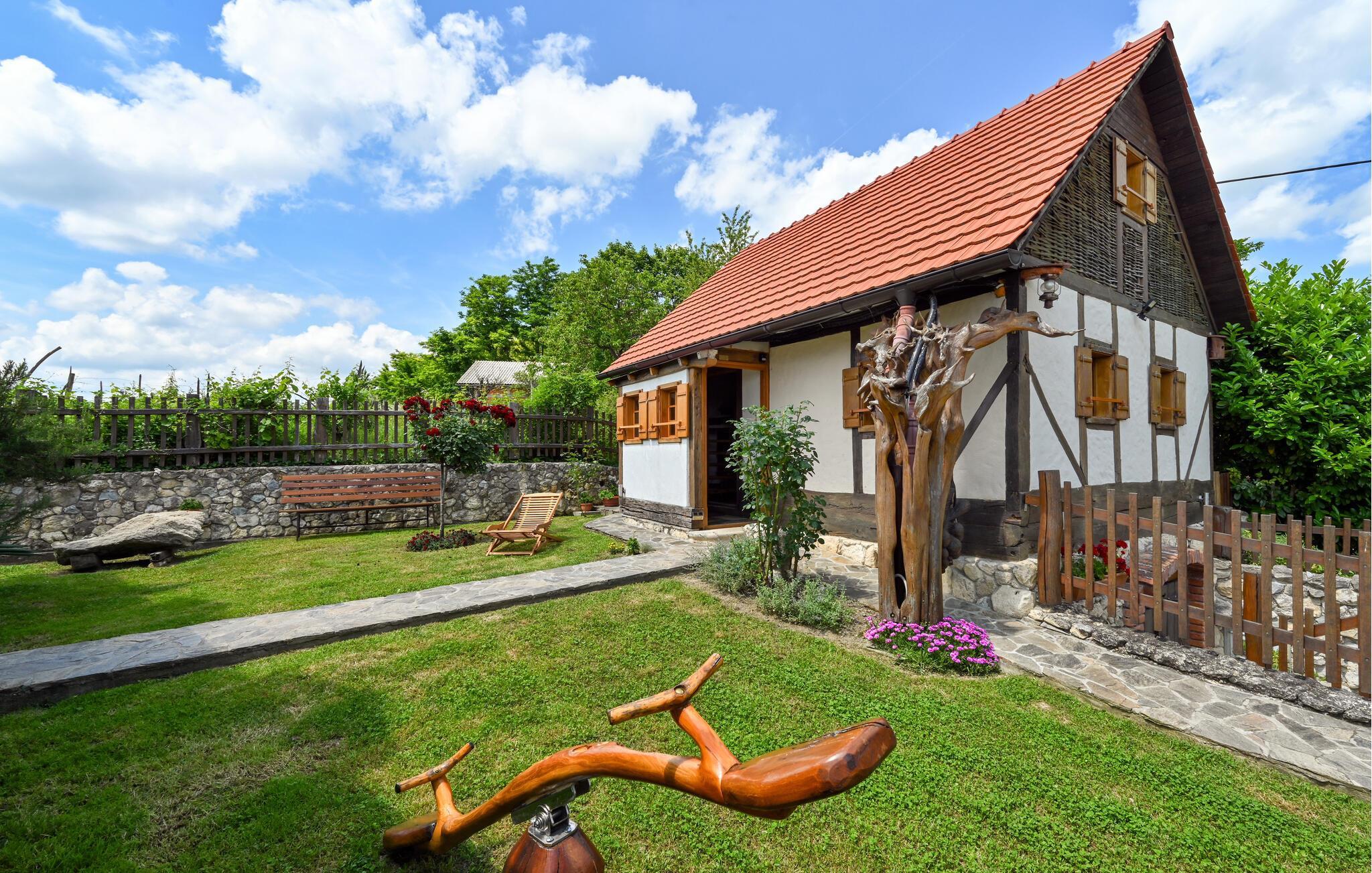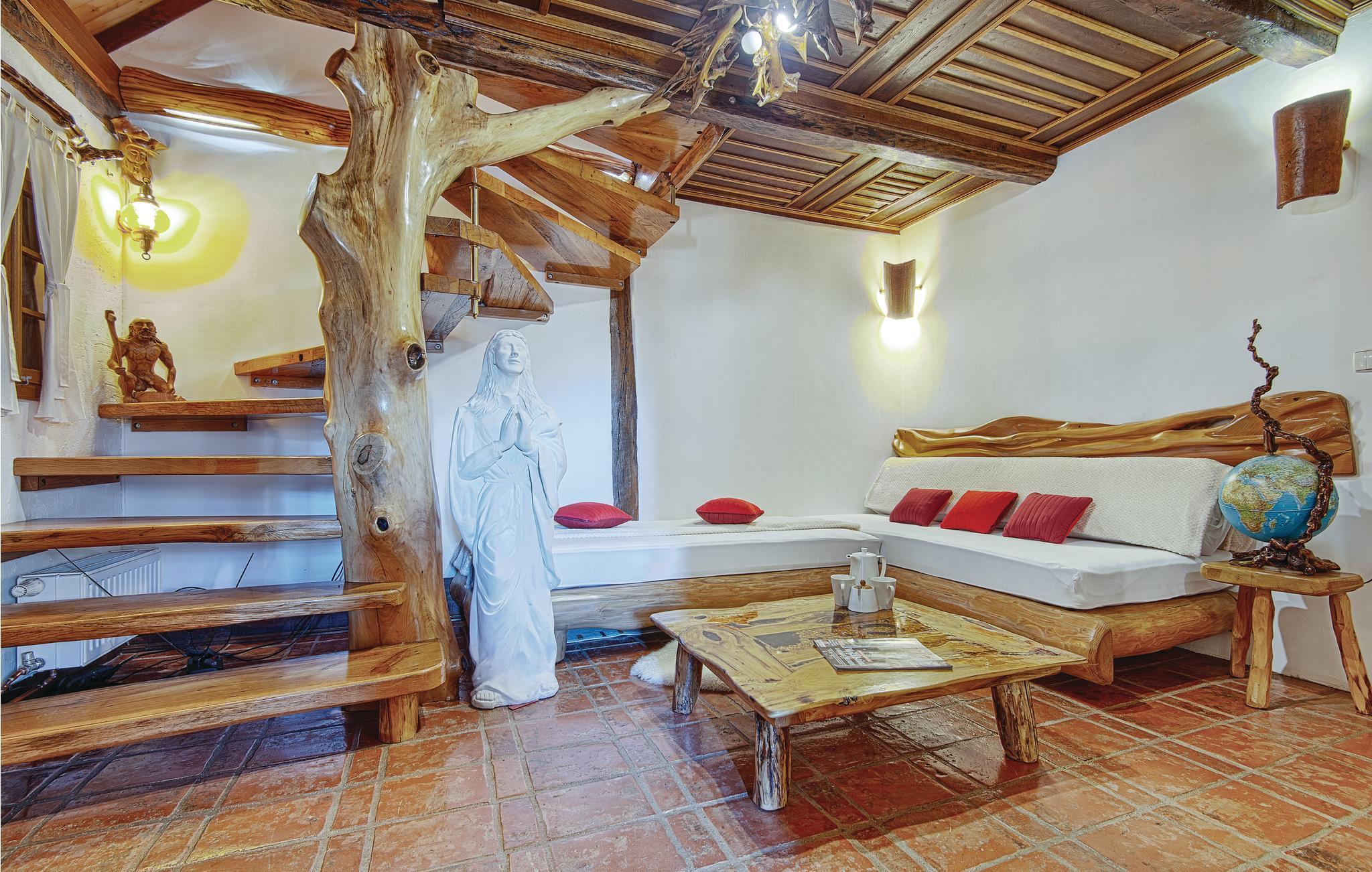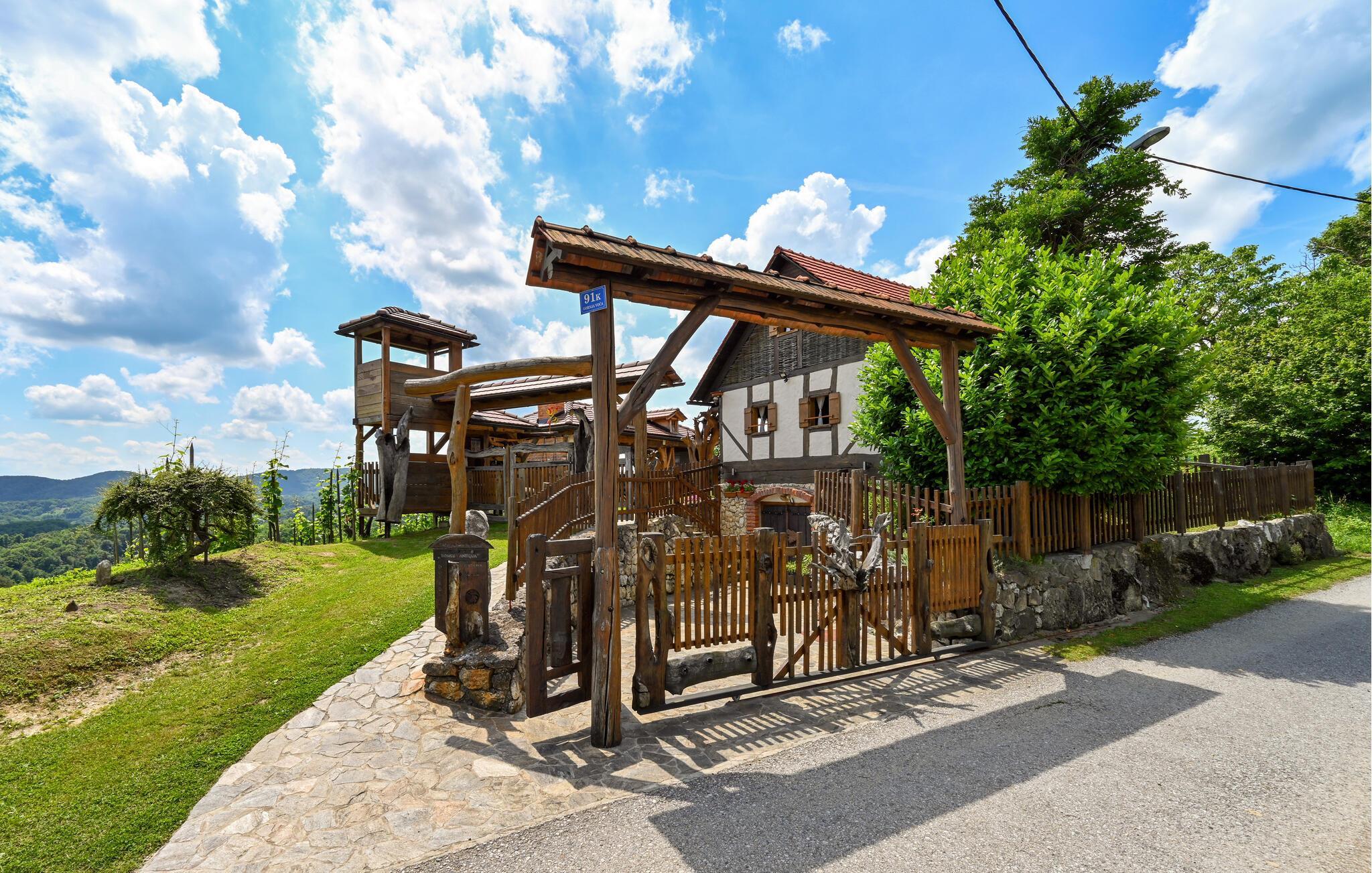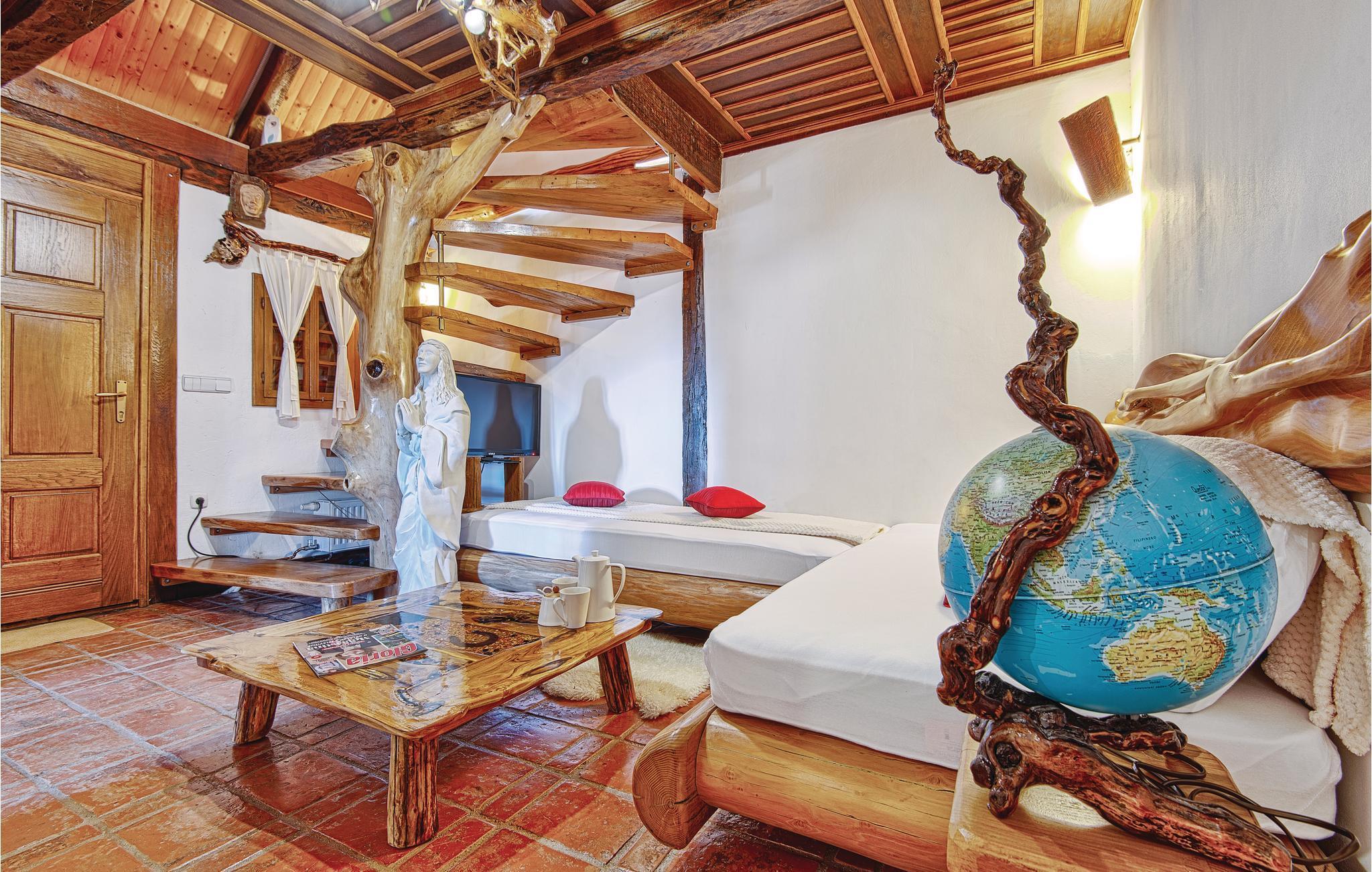 Fantastisk dejligt feriehus der ligger højt på en bakke, med betagende udsigt over både skove, de grønne vinbjerge og bakkesiderne. Huset er helt specielt indrettet med unika skulpturer og møbler – her kan I holde ferie i helt særlige omgivelser. Køkken i åben forbindelse med stuen ligger i husets stueplan, mens der på øverste etage med skrå vægge (går ned til ca. 40 cm i siden) er der soveværelse og en hems, der også kan benyttes til soveværelse. Gå en afslappet tur gennem den underskønne natur, hvis I vil være mere aktive, så kan I både cykle og trekke ad mange velanlagte stier. Oplev Vindijahulerne i Donja Voca og besøg den gamle bydel i Varaždin med skønne barokpaladser.