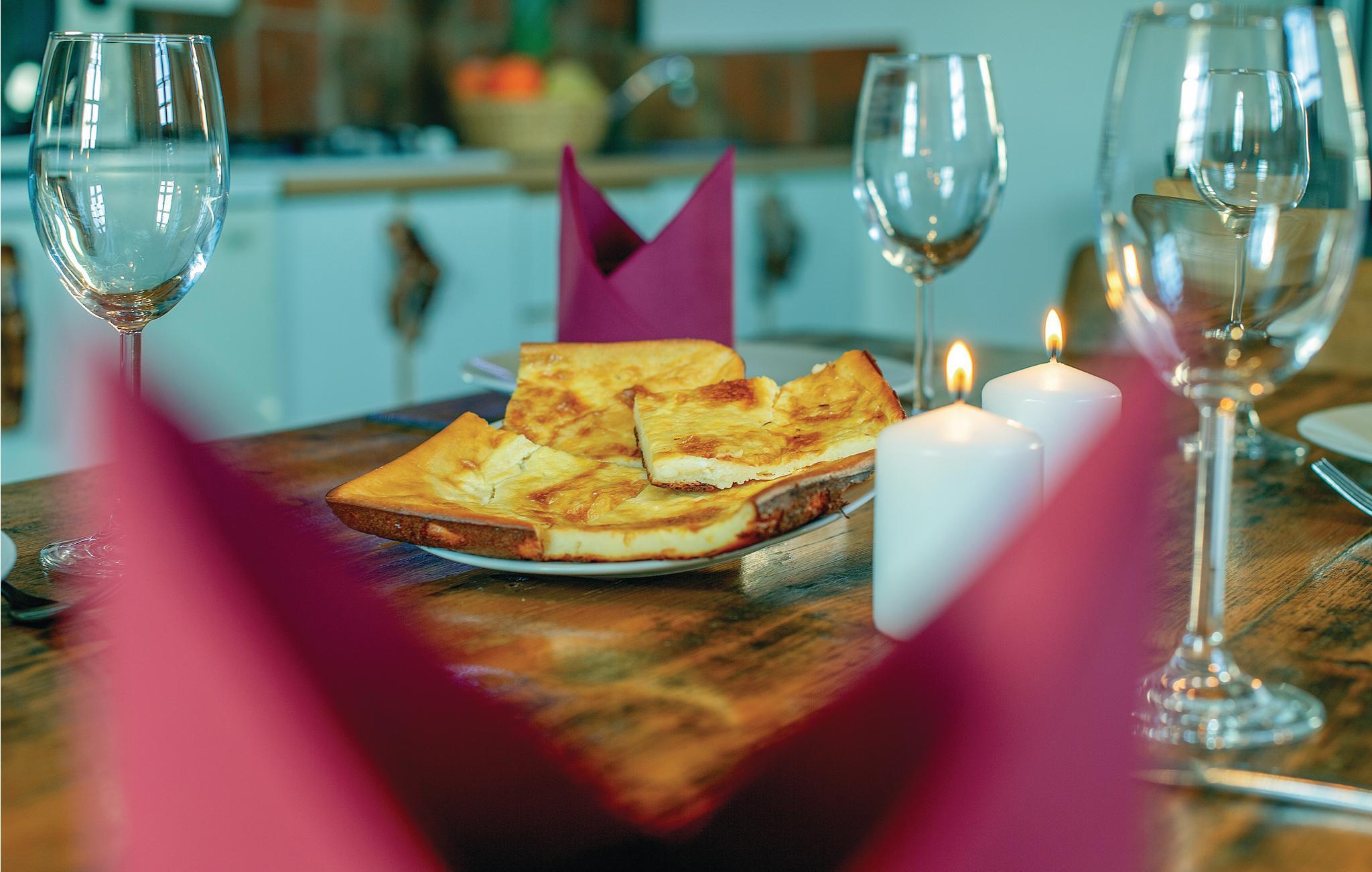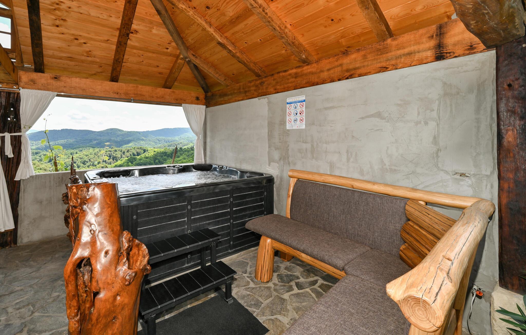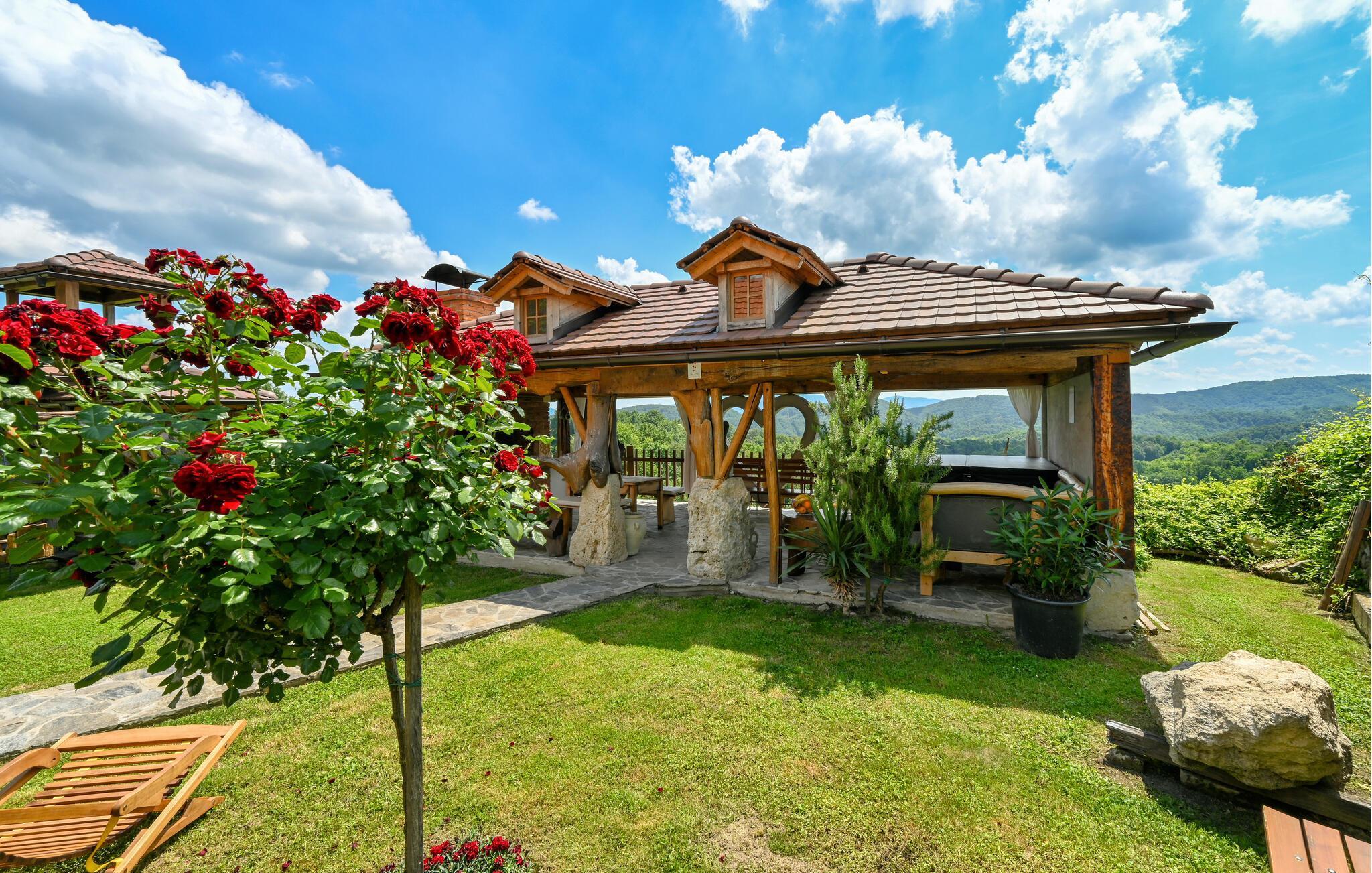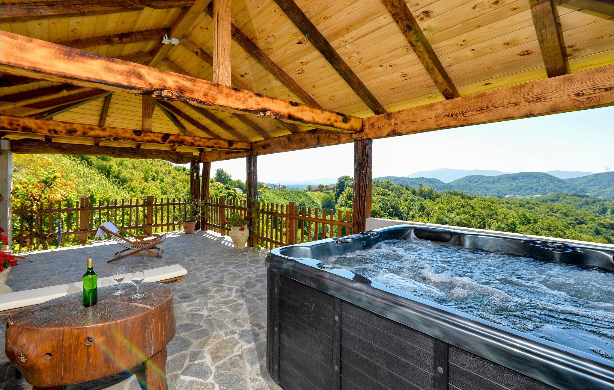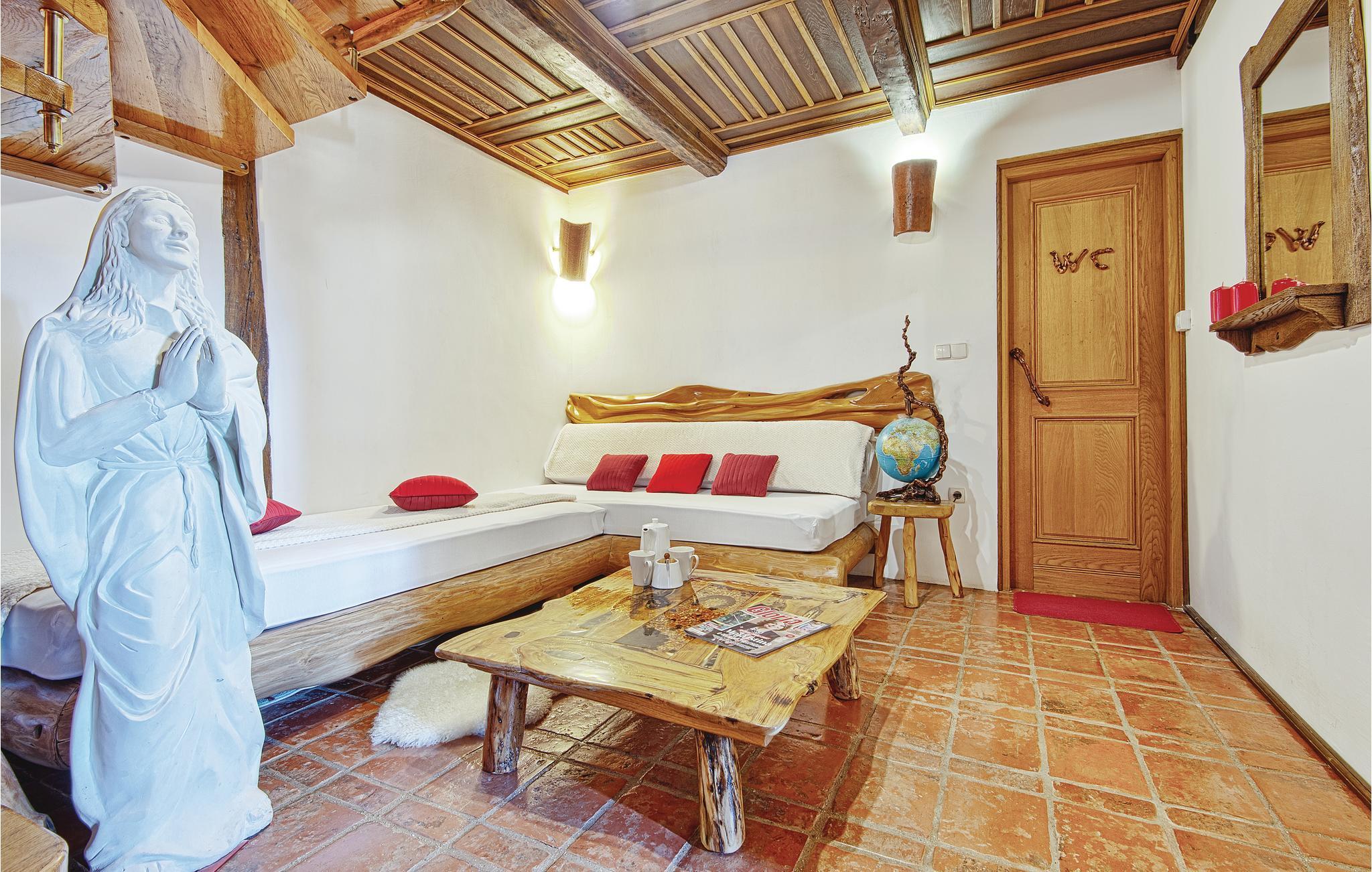 Fantastisk dejligt feriehus der ligger højt på en bakke, med betagende udsigt over både skove, de grønne vinbjerge og bakkesiderne. Huset er helt specielt indrettet med unika skulpturer og møbler – her kan I holde ferie i helt særlige omgivelser. Køkken i åben forbindelse med stuen ligger i husets stueplan, mens der på øverste etage med skrå vægge (går ned til ca. 40 cm i siden) er der soveværelse og en hems, der også kan benyttes til soveværelse. Gå en afslappet tur gennem den underskønne natur, hvis I vil være mere aktive, så kan I både cykle og trekke ad mange velanlagte stier. Oplev Vindijahulerne i Donja Voca og besøg den gamle bydel i Varaždin med skønne barokpaladser.