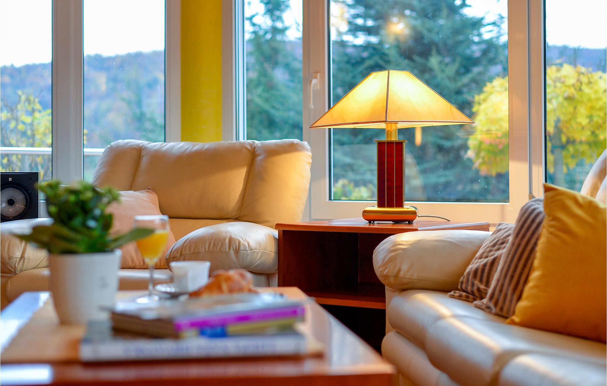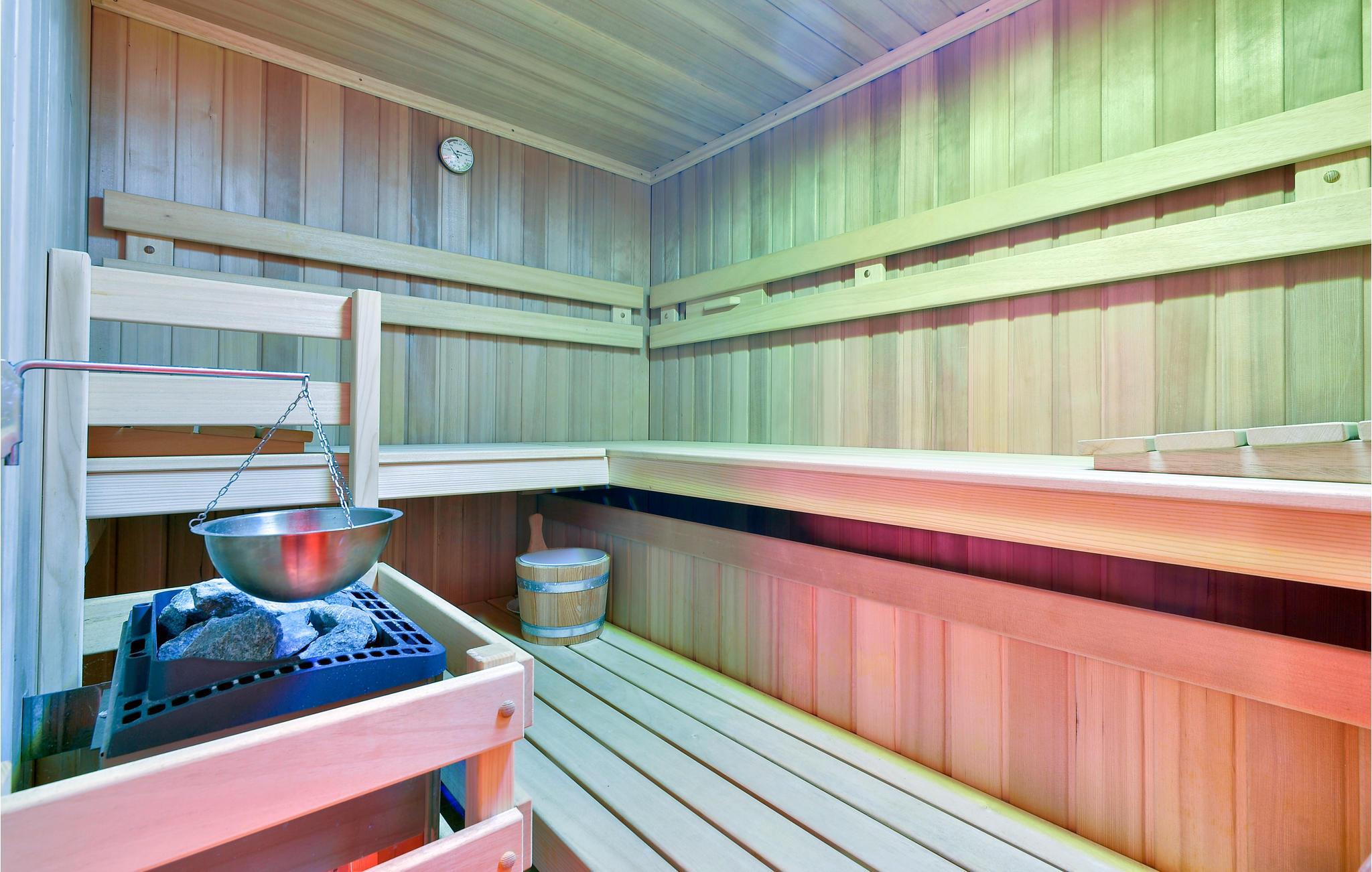 Husets indre består af to soveværelser, to badeværelser, et køkken og en stue med glasskydedøre og udsigt over både haven og landskabet. Til jeres helt private wellness er der et rum med to saunaer, en finsk og en infrarød.