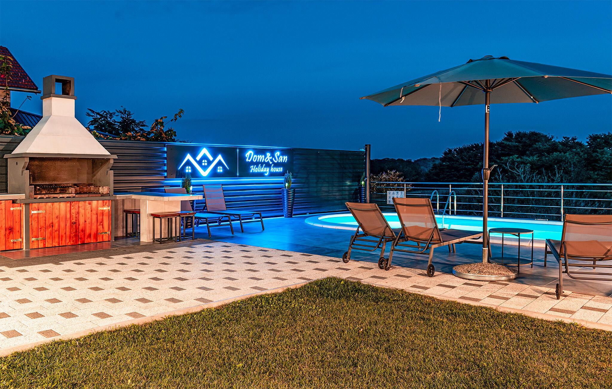 Udenfor tilbyder poolen skøn nedkøling, og den overdækkede terrasse inviterer jer til at slappe af. Jeres børn vil være glade for trampolinen, rutsjebanen og klatrestativet.