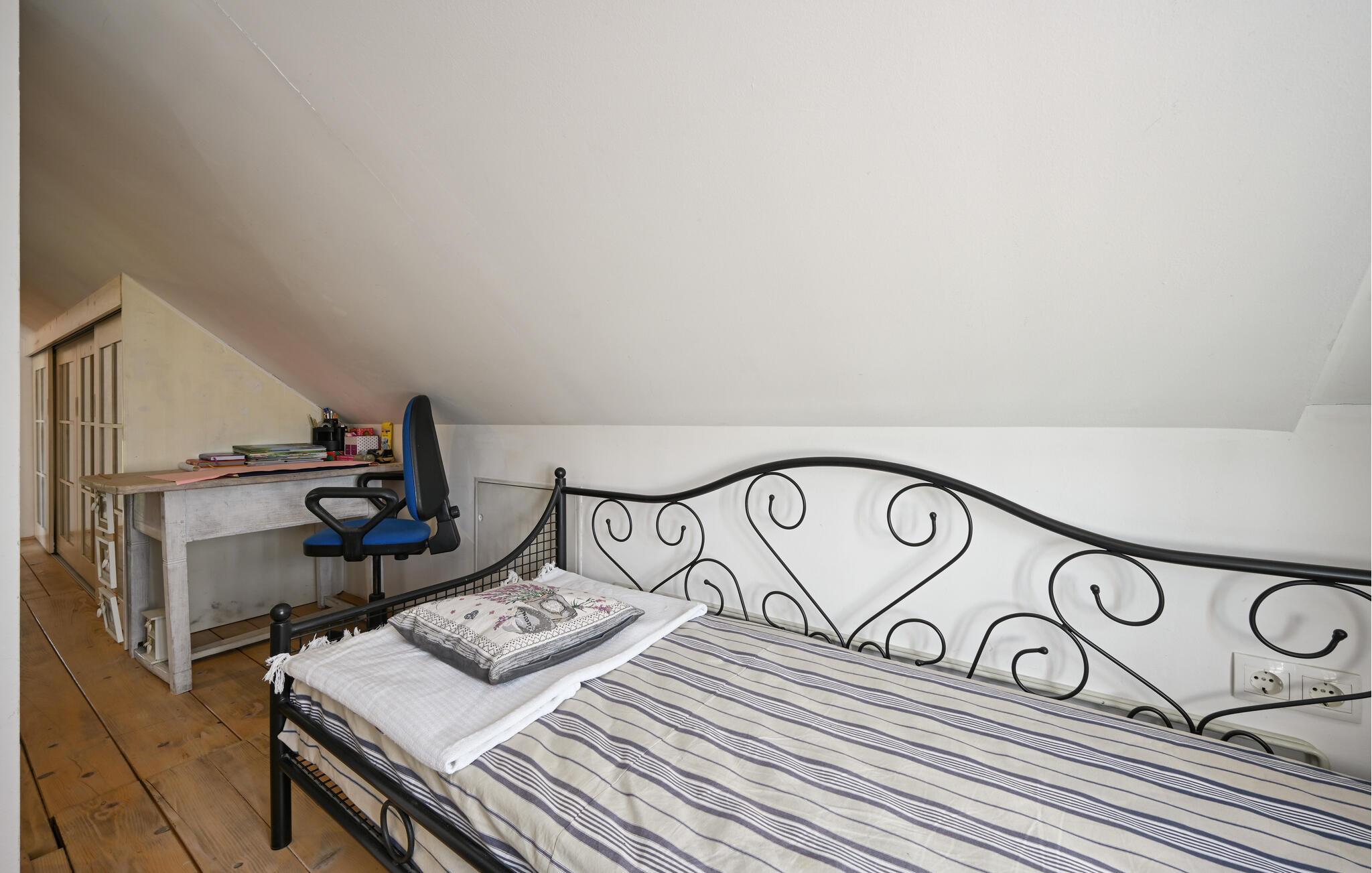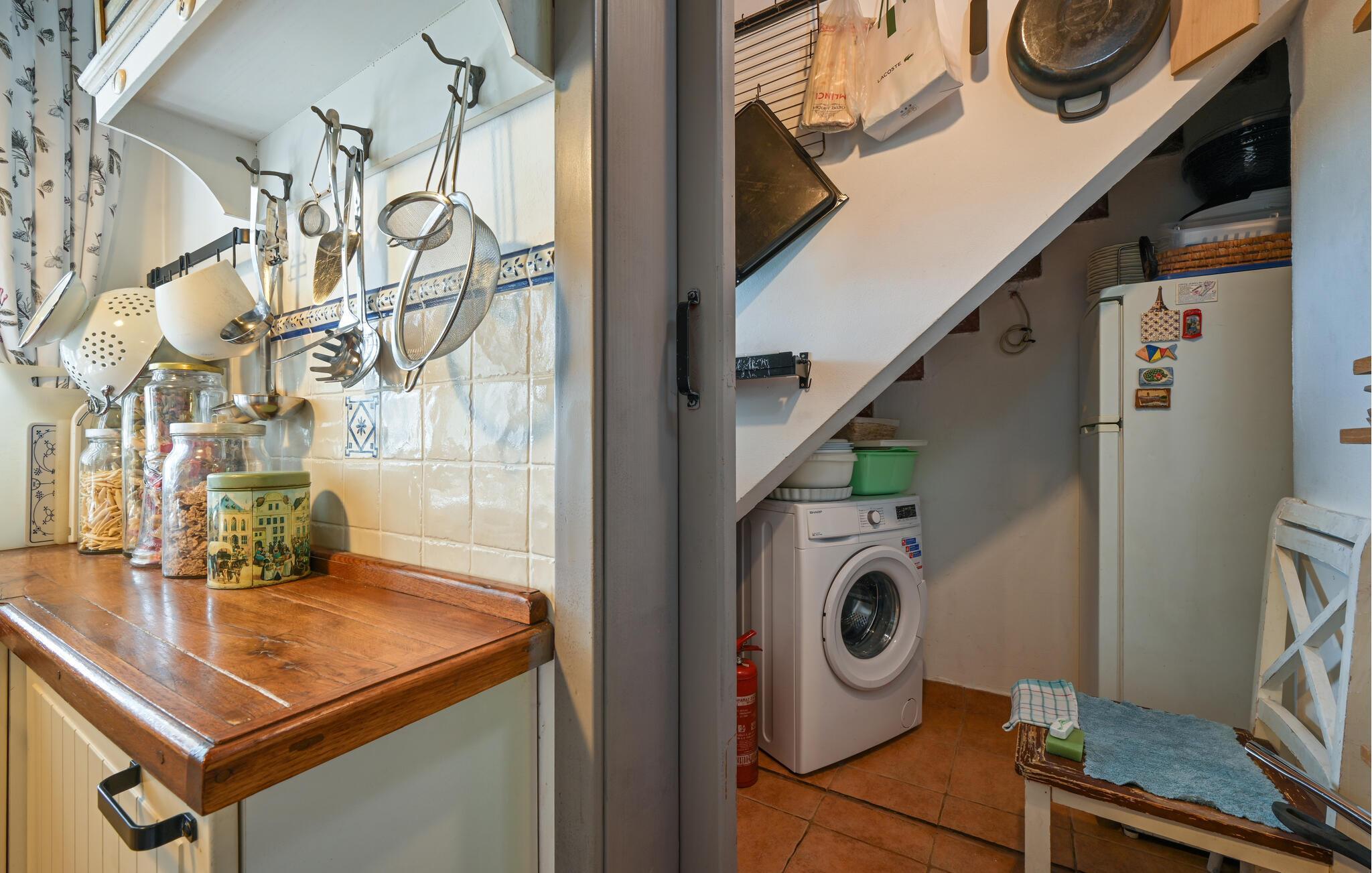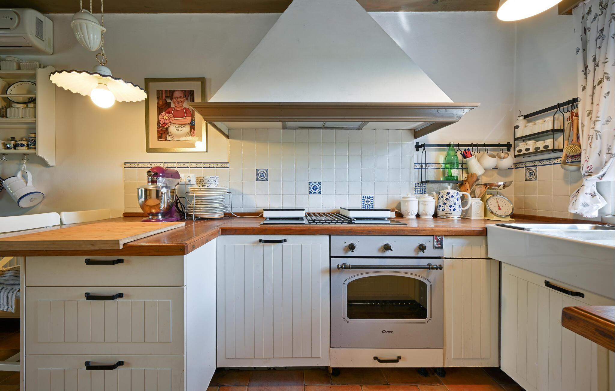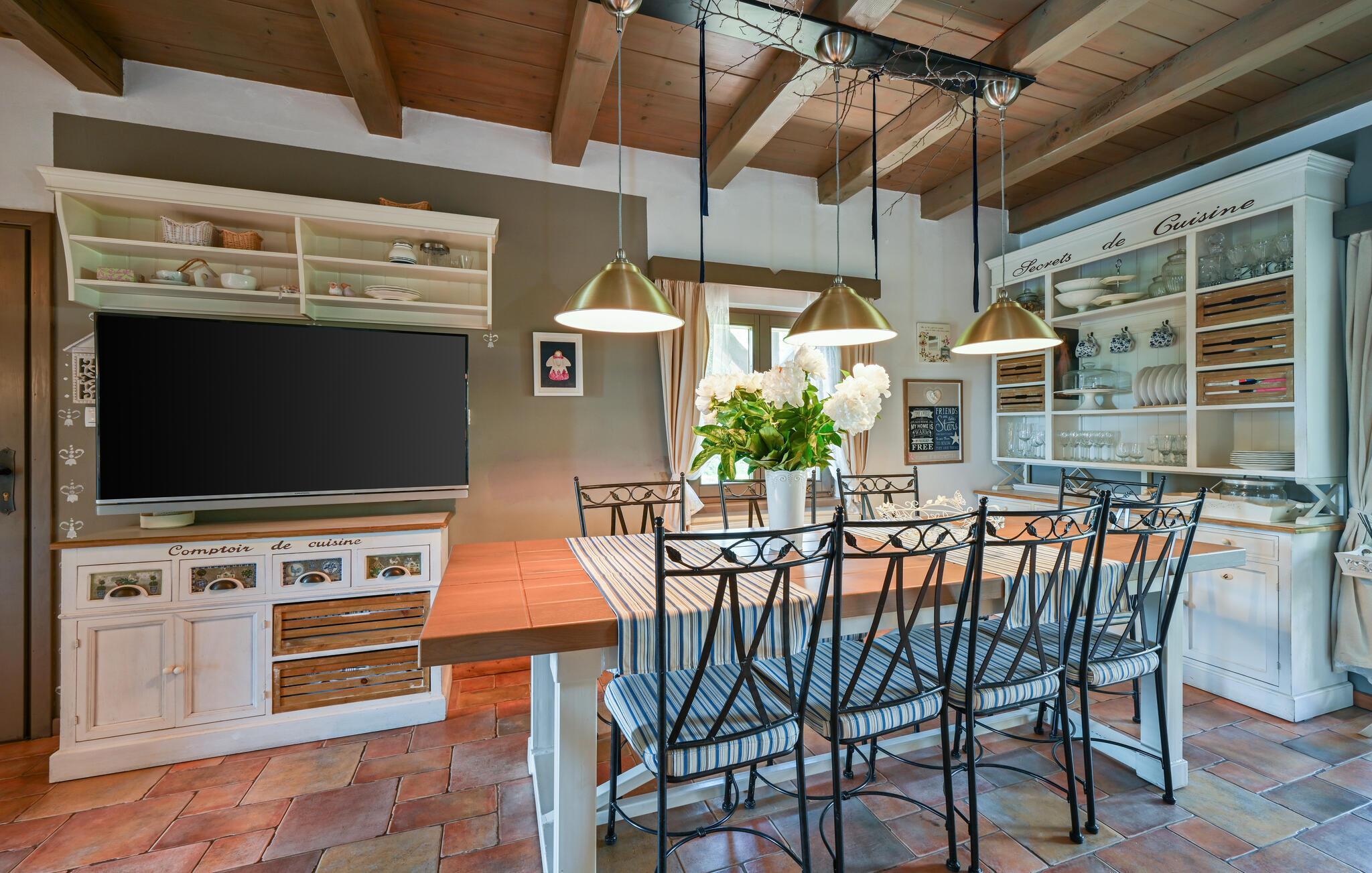 Tilbring en uforglemmelig ferie i et hus, der forener rustik charme med moderne komfort på harmonisk vis. De rummelige værelser imponerer med karakteristiske træbjælkelofter, naturstensvægge og kvalitetsfliser, som tilsammen skaber en varm og indbydende atmosfære. Fordyb jer i en god bog på den hyggelige sofa, tilbered et velsmagende måltid i det moderne køkken, eller afhold en underholdende spilleaften ved det store spisebord.