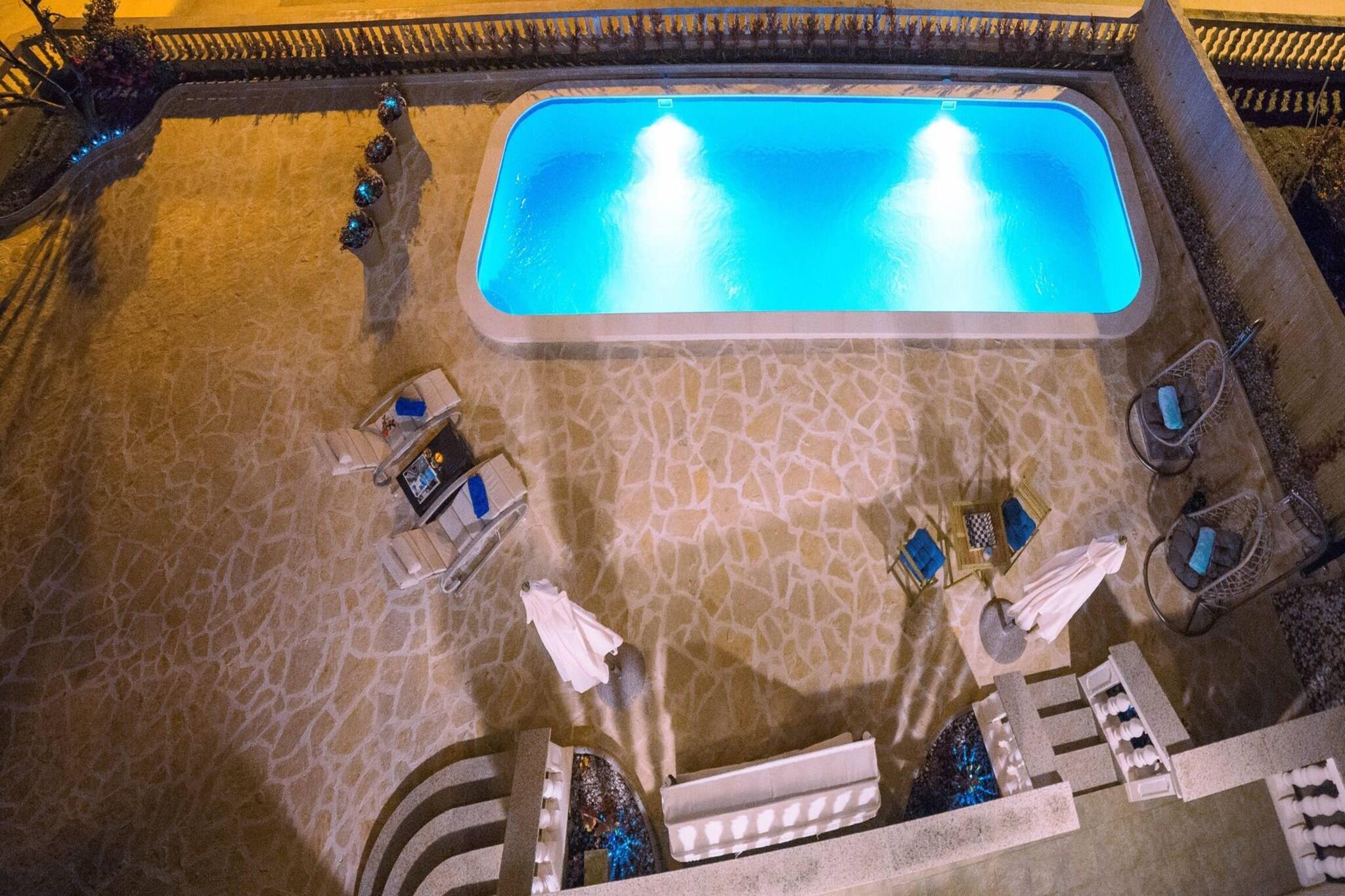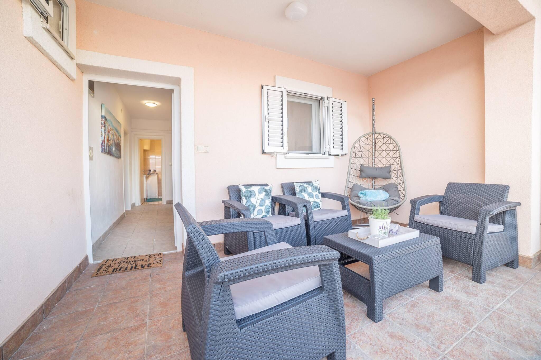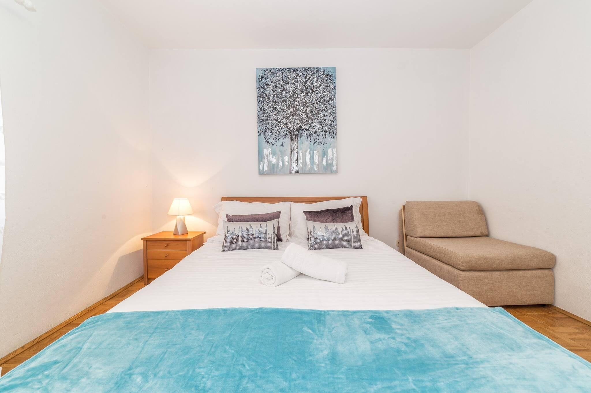 Denne charmerende 2-værelses lejlighed i Vodice er ideel til op til 5 gæster, og tilbyder et komfortabelt og moderne rum kun en kort gåtur fra den smukke Plava Strand. Lejligheden har et fuldt udstyret køkken med væsentlige apparater såsom komfur, køleskab, ovn, opvaskemaskine og kaffemaskine. Gæsterne kan nyde bekvemmeligheden med WiFi, satellit-tv og aircondition. Sovearrangementer inkluderer en queen-size seng, en køjeseng og en sovesofa, hvilket sikrer fleksibilitet for familier eller grupper. Ejendommen tilbyder en privat terrasse og grillplads, perfekt til at nyde måltider udendørs, mens du nyder solen. Den indhegnede grund sikrer privatlivets fred, og til lejligheden hører en privat udendørs parkeringsplads. For ekstra sikkerhed leveres sikkerhedsfunktioner såsom en ildslukker og førstehjælpskasse. Lejligheden er bekvemt beliggende kun 600 meter fra både sand- og klippestrande med nærliggende attraktioner, herunder Ultra Djelo Market, Restaurant Šarm og Beach Bar Samo Pomalo. Krka Nationalpark og Vrana-søen er også inden for rækkevidde. Gæsterne vil have adgang til fælles faciliteter, herunder en swimmingpool (10x3 meter), gårdhave, liggestole, udendørsmøbler og en udendørs bruser. Ejendommen giver en rolig og bekvem base for at udforske den dalmatiske kyst, samtidig med at den tilbyder en blanding af komfort og praktisk. Bemærk venligst, at rygning ikke er tilladt inde i lejligheden, og kæledyr er ikke tilladt. Der opkræves et refunderbart depositum ved indtjekning.