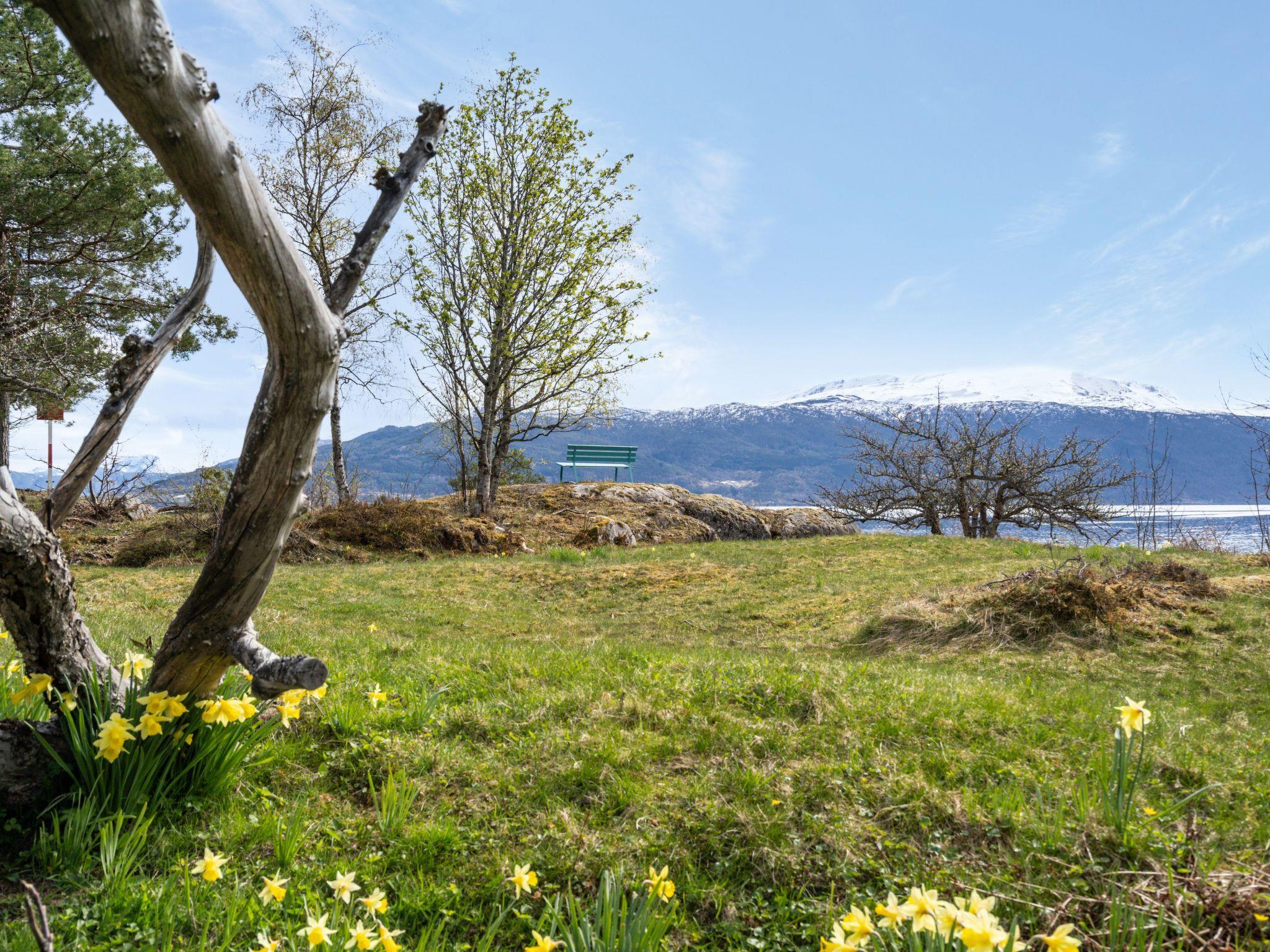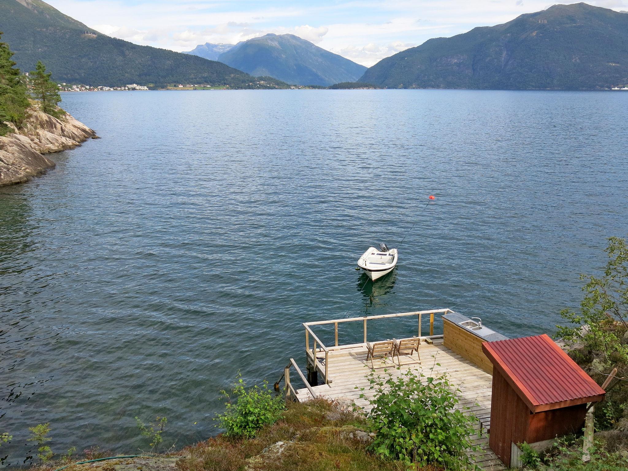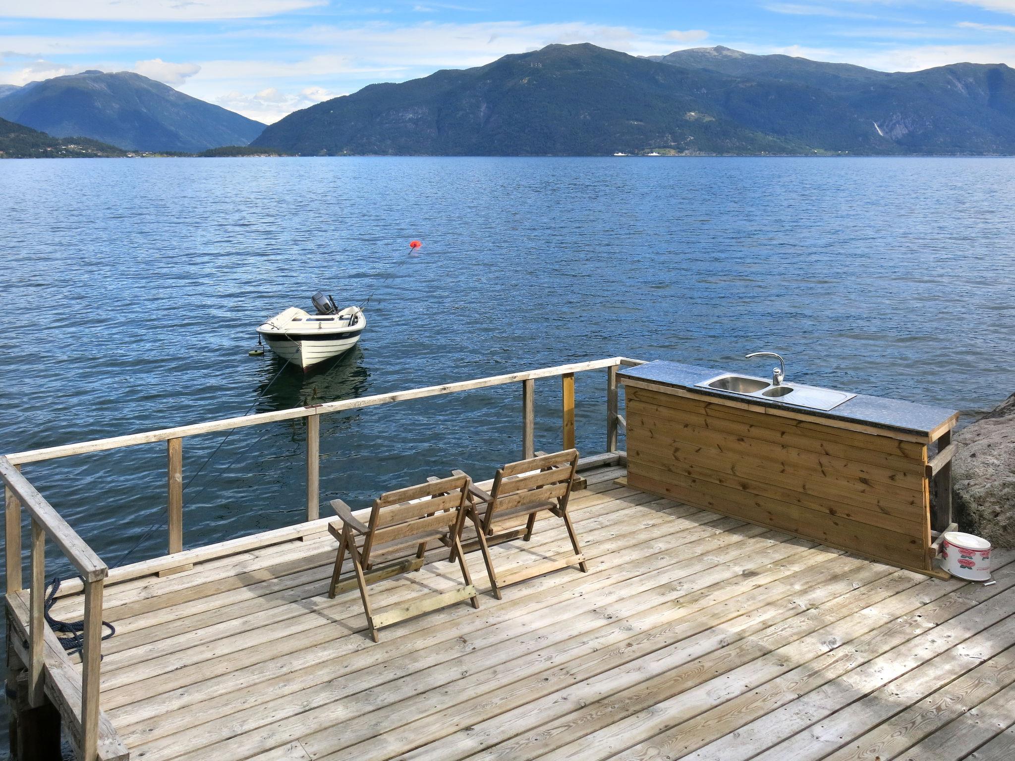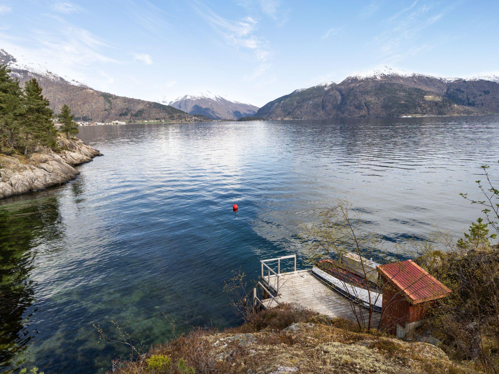 Beautiful cottage "Sandviki", 15 m a.s.l., surrounded by trees. In a hamlet 4 km from the centre of Balestrand, 42 km from the centre of Høyanger, 49 km from the centre of Sogndal, 50 m from the sea, in a cul-de-sac. Private: natural state property with meadow. Available: boat (extra). 100 m long motor access (via unmade road). Parking on the premises. Supermarket 4 km, bus stop "Thue" 450 m, railway station "Bergen" 196 km, ferry "Bergen" 196 km, sandy beach "Balestrand" 4 km. Please note: private mooring.