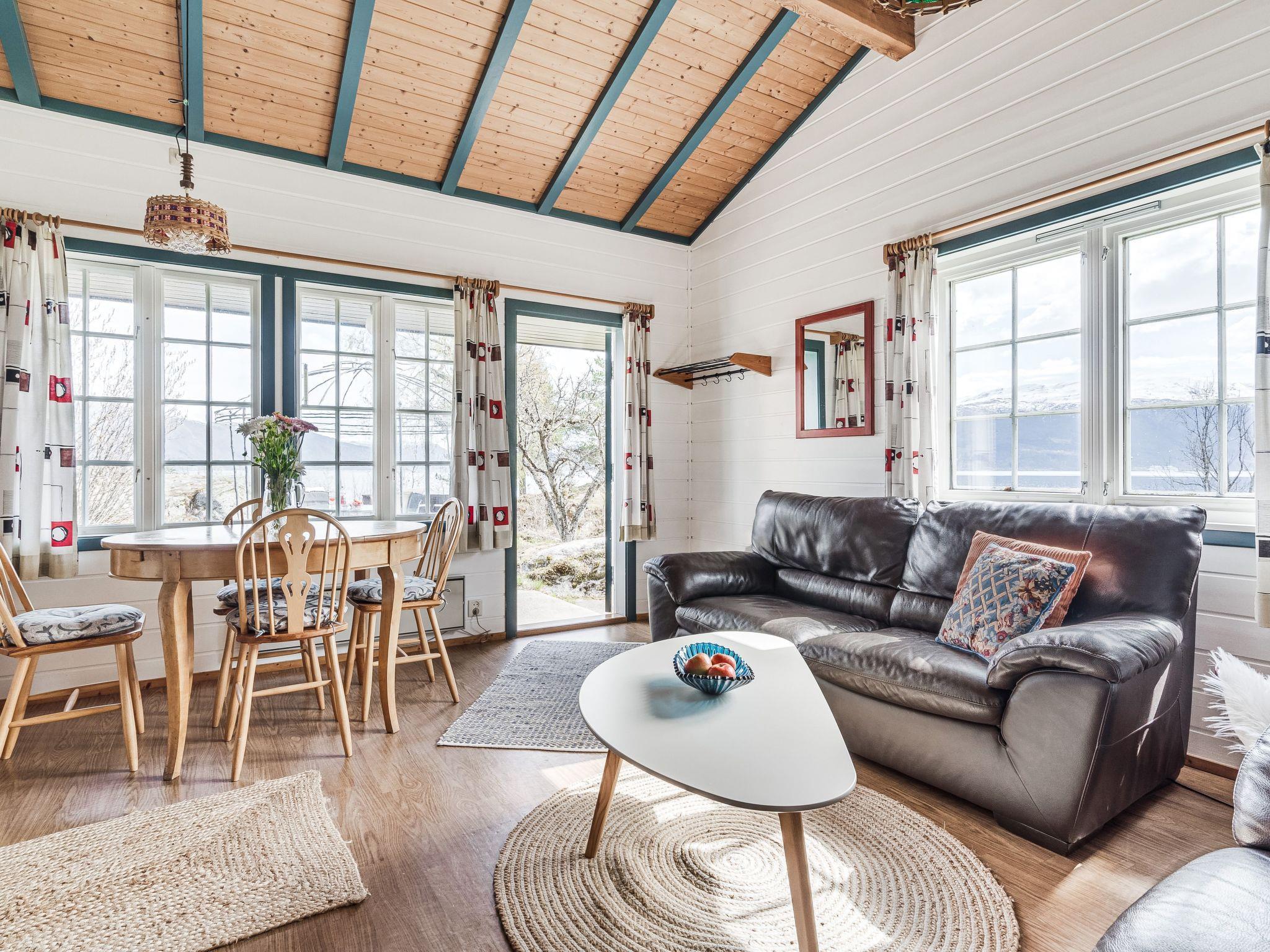 "Sandviki", 3-room house 42 m2. Cosy furnishings: living/dining room with Scandinavian wood stove, dining table, satellite TV and international TV channels. Exit to the terrace. 1 room with 1 double bed (150 cm, length 200 cm). 1 room with 2 beds (80 cm, length 200 cm). Open kitchen (4 hot plates, mini-oven, dishwasher, microwave, freezer, electric coffee machine). Shower/WC. Electric heating. Terrace 20 m2, patio. Terrace furniture, barbecue. View of the sea, the mountains and fjord. Facilities: washing machine, iron, children's high chair, baby cot. Internet (WiFi, free). Please note: non-smokers only. Maximum 2 pets/ dogs allowed. 924531169