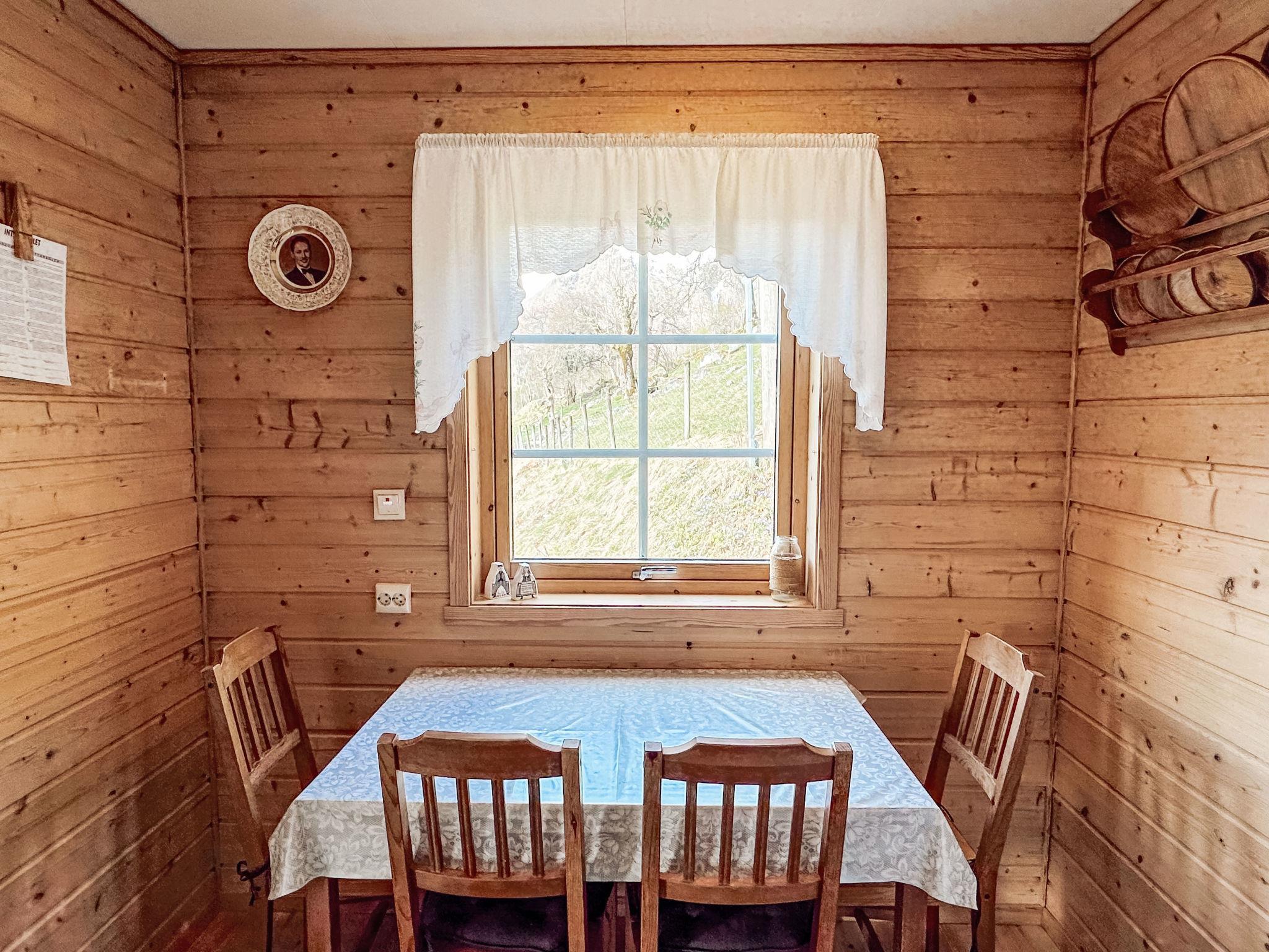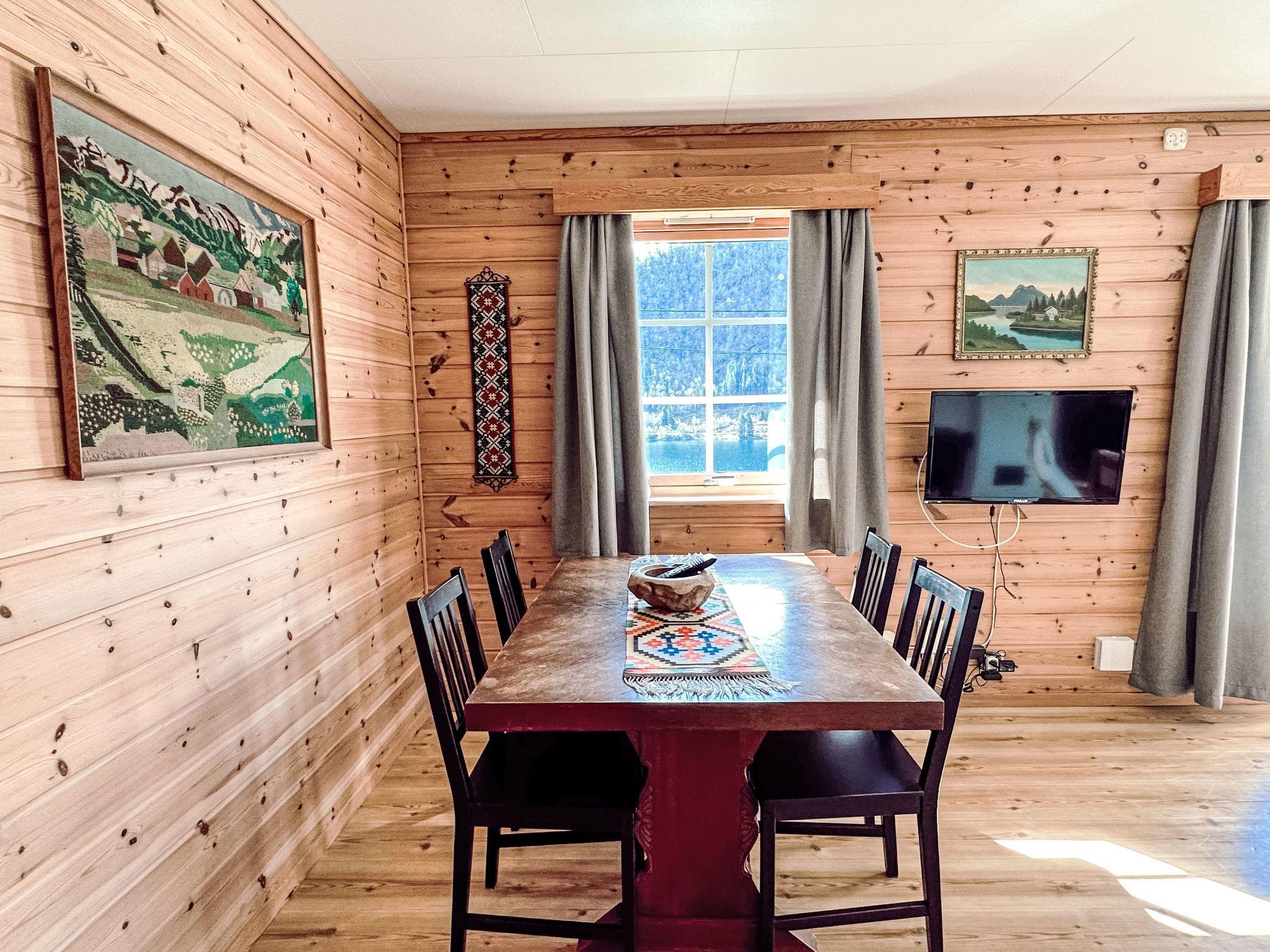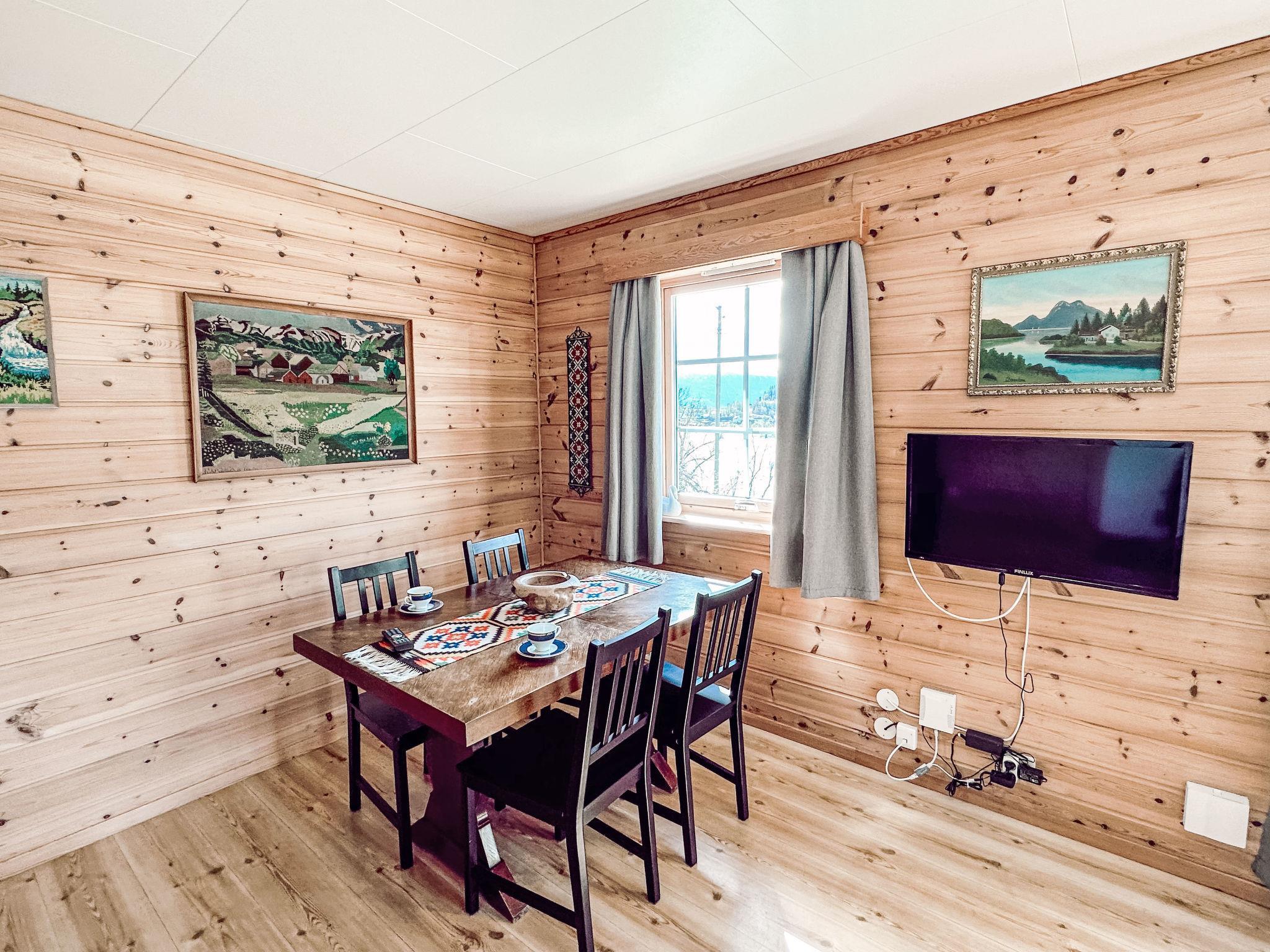 "Pærehagen", 3-room cottage 69 m2. Cosy and wooden furniture furnishings: living/dining room with Scandinavian wood stove, dining table and TV. Exit to the terrace. 1 room with 1 double bed (150 cm, length 200 cm). 1 room with 2 beds (75 cm, length 190 cm). Kitchen (4 hot plates, oven, toaster, kettle, microwave, freezer, electric coffee machine) with dining table. Shower/WC. Electric heating, underfloor heating. Terrace. Terrace furniture, barbecue (portable), box-room. Very beautiful view of the sea, the mountains, the countryside and fjord. Facilities: washing machine. Internet (WiFi, free). Please note: non-smoking house. Freezer approx. 300 l. TV via casting. 924531169