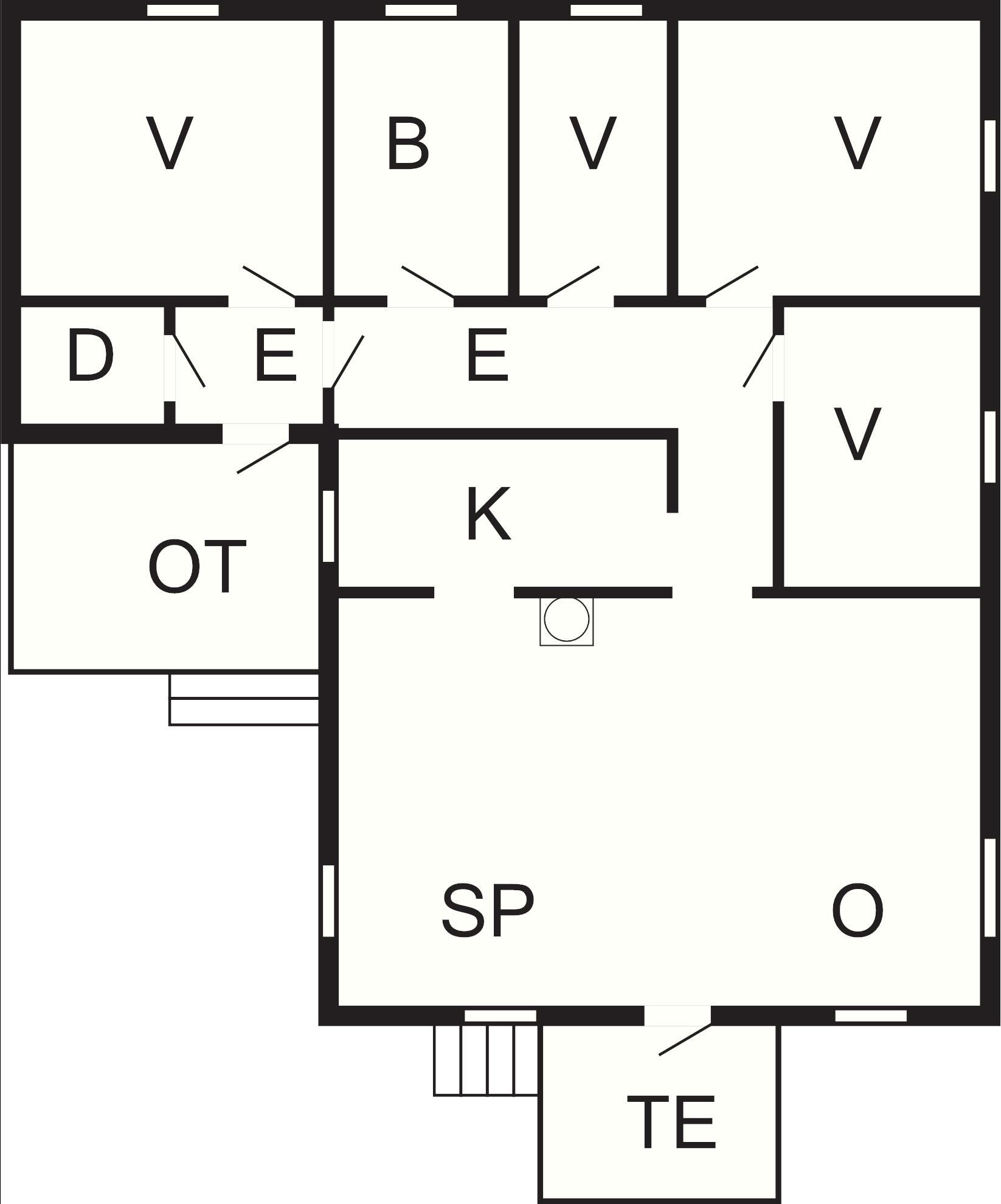 Feriehuset har en romslig stue med en stor murt peis og vedovn midt i stuen. Fra stuen er det dør ut til en liten altan. Det er et lite kjøkken, 4 soverom og bad med dusj i feriehuset. På det minste soverommet er det køyeseng for 2 personer. Ved feriehusets inngang er det en overbygd altan med utemøbler.