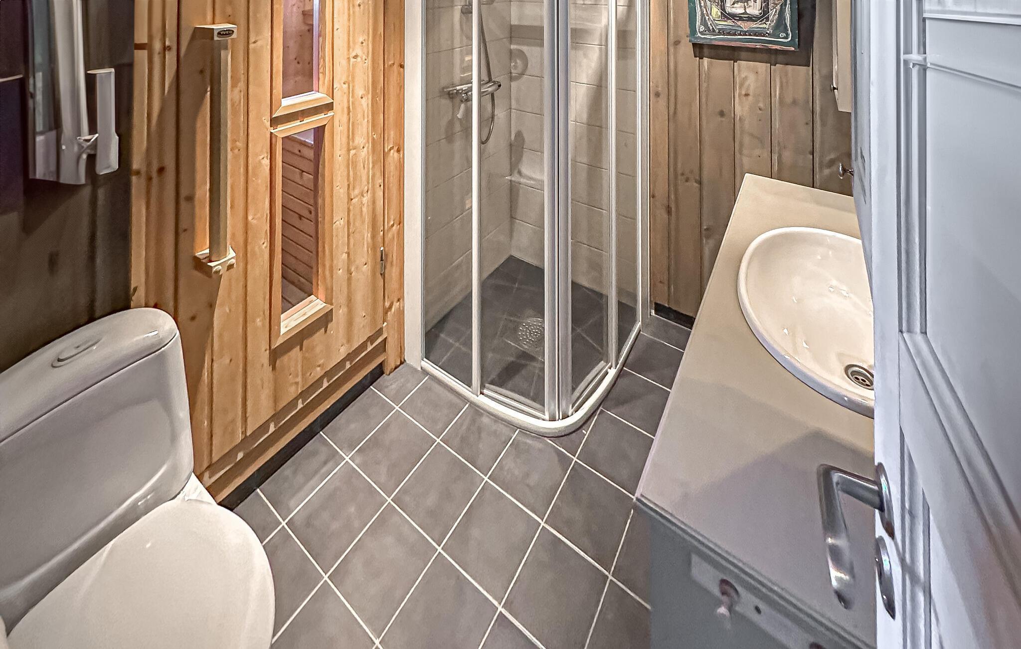 Dette fortryllende feriehus, som smelter harmonisk ind i det omgivende landskab med sit specielle tag, giver jer en fabelagtig udsigt over de majestætiske bjerge og de frodige grønne skove, der omgiver dette hyggelige hjem. Begynd jeres dage med en hyggelig morgenmad i den rummelige opholdsstue, som har en skøn stemning med varme træpaneler og den imponerende pejs. Brug det veludstyrede køkken til at lave mad sammen med hele familien. Den stilfulde indretning og de fine detaljer gør hvert øjeblik i dette hus til en særlig oplevelse.