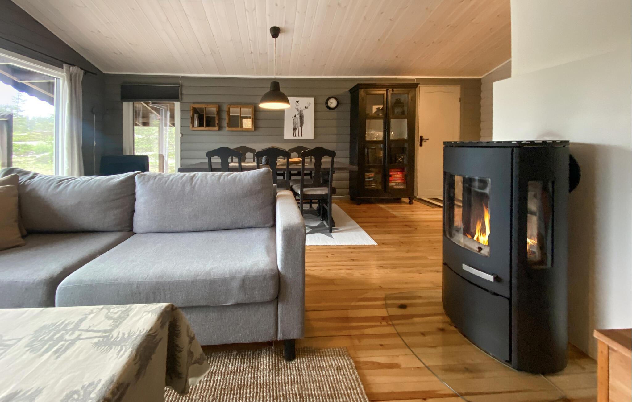 Huset er perfekt til et afslappende ophold: Gulv-til-loft-vinduer lukker masser af lys ind i de hyggelige værelser og tilbyder udsigt over det smukke landskab. Rustikke træmøbler og komfortable sofaer skaber en hyggelig atmosfære, hvor I kan fordybe jer i jeres ferielæsning eller jeres yndlingsmusik. I køligt vejr kan I tænde pejsen og læne jer tilbage og slappe af med et glas vin.