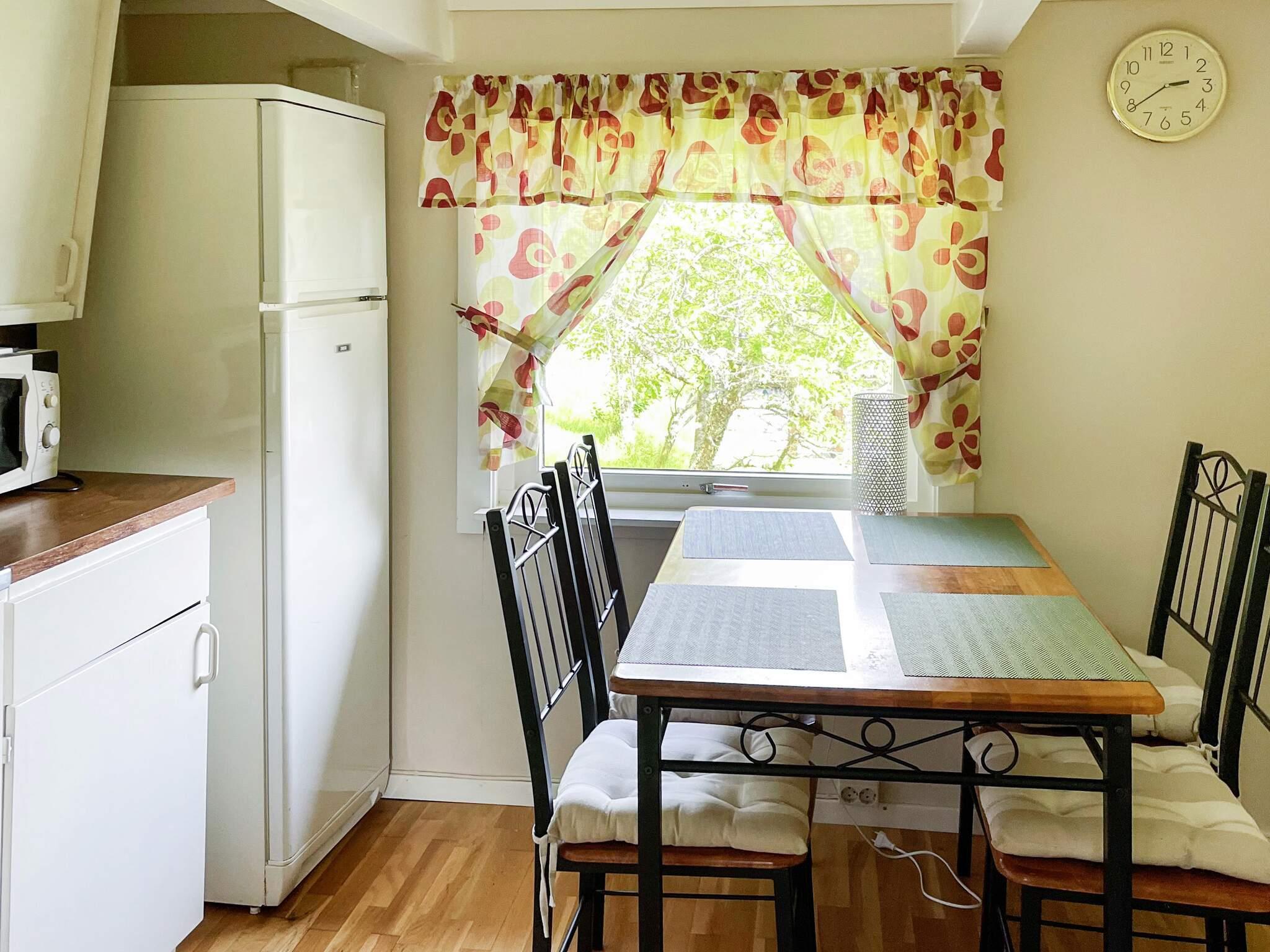 Feriehuset har separat kjøkken og peisovn i stuen.