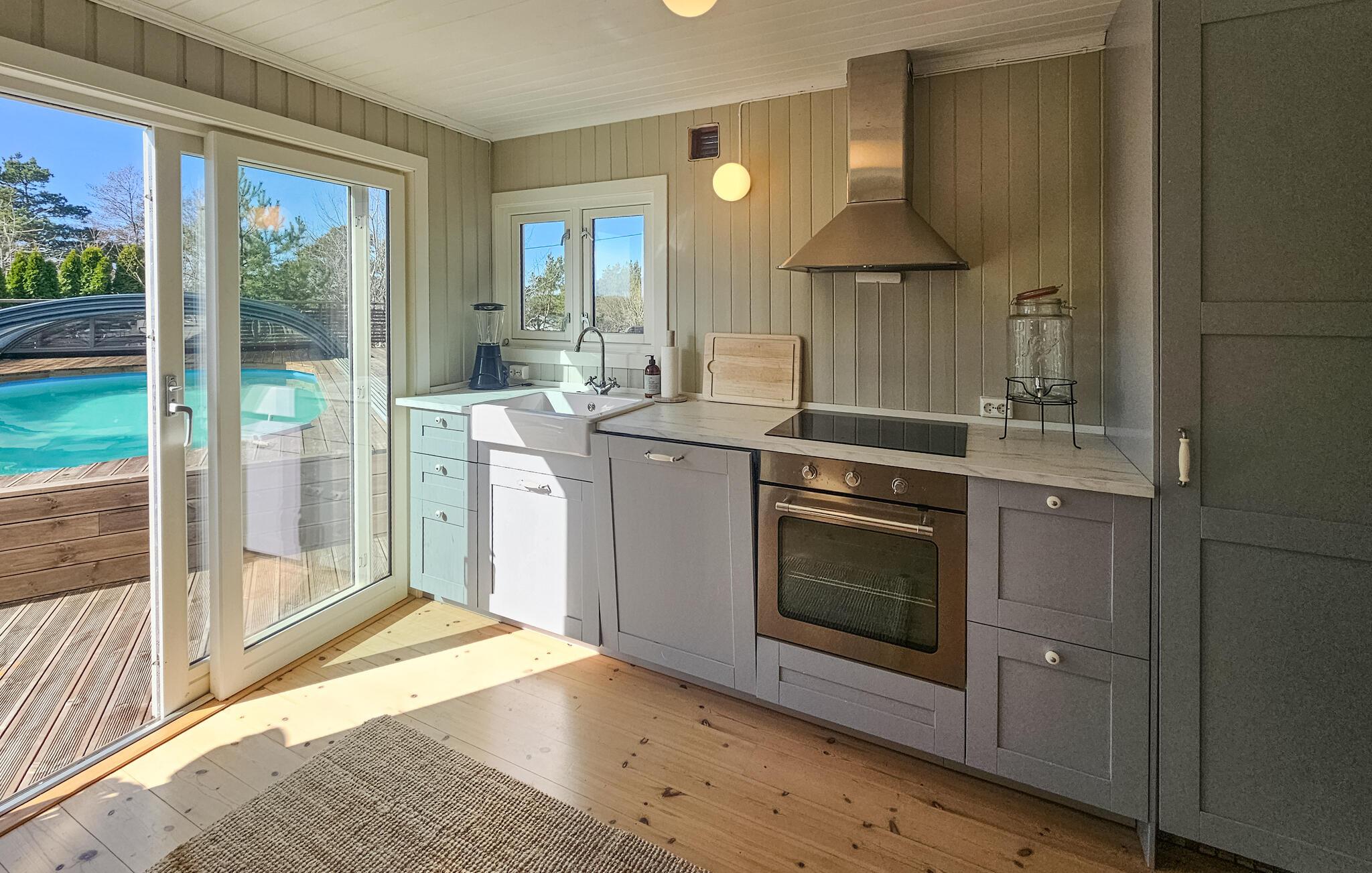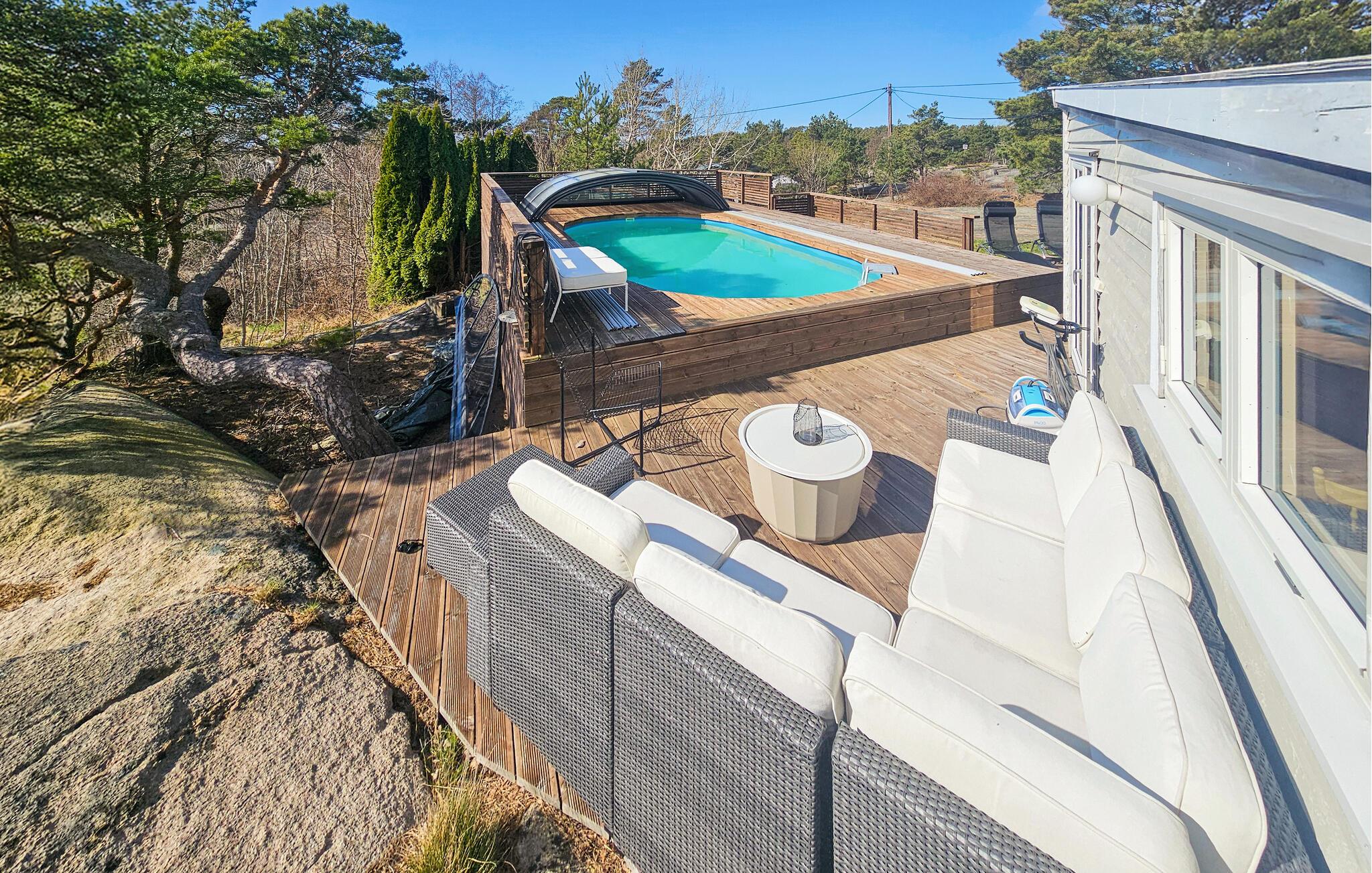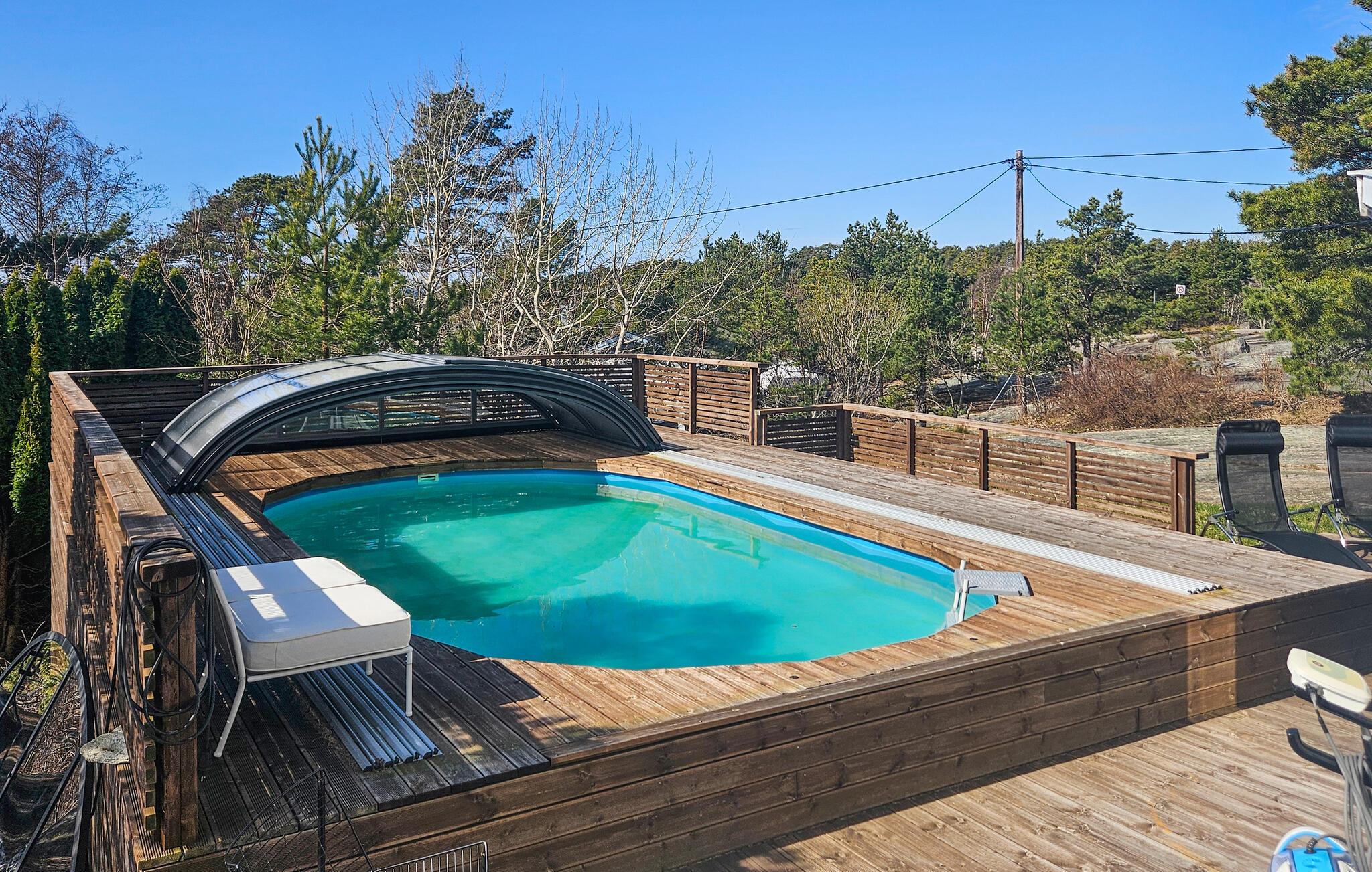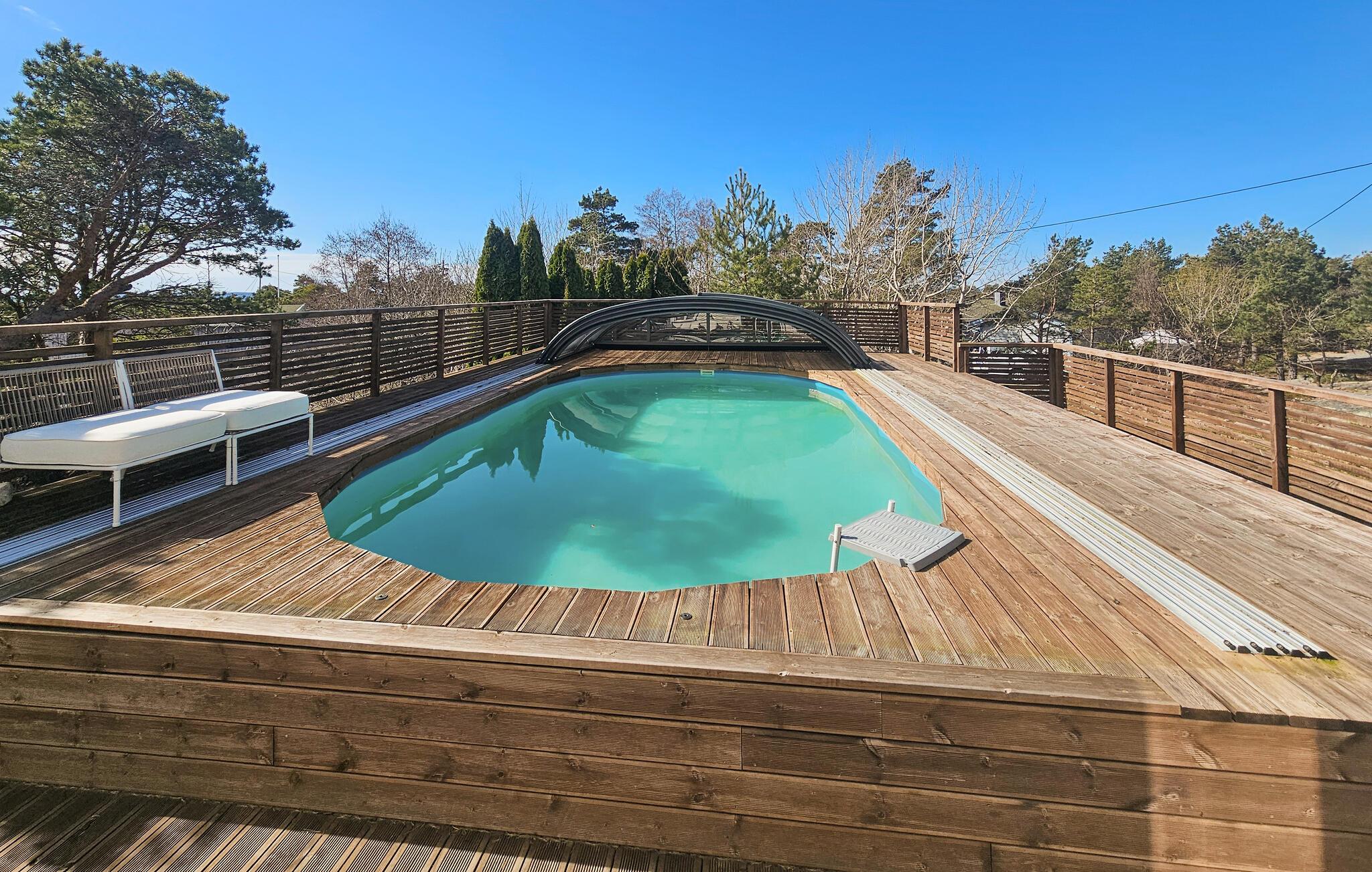 Nyd afslappende dage i dette komfortable feriehus med udsigt over poolen og fjorden.