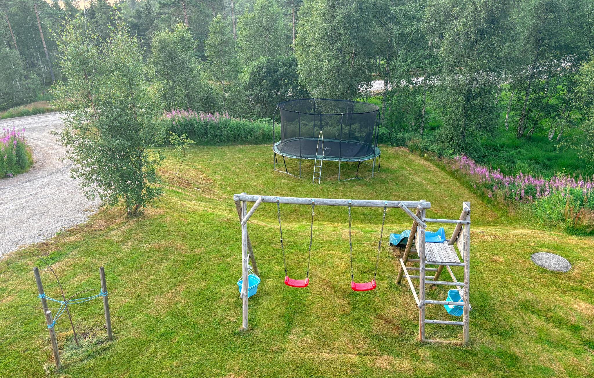 Det skønne feriehus er et sandt paradis for en børnefamilie, der gerne vil nyde familietid sammen i naturen. Huset emmer af hygge, og her vil I alle føle jer hjemme. Især udendørsområdet byder på mange gode hjørner. Der er masser at lege med for jeres børn. Gynge, legehus, trampolin - alt er på stedet! En overdækket terrasse med grillfaciliteter giver jer et dejligt sted til timerne udendørs, for her kan I se søen, mens I spiser middag sammen.