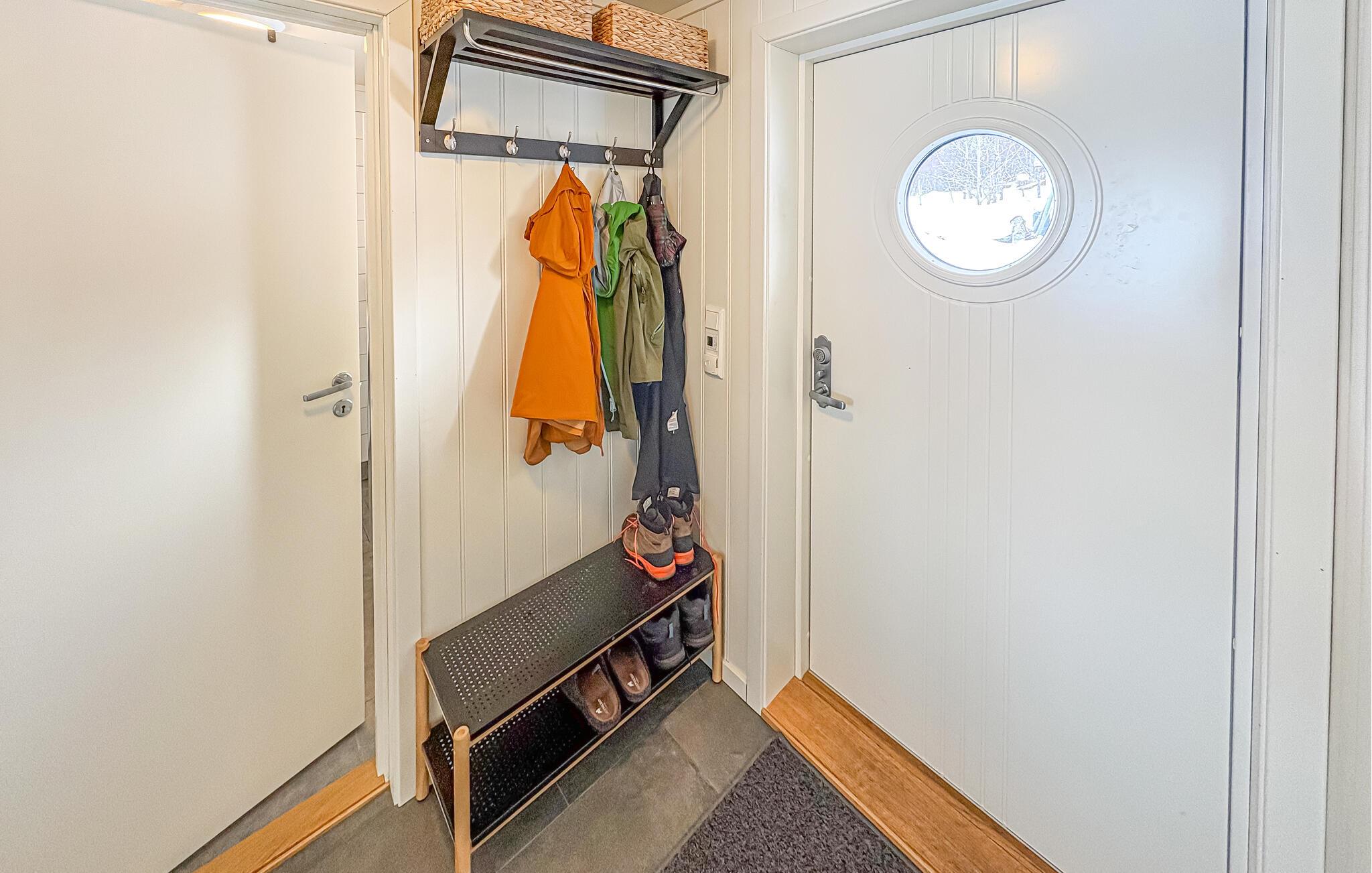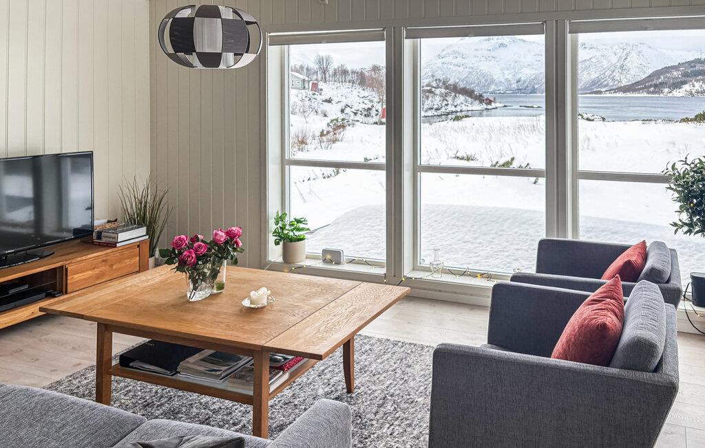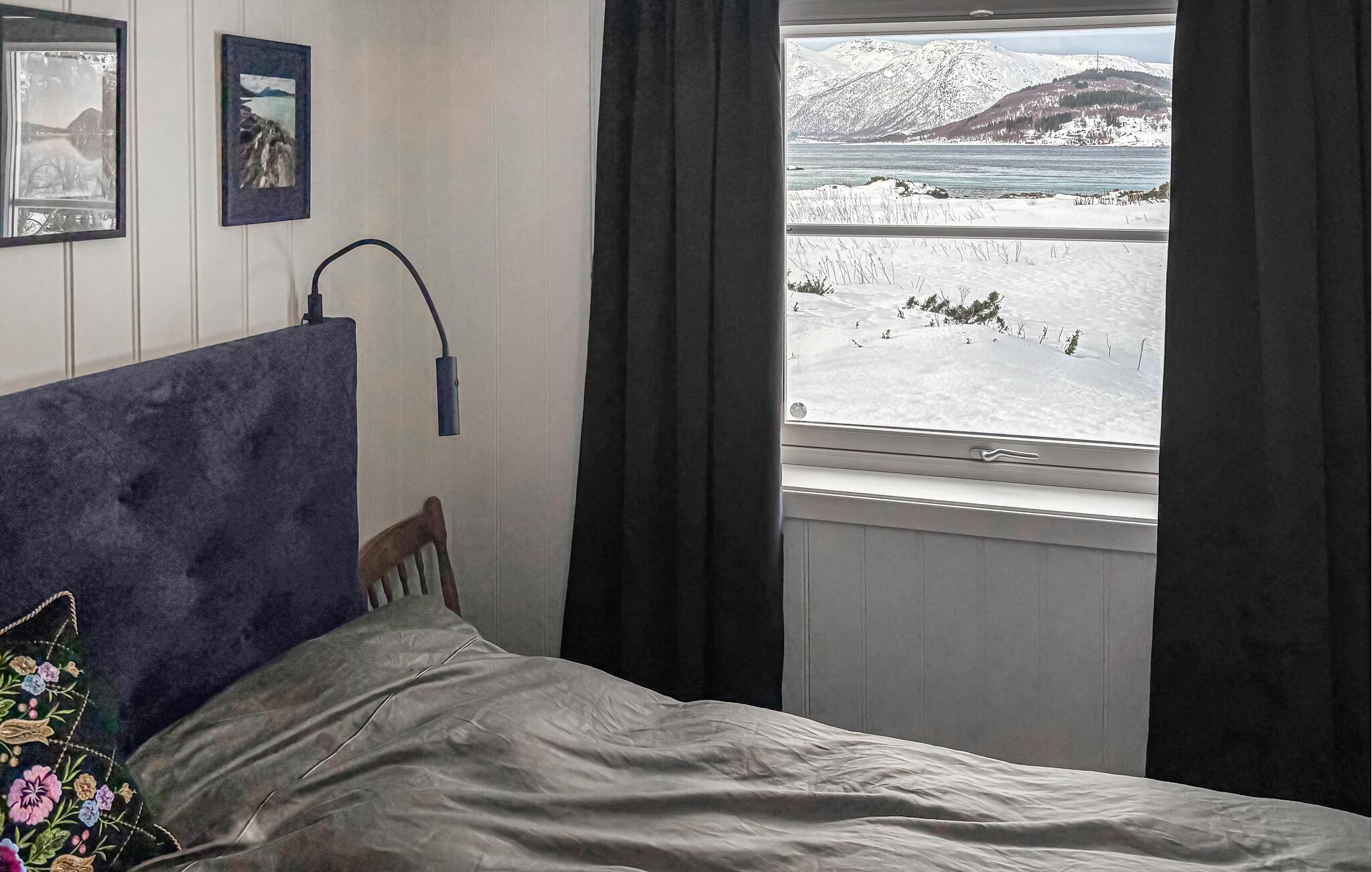 Sæt jer godt til rette i sofaen eller en af ??de komfortable lænestole og nyd udsigten over vandet og bjergene gennem vinduerne fra gulv til loft. Det skandinavisk inspirerede interiør med lyse trævægge skaber en rolig og harmonisk atmosfære. find sammen omkring sofabordet til en spilleaften eller se en film. Den tilstødende spiseplads med træbord tilbyder plads til fælles måltider med udsigt. Dæk bordet, åbn terrassedørene og lad den friske havluft komme ind.