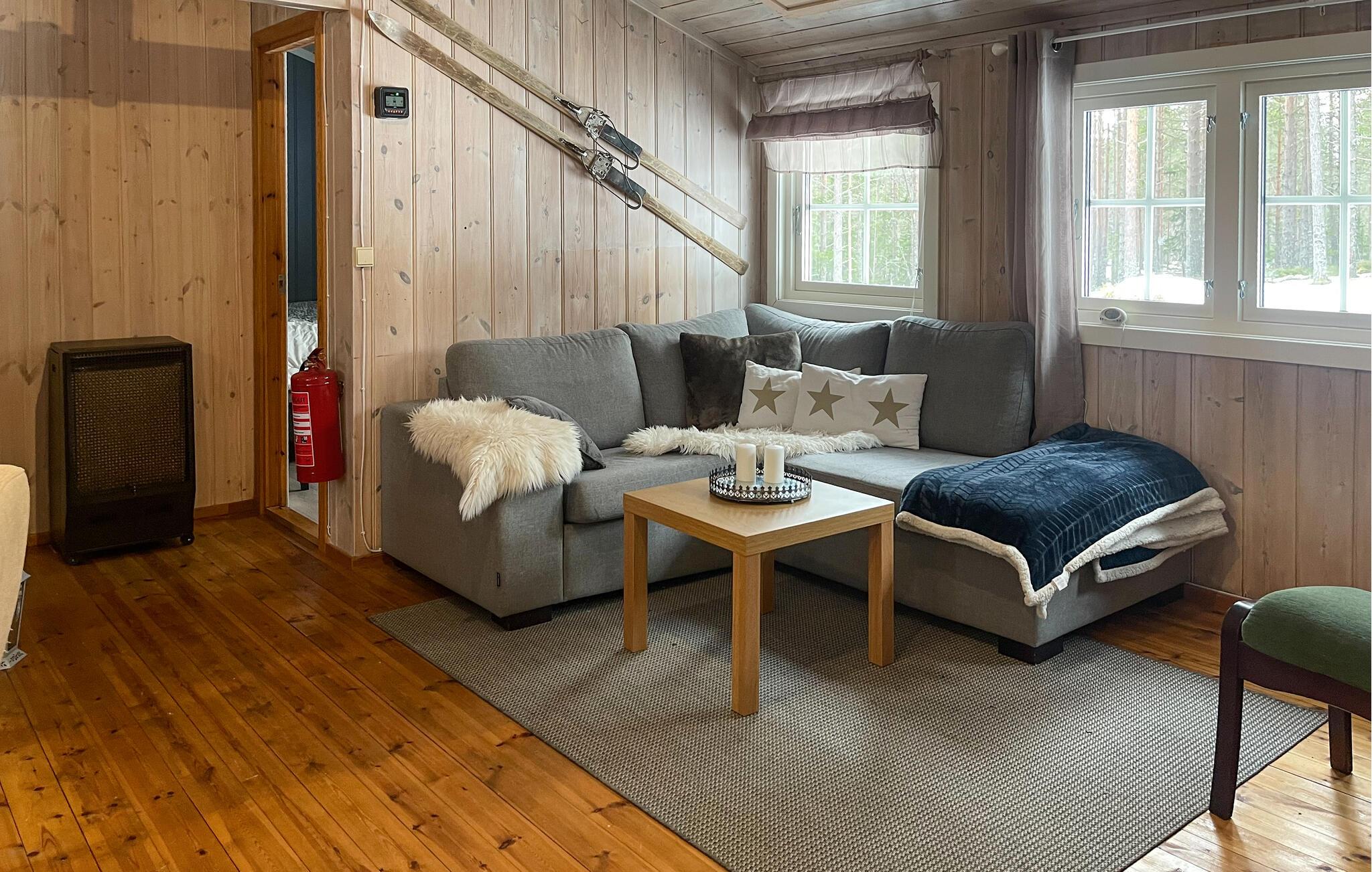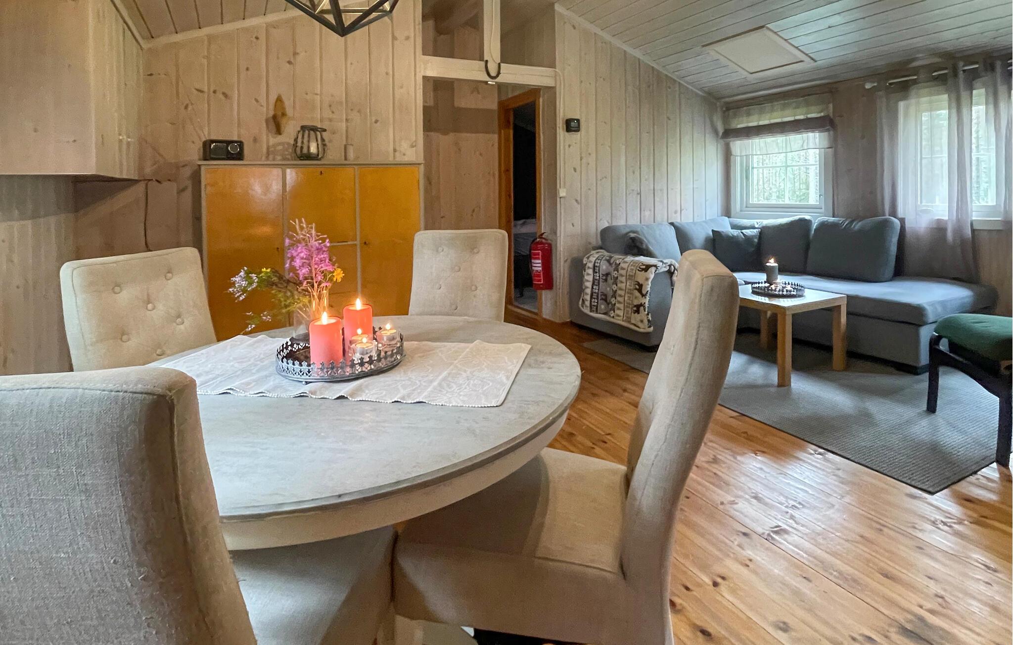 Oplev en timeout uden travlhed - autentisk, tæt på naturen og afslappende - og tilbring afslappende dage i denne rustikke feriehytte ved Holmsjøen. Nyd fred, afsondrethed og enkelheden ved et ophold midt i den norske natur. Find jer godt til rette i det komfortabelt møblerede interiør. Slap af i det hyggelige sofahjørne med udsigt til skoven, varm jer ved brændeovnen og nyd den beroligende atmosfære i jeres træhytte. Stuen lægger op til rolige aftener med at lege, læse eller sludre ved spisebordet.