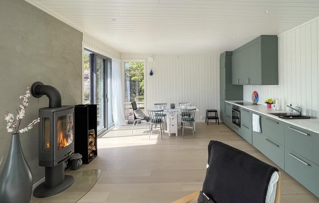 Dette moderne feriehus giver jer en fantastisk beliggenhed lige ved vandet, omgivet af majestætiske klipper og tætte skove. Begynd jeres dage med morgenmad på den store terrasse, mens I stirrer ud over den stille bugt. Feriehuset er noget helt særligt på grund af sin smagfulde, moderne indretning. Glæd jer til den hyggelige stemning i den åbne opholdsstue, som lukker masser af lys ind gennem de store vinduespartier og giver jer følelsen af at være midt i naturen. Mens aftenen er kølig, kan I krølle jer sammen ved pejsen og slappe af efter en dag med udforskning.