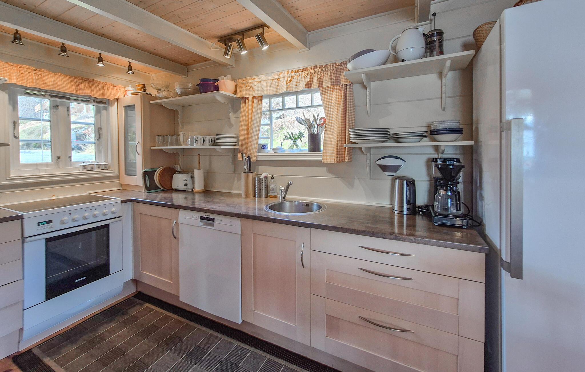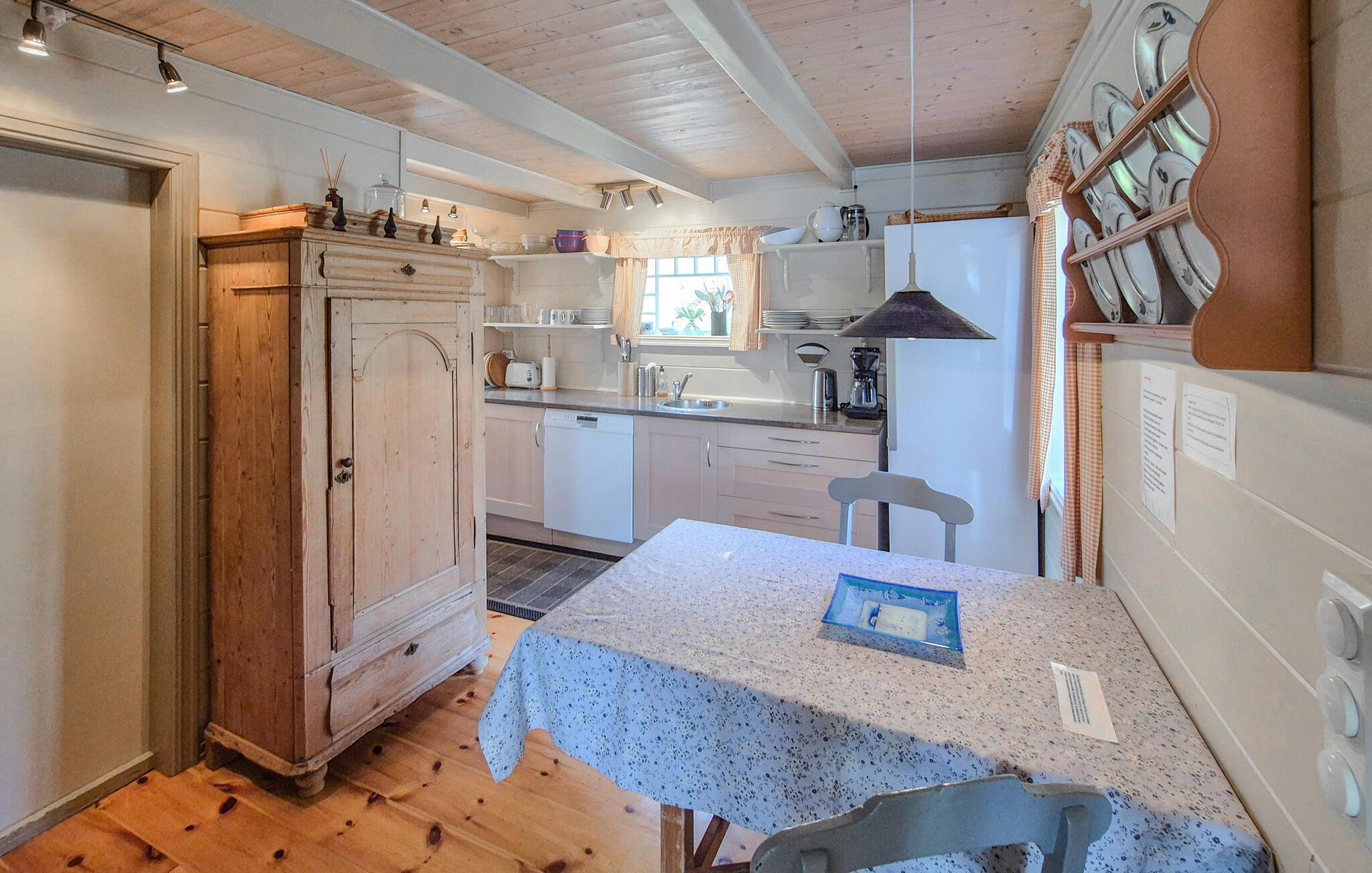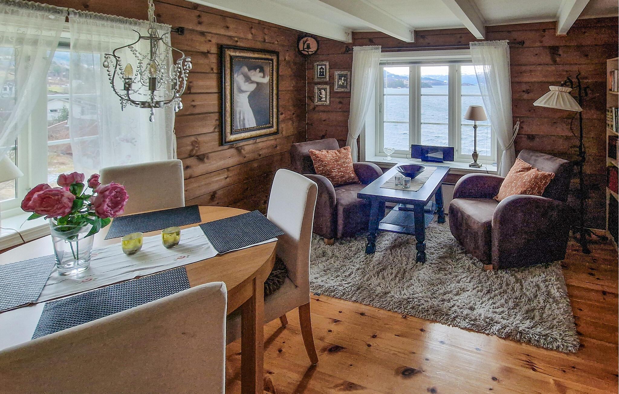 Nyd afslappende dage i jeres moderniserede, men autentiske feriehus med udsigt over Høylandssundet. Bliv fortryllet af de idylliske omgivelser og nyd naturens fred og ro lige ved fjorden. Træd ind i den hyggelige stue med varme trævægge og kærligt udvalgte møbler. Find jer godt til rette i det hyggelige siddeområde eller nyd afslappende aftener med en lækker middag foran pejsen. Det tilstødende køkken giver mulighed for at lave mad sammen.