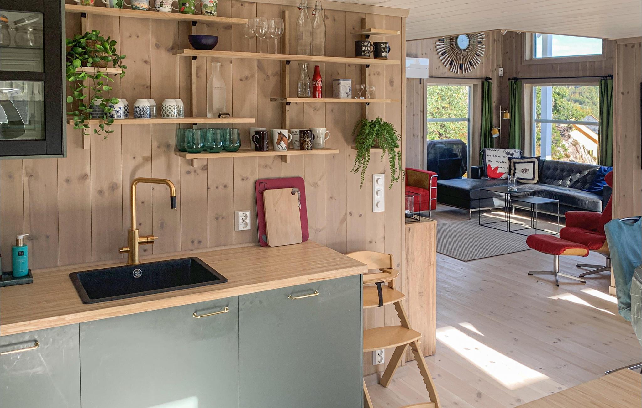 På en dejlig beliggenhed ved fjorden byder dette store, charmerende feriehus jer velkommen. Det lyse, moderne interiør giver et velholdt og smagfuldt uddtryk. Hvis I leder efter fred og ro og nærhed til naturen, er I kommet til det rette sted. Tilbring afslappende timer i de forskellige hyggelige hjørner i huset og varm jer foran brændeovnen eller i saunaen om vinteren. Den høje beliggenhed giver jer en fantastisk udsigt over fjorden.