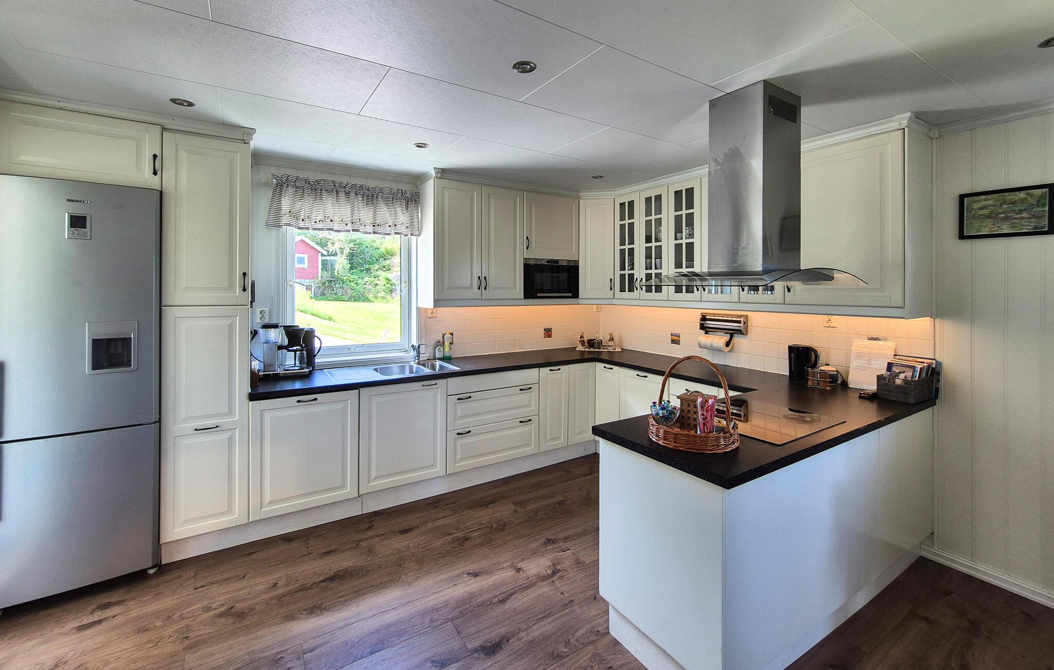 Dette hyggelige hus er som skabt til en afslappende pause fra hverdagen. Masser af varmt træ, komfortable sofaer og et moderne køkken skaber en atmosfære, hvor I hurtigt kan slappe af og få ny energi. Smukke detaljer giver det hele et personligt præg. Slap af med en kop kaffe i sofaen, eller tilbered lækre måltider sammen til hele familien.
