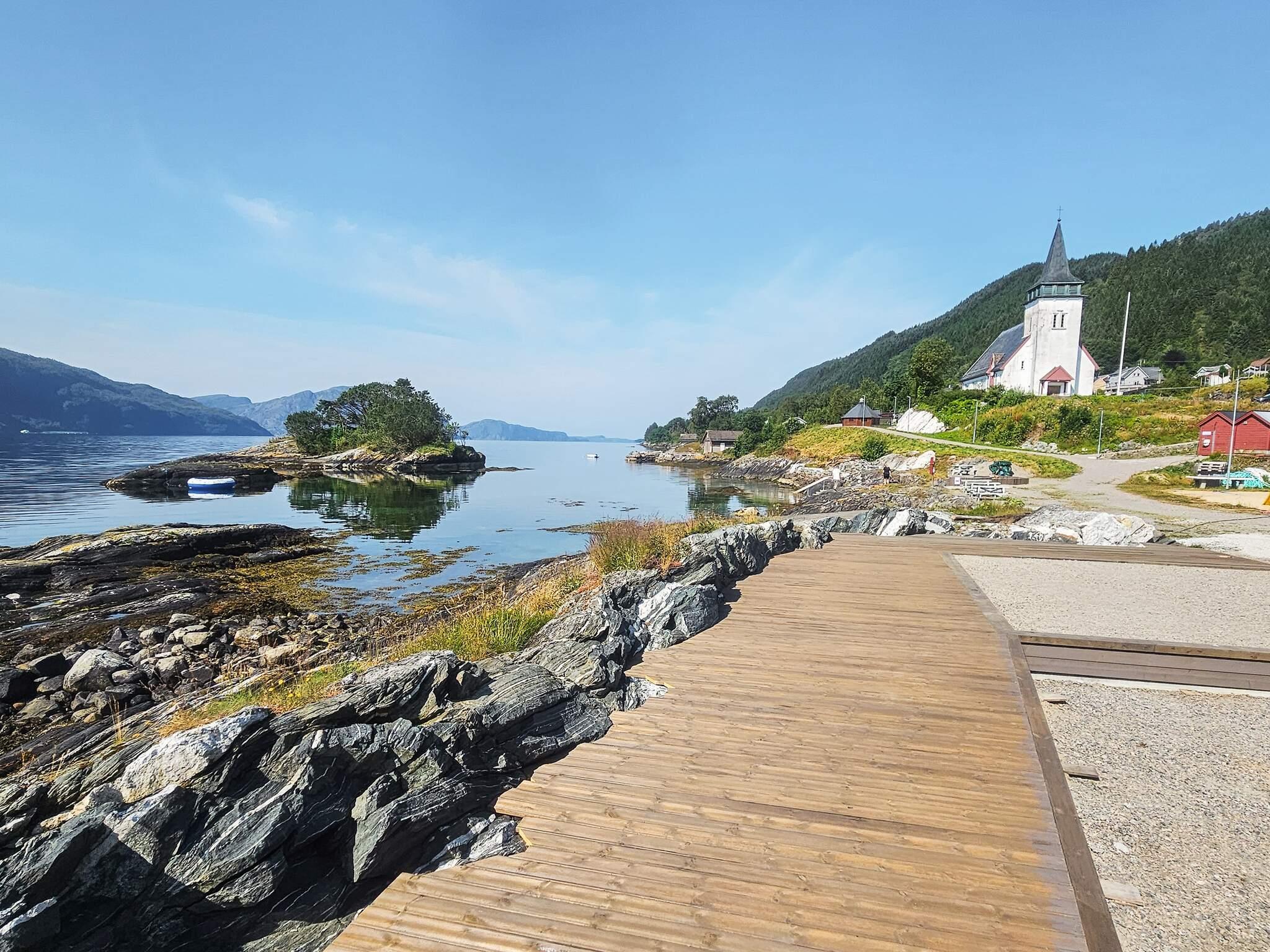 Her kan du sitte på terrassen og nyte den fantastiske panoramautsikten mot fjorden, øyene og fjellene. Ca 100 m fra feriehuset til en fin liten strand med svaberg på land og sand i sjøen. Toalett, benker og bord i tilknytning til badeplassen, samt en grill. Det er 50 m til resepsjonen med personell som snakker tysk og engelsk. Innendørs sløyerom for fisk og fryser tilgjengelig.