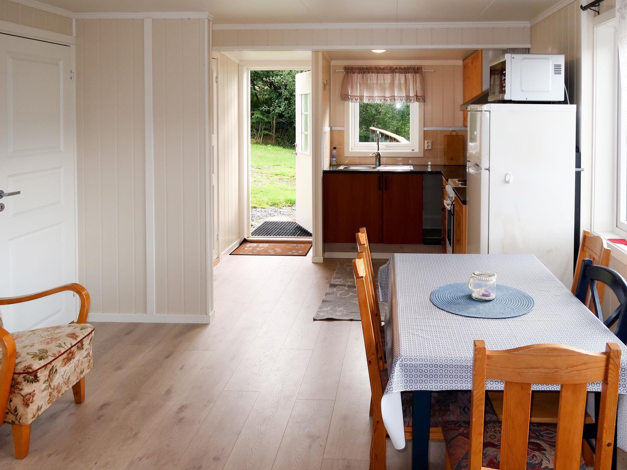 "Solbris", 3-room house 46 m2. Partly renovated in 2016, cosy furnishings: living/dining room with dining table, satellite TV and international TV channels. Exit to the terrace. 1 room with 1 double bed (150 cm, length 200 cm). 1 room with 1 double bed (120 cm, length 200 cm). Open kitchen (4 hot plates, toaster, kettle, microwave, freezer, electric coffee machine). Shower/WC. Electric heating. Terrace. Terrace furniture, barbecue (portable), box-room. View of the sea and fjord. Facilities: washing machine, children's high chair, baby cot. Internet (WiFi, free). Please note: maximum 1 pet/ dog allowed. Smoke alarm, fire extinguisher. Freezer approx. 350 l. 924531169