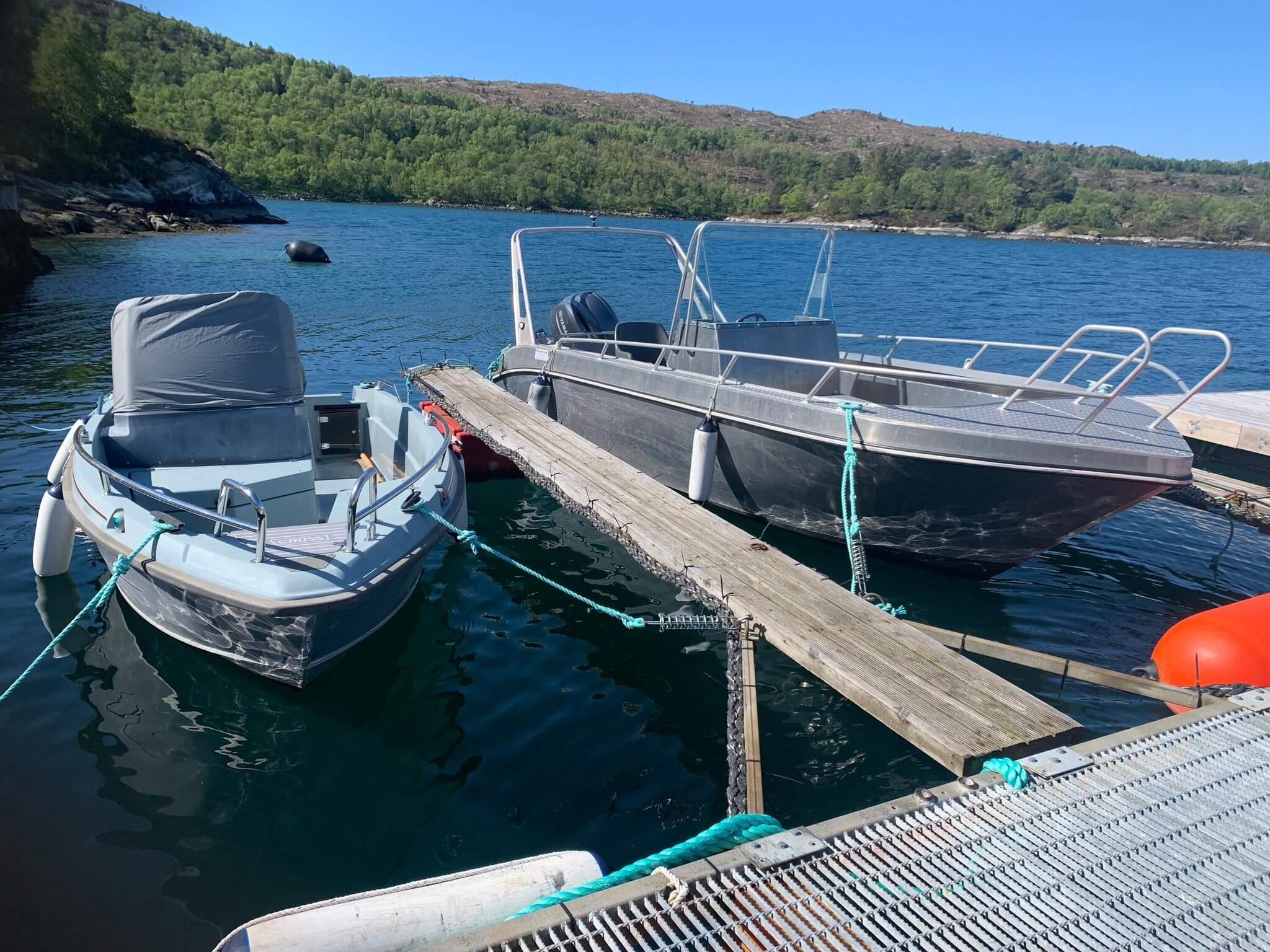 Båten ligger ved flytebrygge 90 m fra feriehuset.