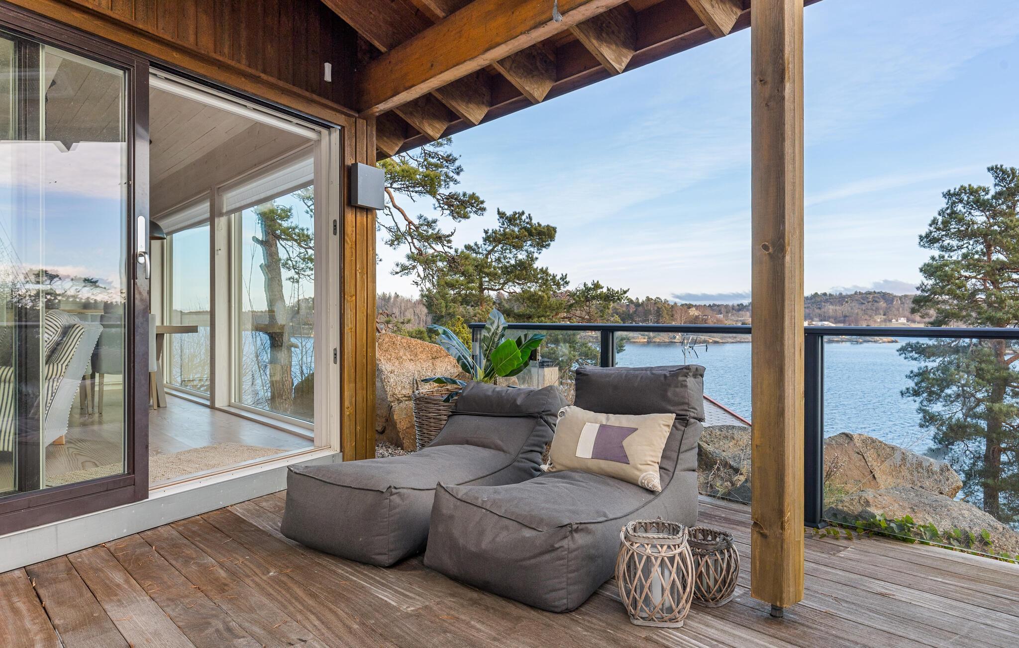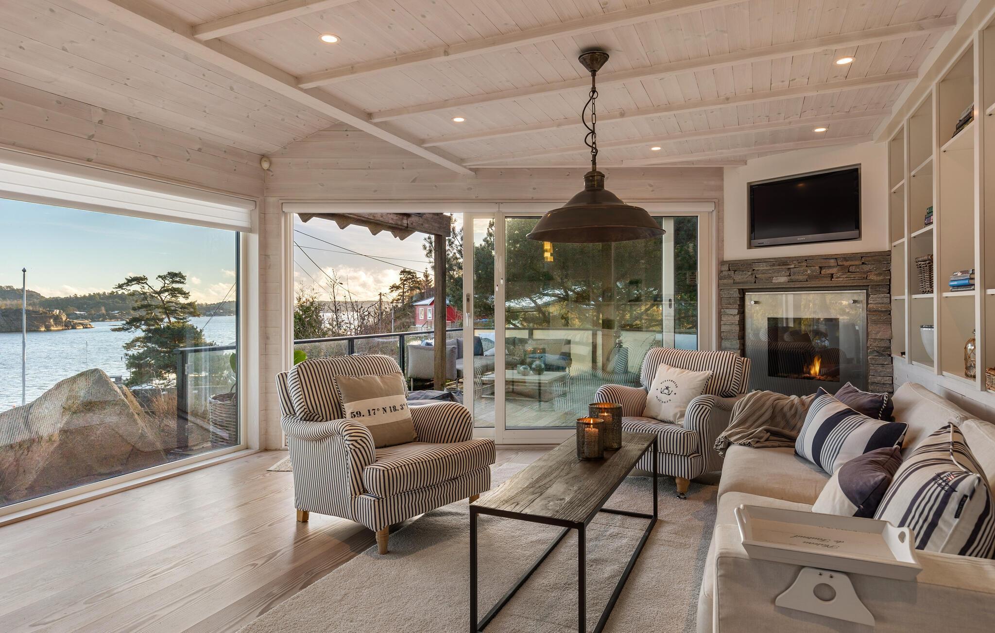 Glæd jer til den betagende havudsigt fra jeres sommerhus i Sandefjord på Vesterøya. Feriehuset kombinerer skandinavisk elegance med moderne komfort. Den åbne opholdsstue er oversvømmet af lys og stilfuldt indrettet takket være de store vinduesfronter. Begynd dagen her afslappet med en overdådig morgenmad og tilbring hyggelige aftener ved pejsen.