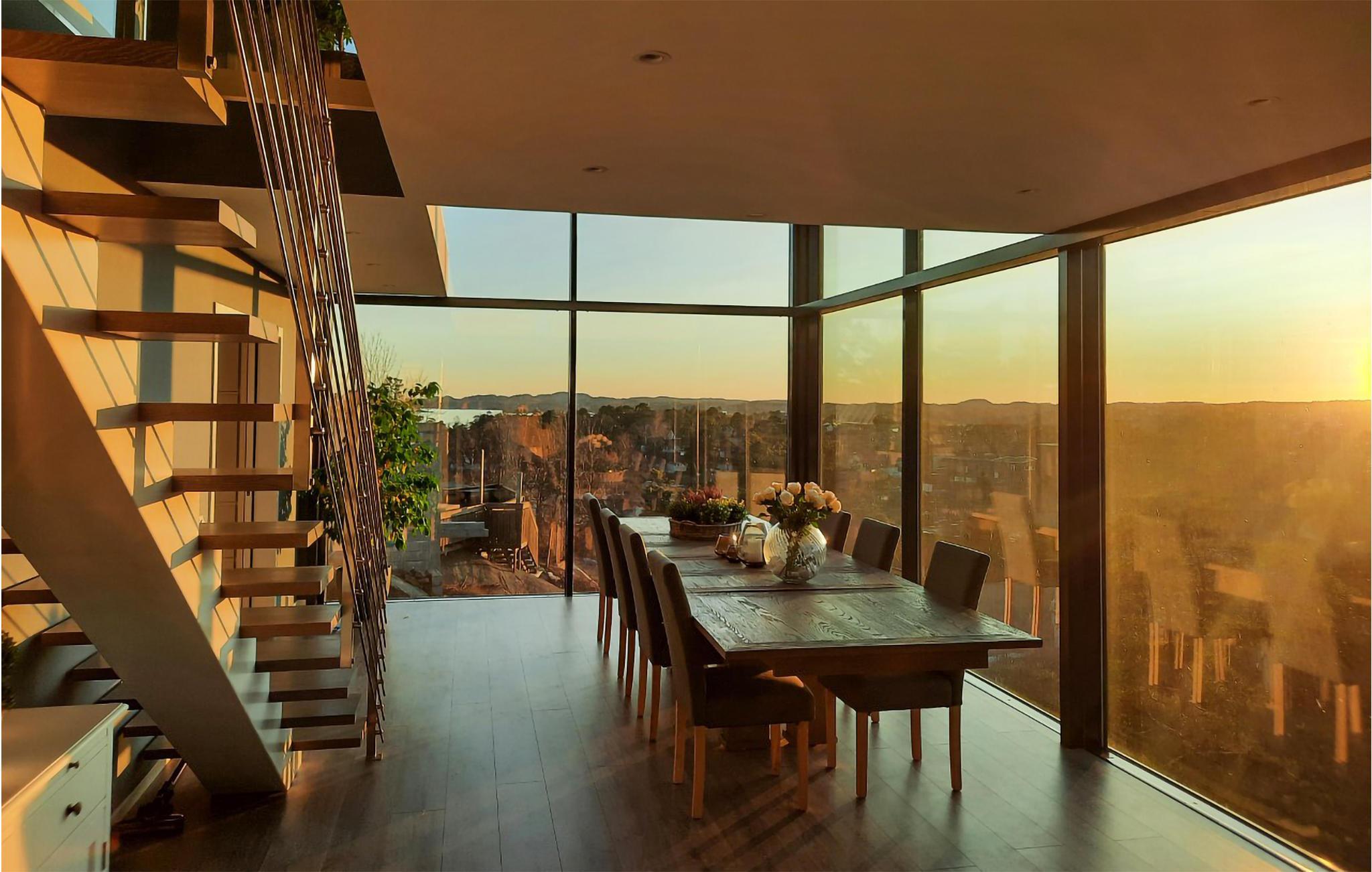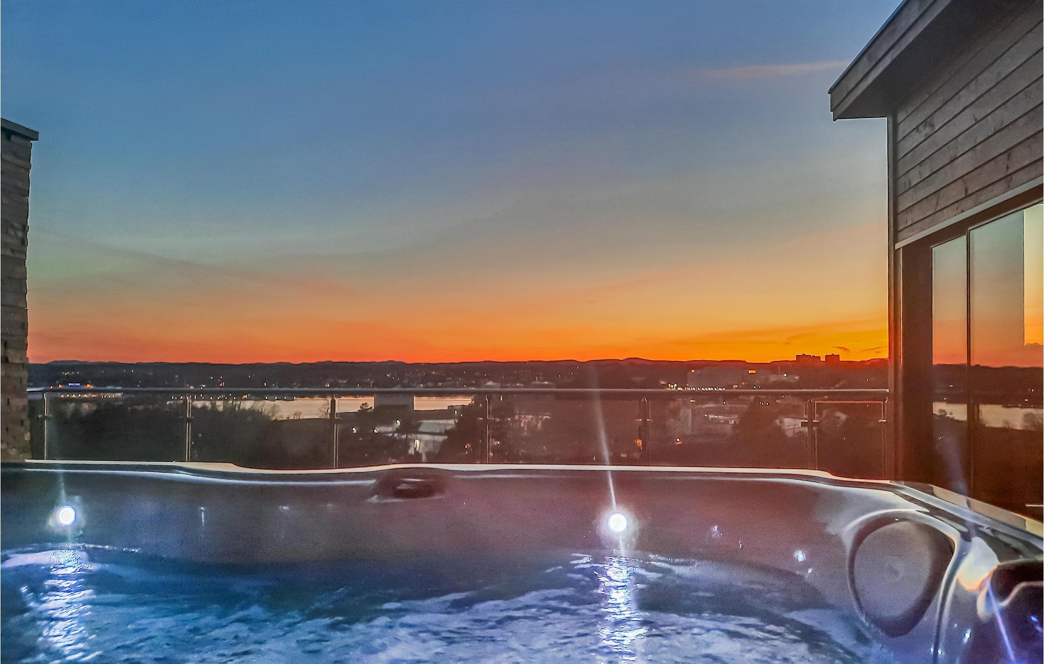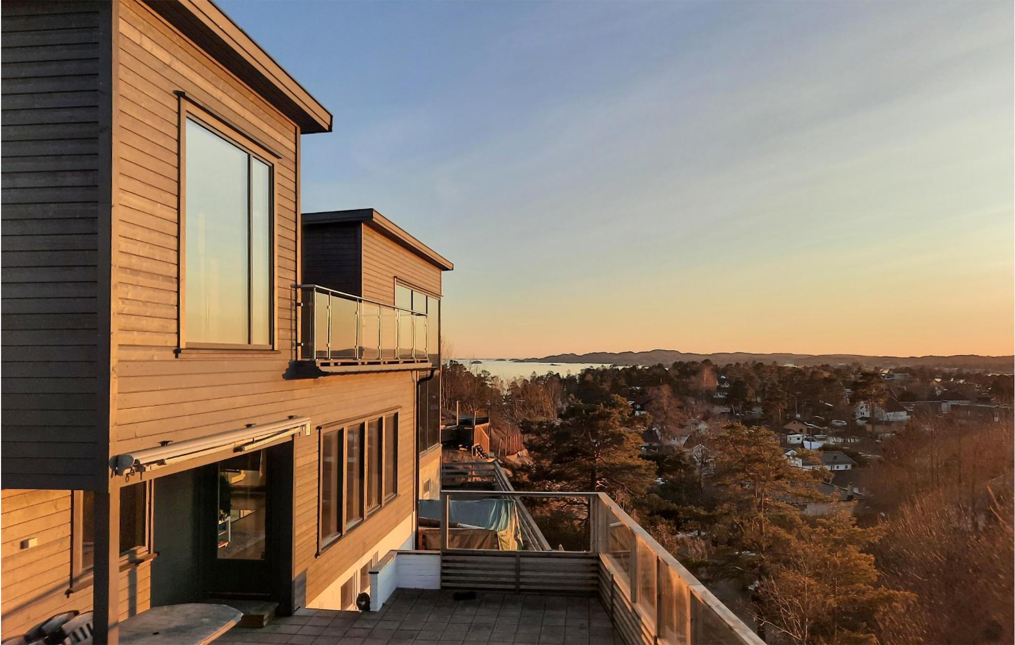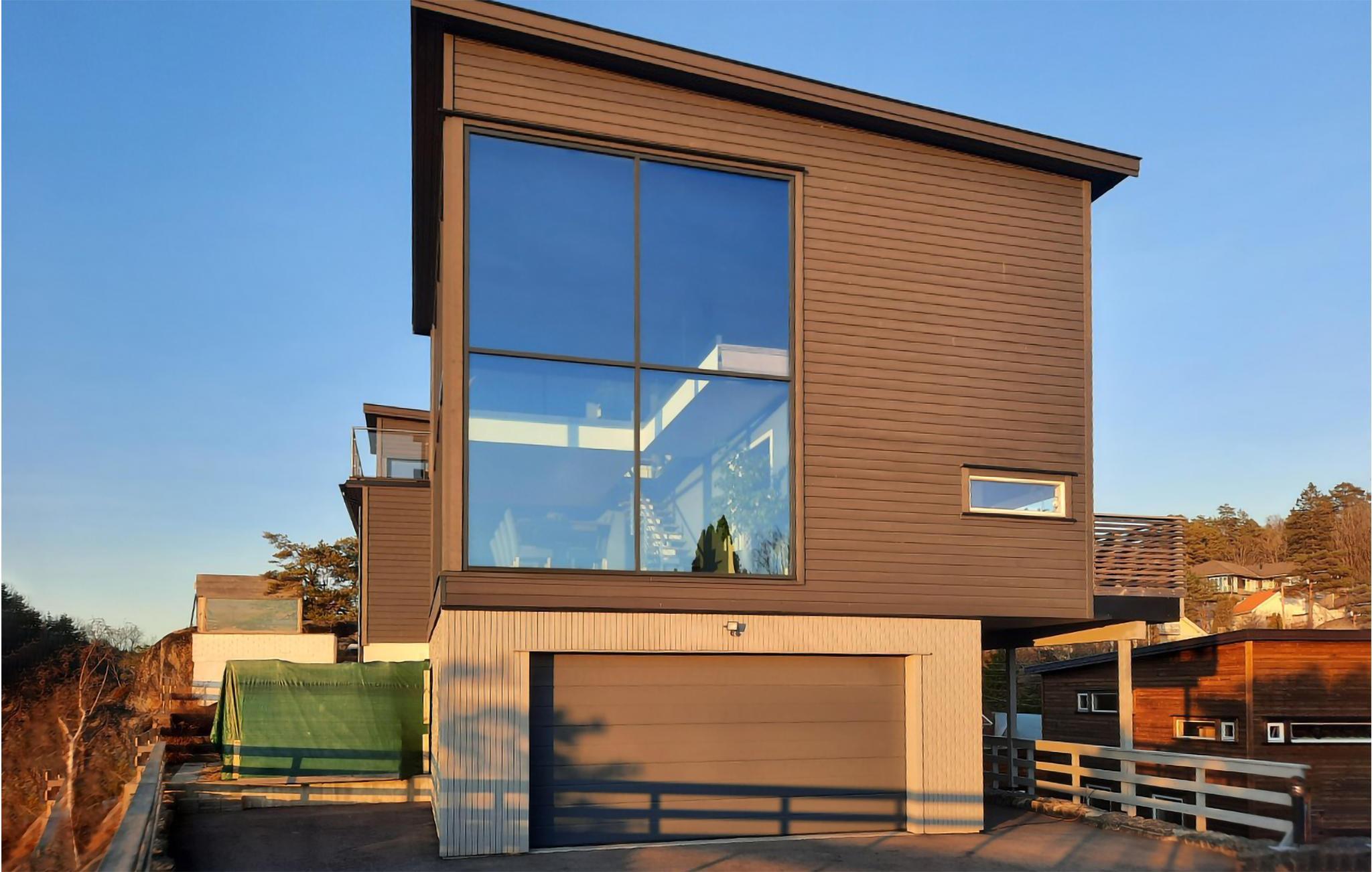 Dette store og rummelige feriehus byder jer velkommen på Vesterøy-halvøen, uden for Sandfjord. Det moderne hus strækker sig over flere etager og er bygget ind i en klippe. Store vinduesfronter giver jer en fantastisk udsigt over landskabet, byen og vandet i næsten alle rum. Nyd indretningen af ??høj kvalitet og kvaliteten af ??udstyret, som bidrager til husets atmosfære. At slappe af i sofaen og spise eller lege ved spisebordet bliver en oplevelse på grund af udsigten. Til jeres personlige wellness-program er der et spabad til rådighed, som lader jer glemme jeres daglige bekymringer.