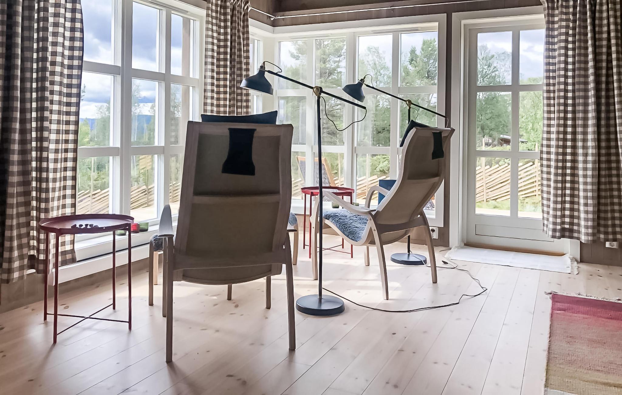 Huset er smukt dekoreret med delikate farvevalg, der indbyder til en stille og afslappende ferie i bjergene. Rundt spisebordet kan du nyde morgenmaden og lade solen skinne ind fra det store vindue ved spisepladsen.