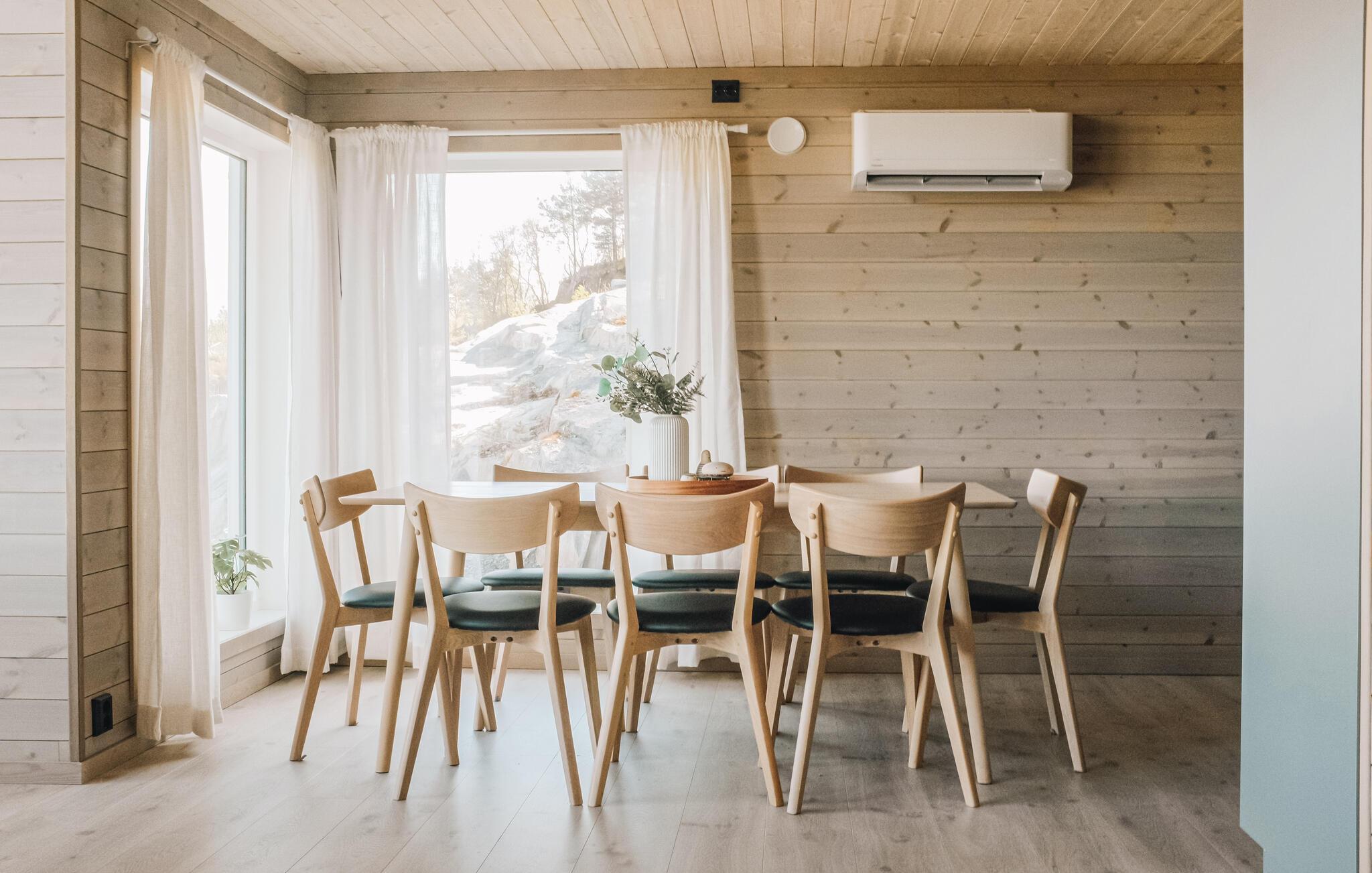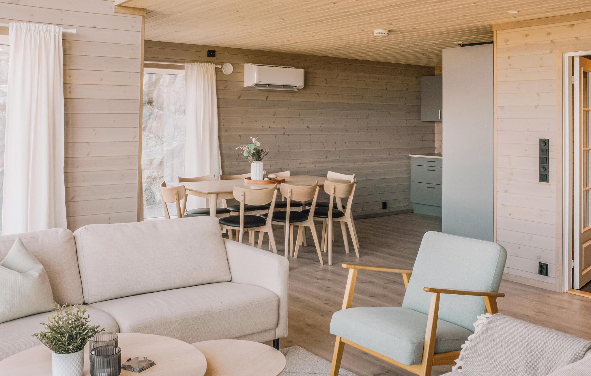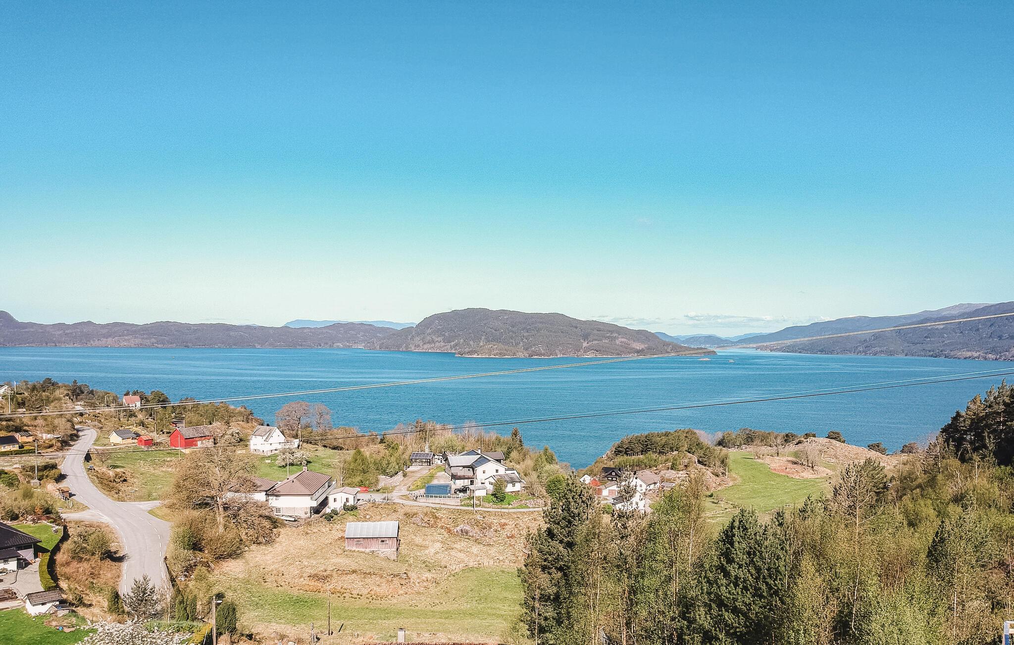 Velkommen til denne lyse og dejlige feriebolig, der ligger lige i et roligt område lige uden for Skånevik. Her er der plads nok til, at I kan tage den udvidede familie med på ferien. Der er lagt op til mange timers hyggeligt samvær med madlavning, fællesspisning og brætspil. I stuen er der nogle skønne gulv til loft-panoramavinduer, der bringer naturen ind og lyser boligen op. I lade blikket vandre ud over Skåneviksfjorden, mens I slapper af i sofaerne eller nyder et lækkert måltid ved bordet.