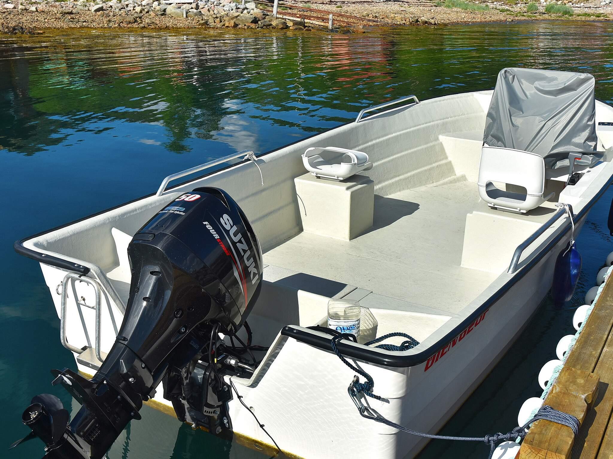 I og med at det er flere feriehus som tilbyr disse båtene, bestill båt/båter samtidig med at du bestiller feriehuset. Be om bekreftelse, slik at du får bestilt den båten/ene du ønsker å leie. Flytevester er inkludert i leien av båtene. Området har de beste fiskemulighetene i Norge, enten skjermet bak holmer og skjær på yttersiden eller inne i fjorden. Båførerbevis er påbudt for alle som er født etter 1980, dersom motoren er større enn 25 HK. Egen tilberedningsplass for fisk under tak ved et uthus like ved feriehuset, hvor du også kan oppbevare fiskeutstyr.