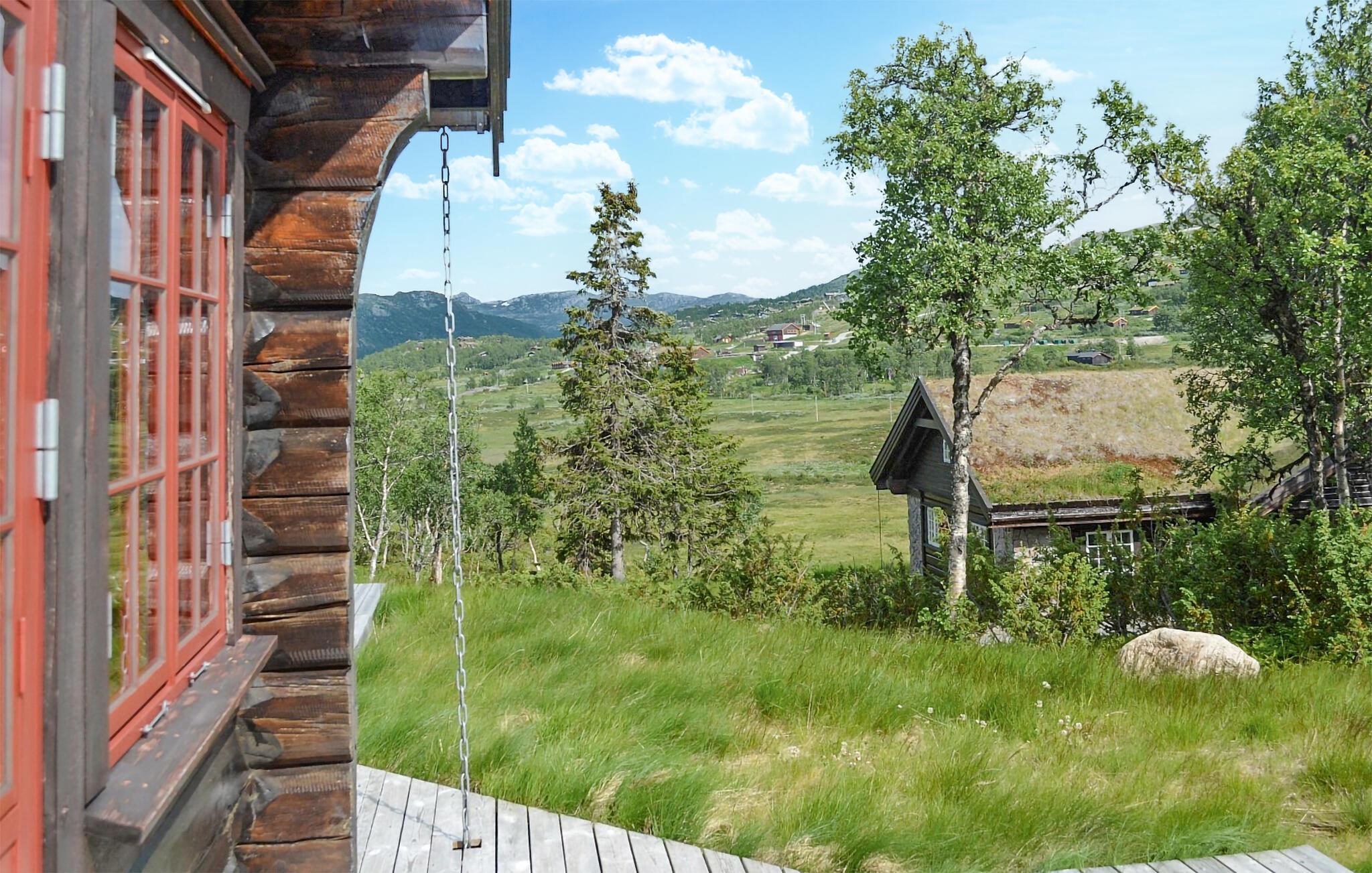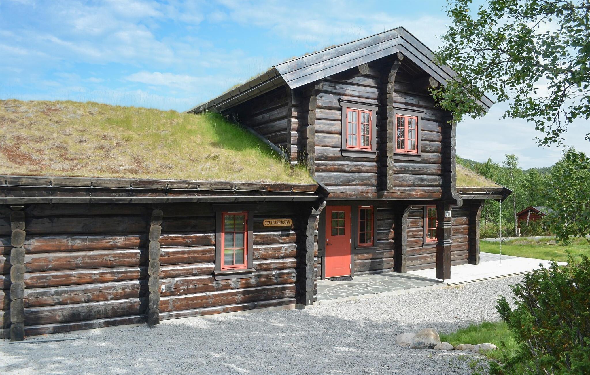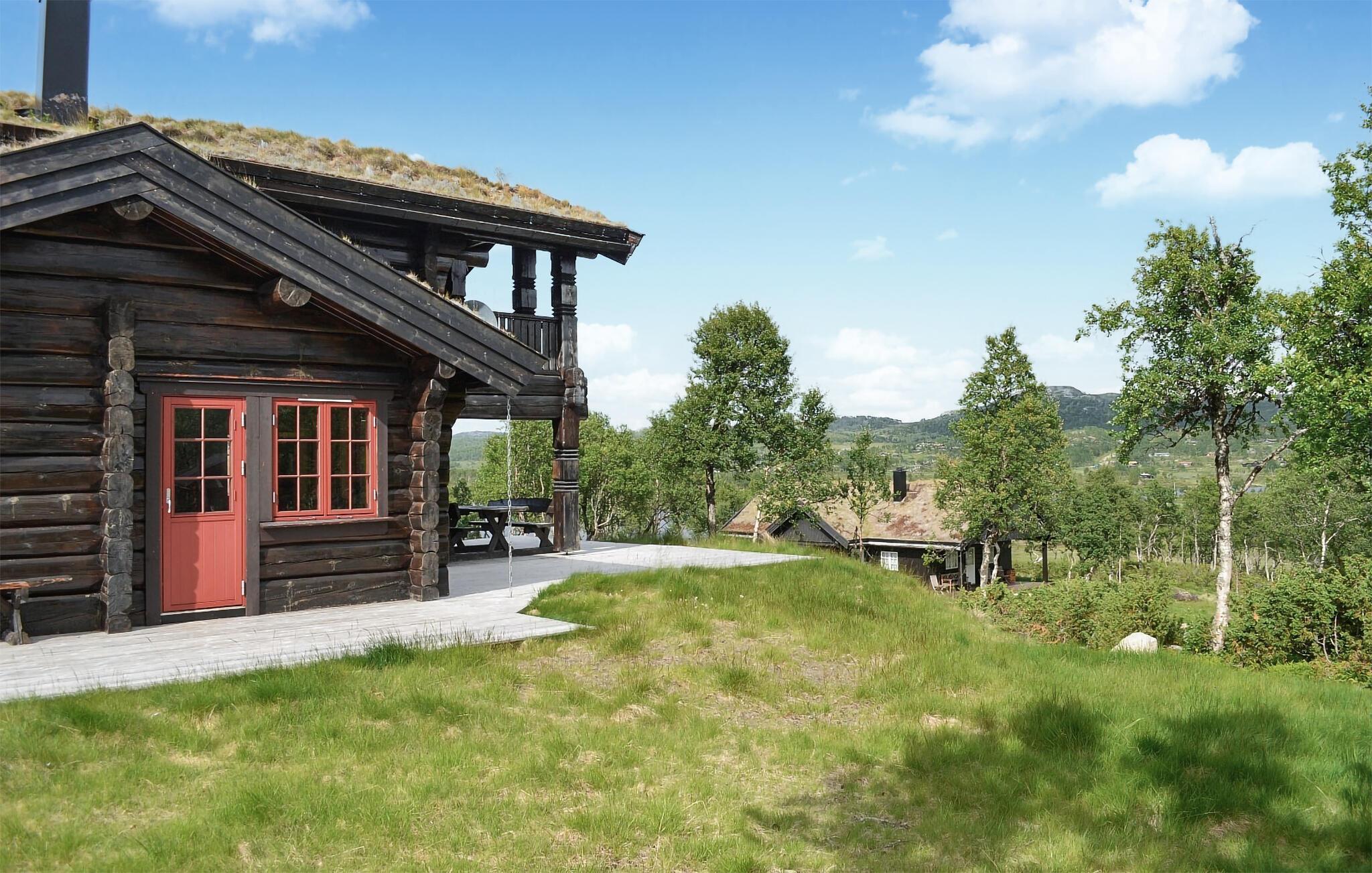 Denne imponerende bjælkehytte kombinerer rustik charme med moderne komfort og ligger i et idyllisk landskab på kanten af ??Hardangervidda, et af de største højsletter i Europa. Feriehuset emmer af en hyggelig atmosfære takket være den traditionelle konstruktion med tykke træbjælker og græstag. Indenfor finder I lyse, rummelige opholdsarealer, der lægger op til gode hyggestunder. Sofaerne arrangeret i forskellige stuer giver den optimale plads til afslappende aftener efter en dag med eventyr. Vinduerne giver et bredt udsyn til den omkringliggende natur. Lav mad sammen i det moderne køkken og nyd jeres måltider med udsigt over bjergene.