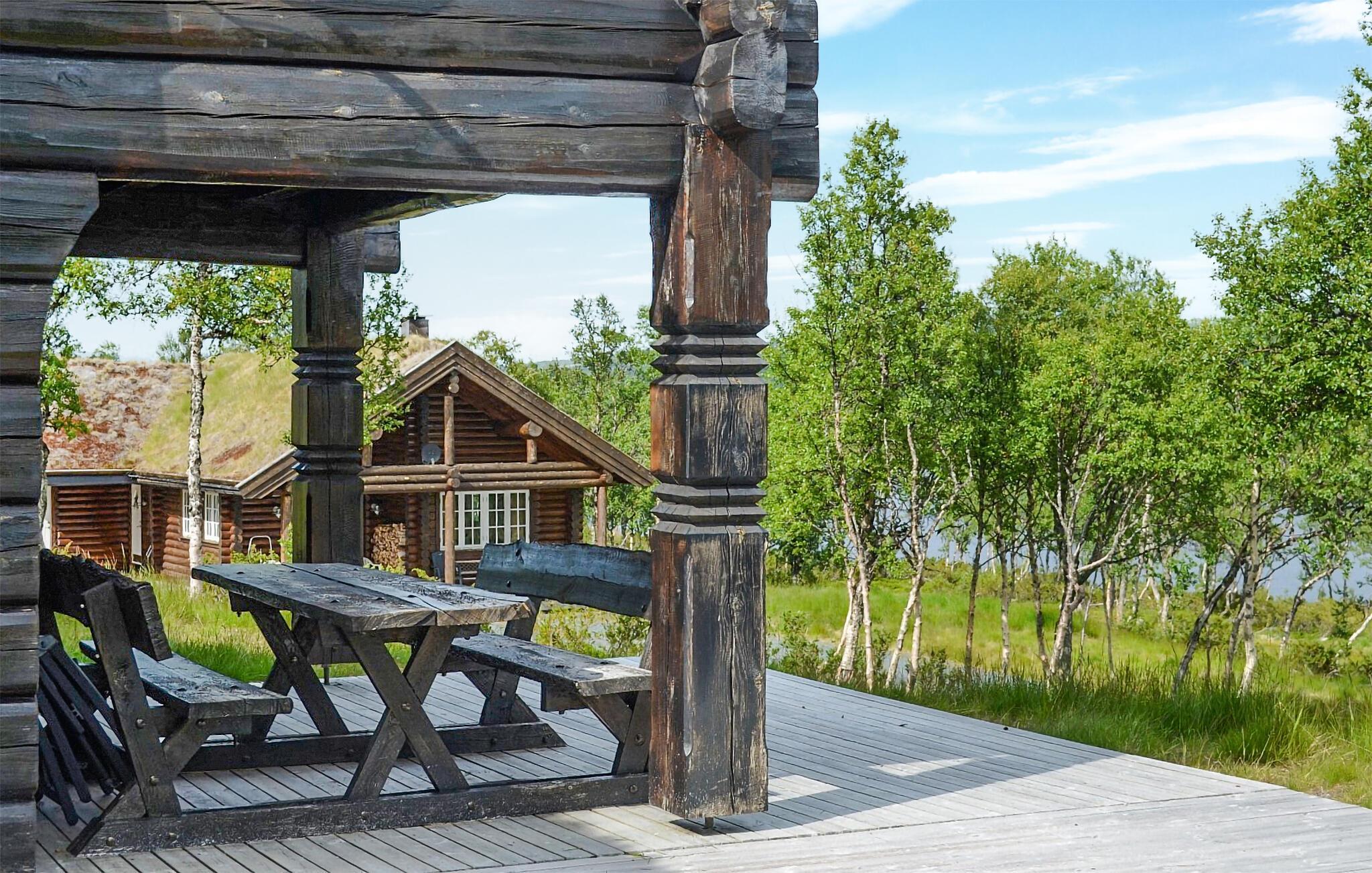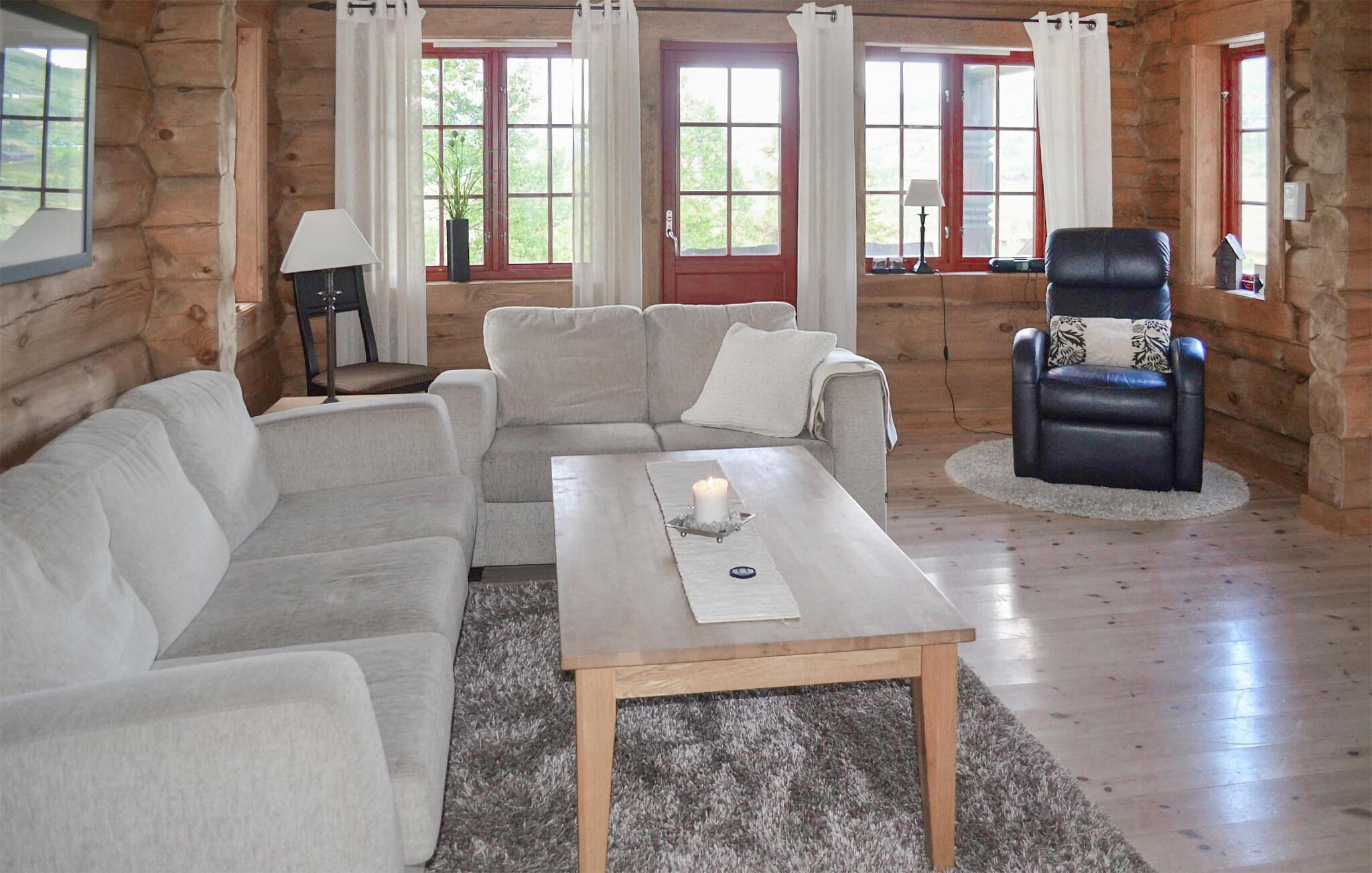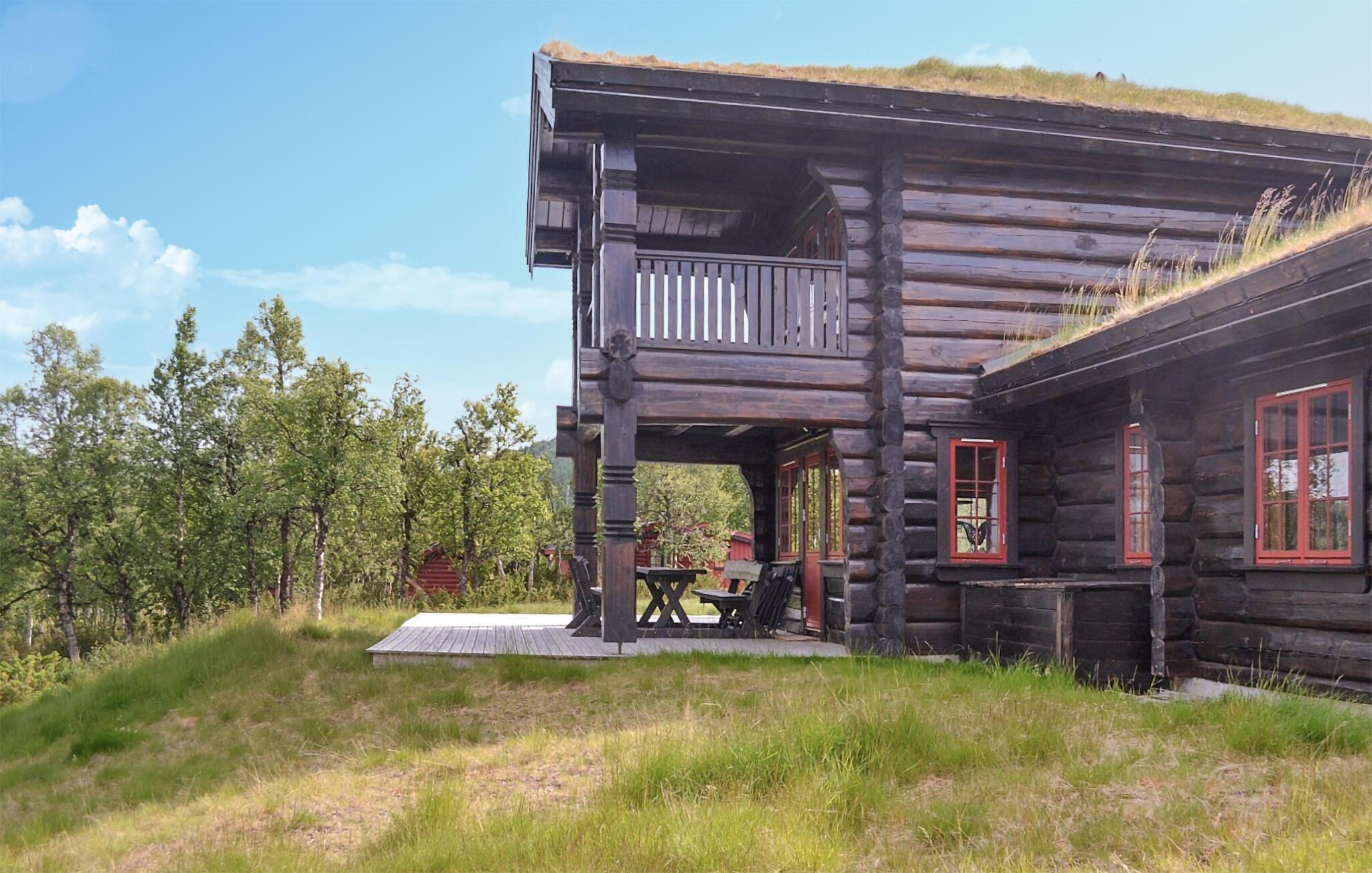 Denne imponerende bjælkehytte kombinerer rustik charme med moderne komfort og ligger i et idyllisk landskab på kanten af ??Hardangervidda, et af de største højsletter i Europa. Feriehuset emmer af en hyggelig atmosfære takket være den traditionelle konstruktion med tykke træbjælker og græstag. Indenfor finder I lyse, rummelige opholdsarealer, der lægger op til gode hyggestunder. Sofaerne arrangeret i forskellige stuer giver den optimale plads til afslappende aftener efter en dag med eventyr. Vinduerne giver et bredt udsyn til den omkringliggende natur. Lav mad sammen i det moderne køkken og nyd jeres måltider med udsigt over bjergene.