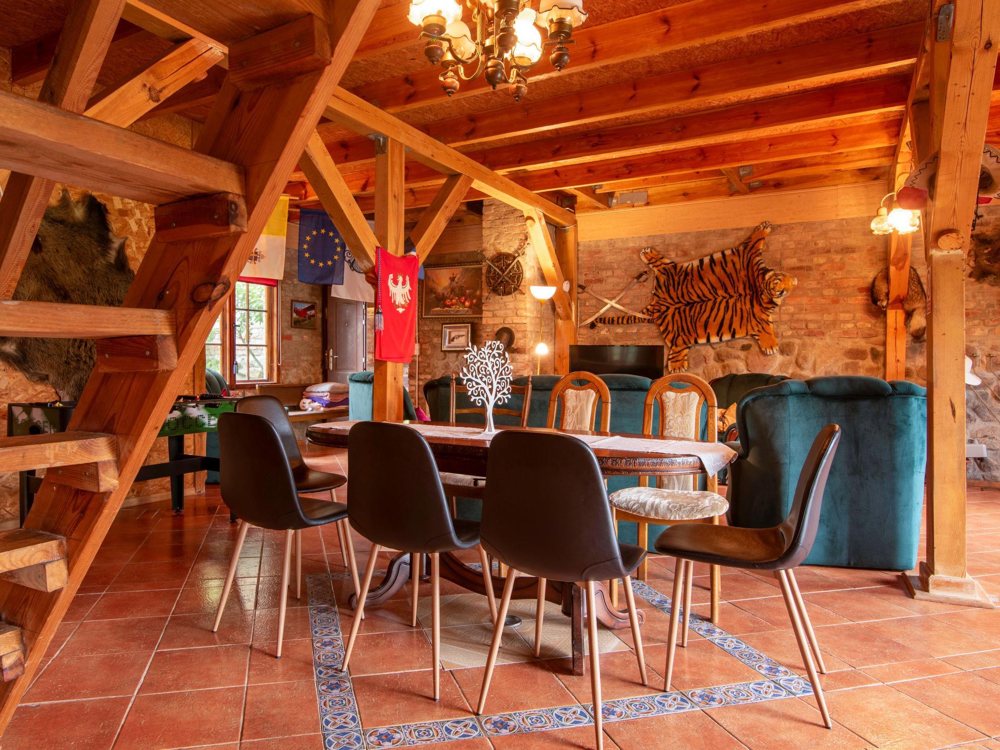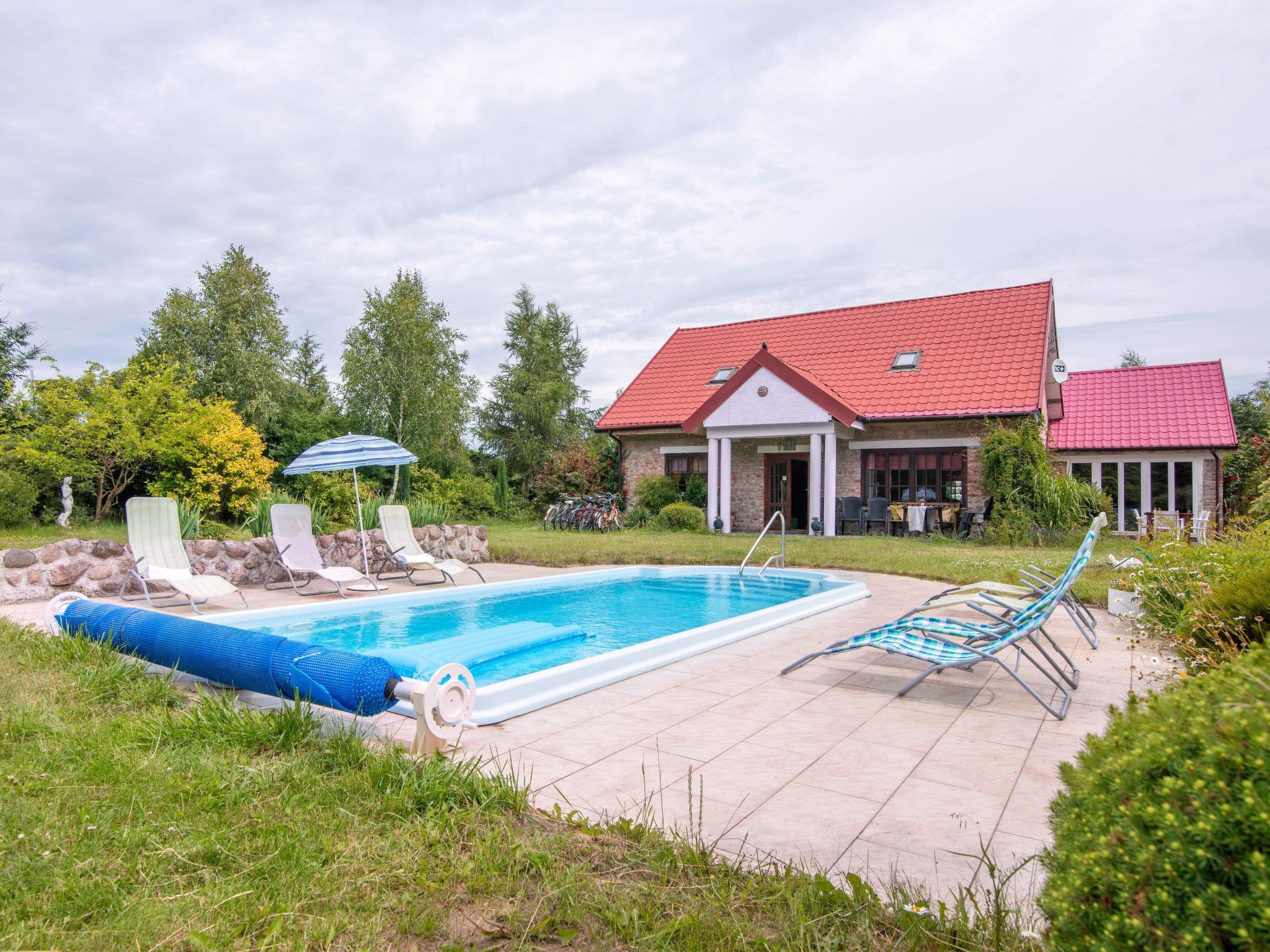 Anielino 9 km from Dobra: Single-family house "Angelino", built in 2007. 10 km from the lake, in the countryside. Private: property 5'000 m2 (fenced), garden 100 m2, meadow 1'000 m2, swimming pool (26 m2, depth 150 - 160 cm, seasonal availability: 01.May. - 30.Oct.). Tennis, volleyball, children's playground (swing). In the house: washing machine, tumble dryer. Available: bicycles (6), boat (extra). Parking on the premises. E-charging station. Shop 10 km, grocery 1.5 km, supermarket 10 km, restaurant 10 km, bus stop 1.5 km, pebble beach 10 km, rocky beach 10 km, indoor swimming pool 30 km, swimming bay 10 km, public bathing area 10 km. Riding stable 5 km. Nearby attractions: Miedzyzdroje 90 km. Well-known lakes can easily be reached: Dobre 10 km. Please note: The owner does not accept any youth groups. Fishing [permit required]. Animals in the neighbourhood. This property is a stylish stone and wood house and sometimes the floors creak (this is the beauty and advantage of this property). There is a key box by the entrance door (self-check-in possible).